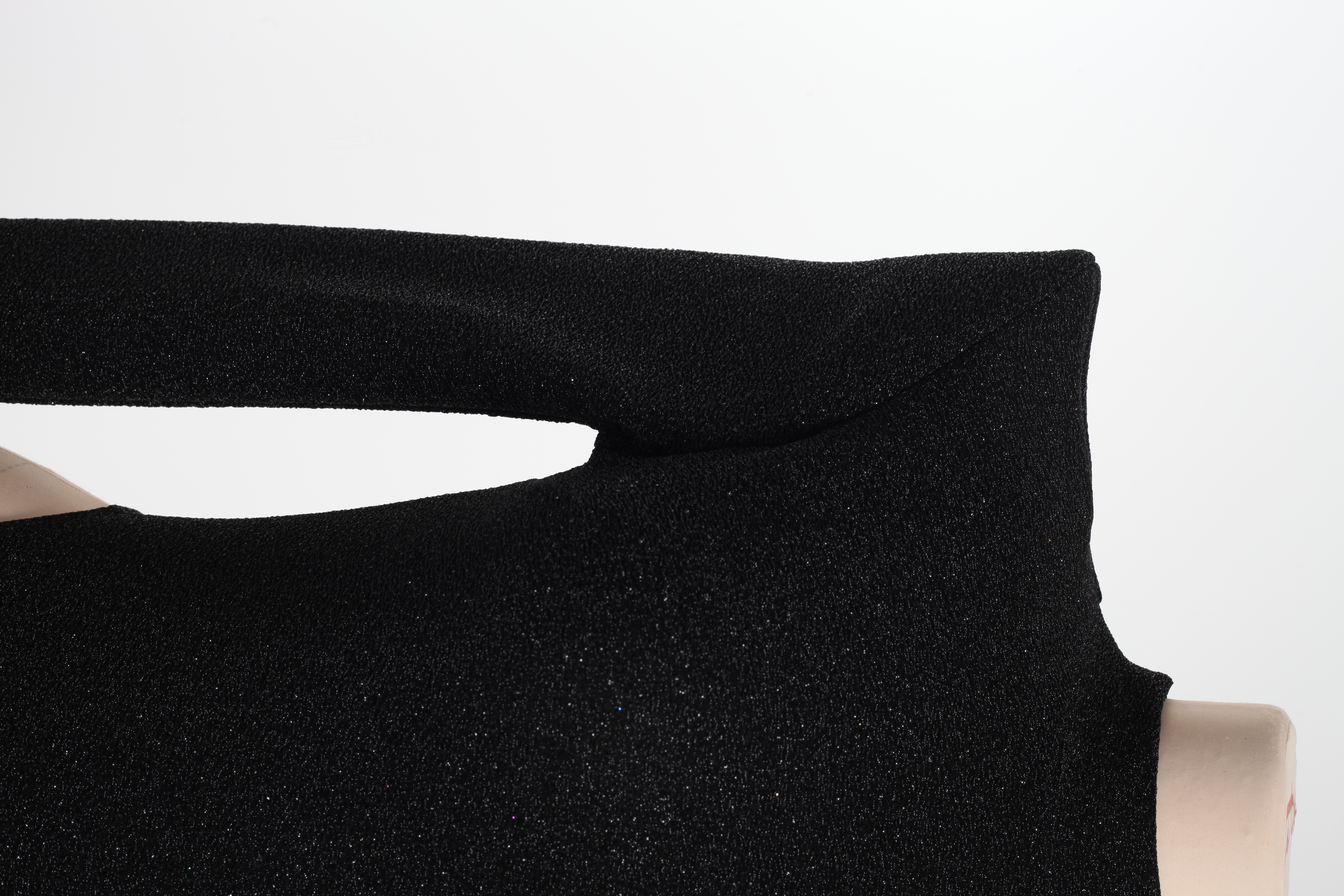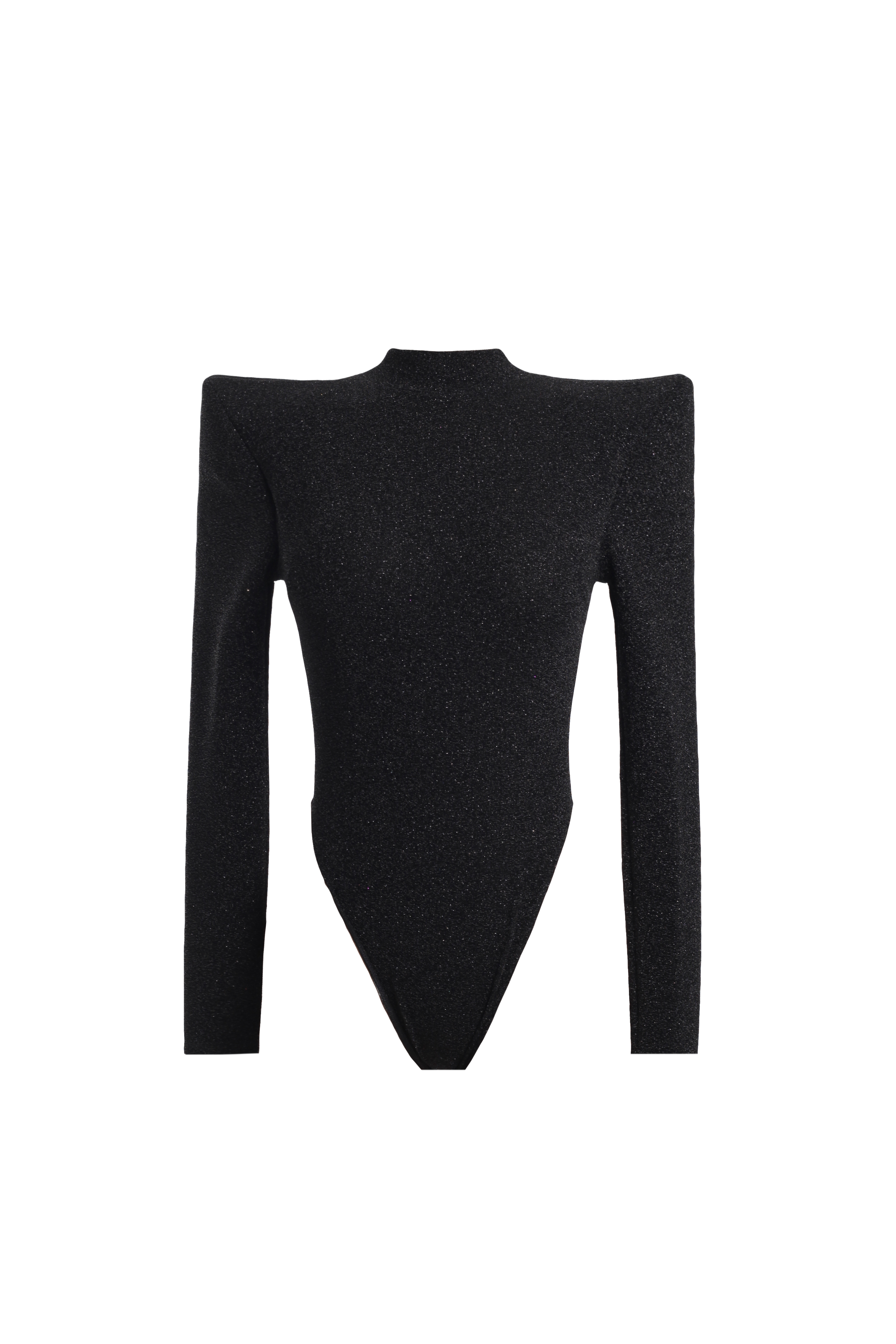 Боди черное из блестящей ткани с люрексовой нитью и акцентными плечами