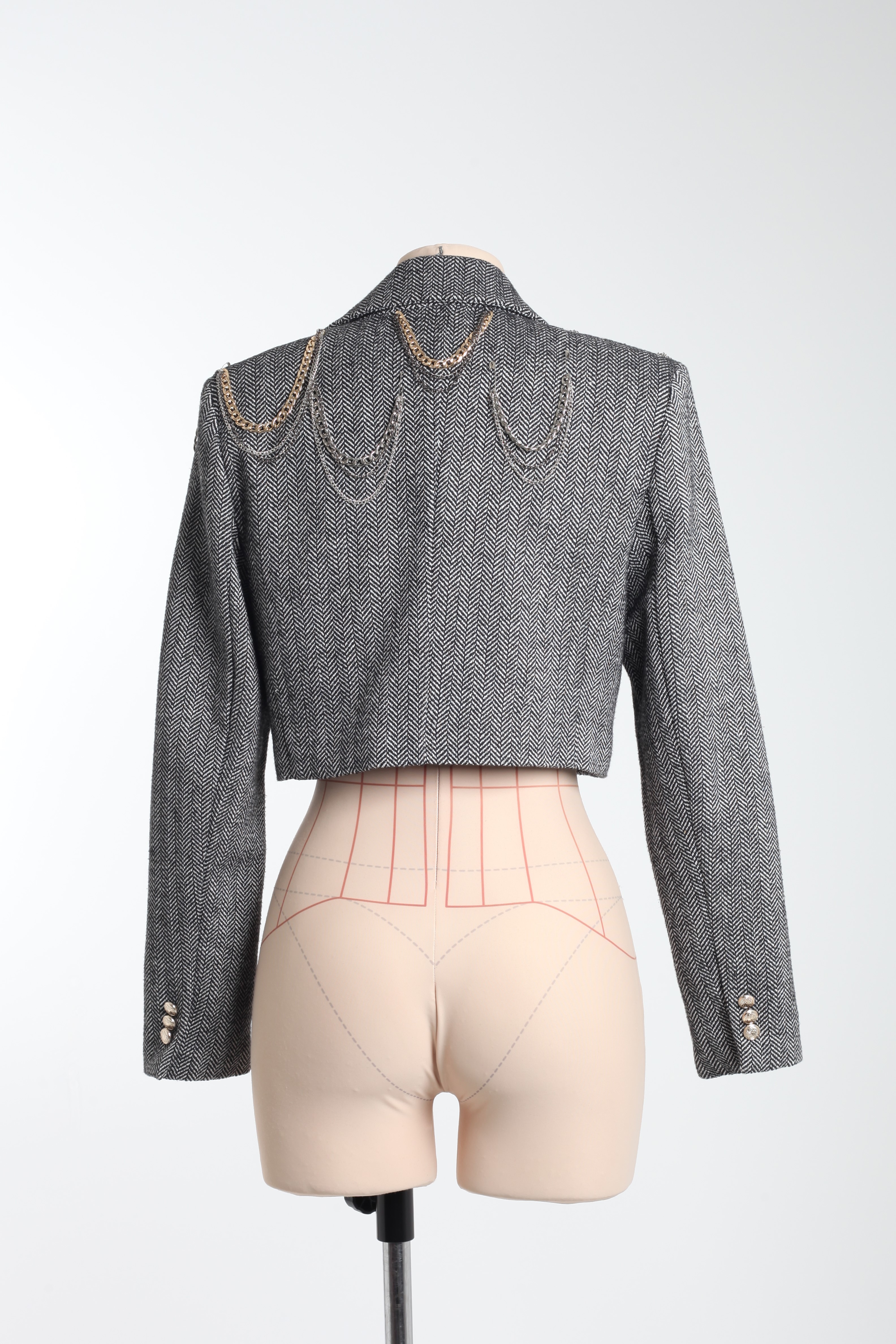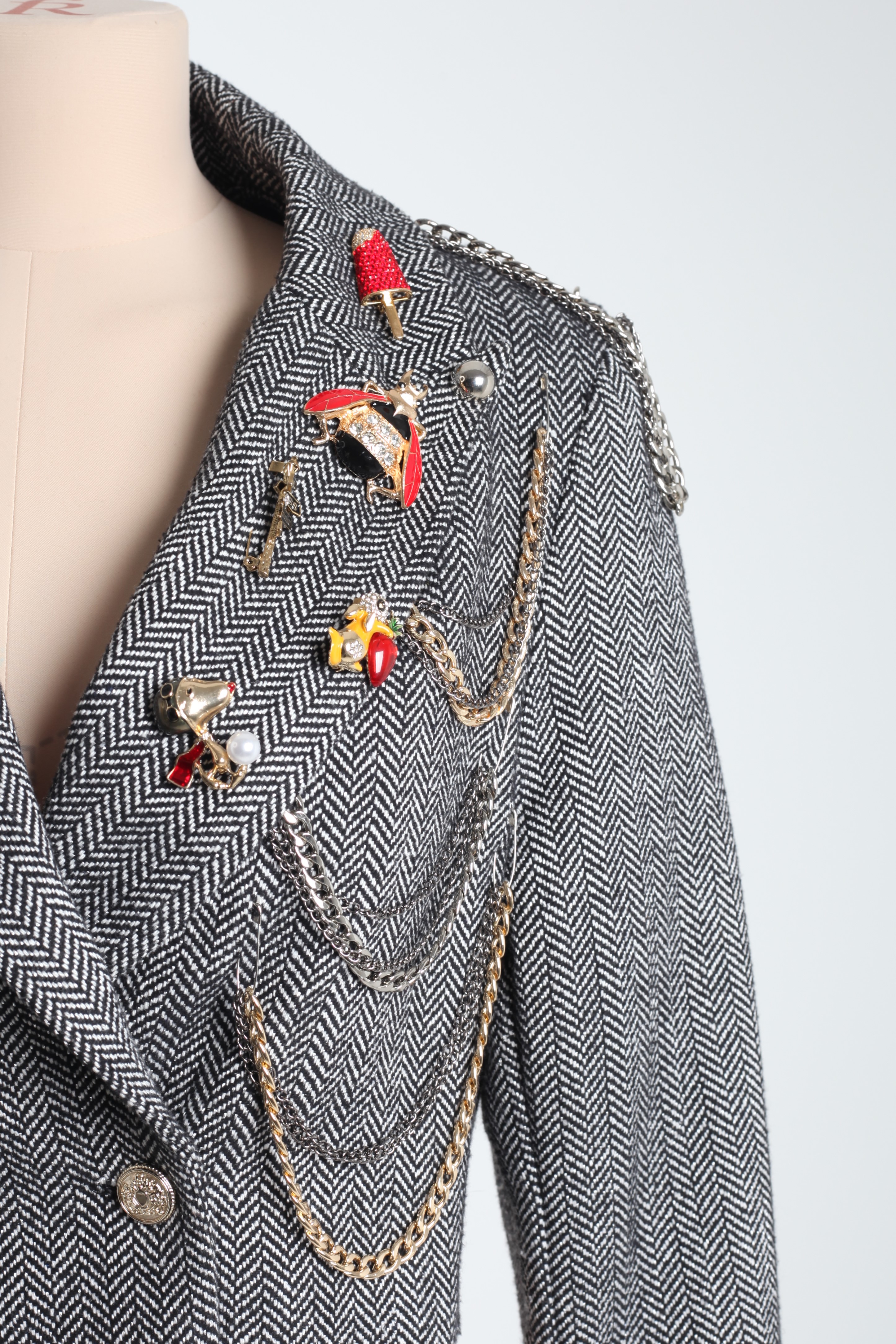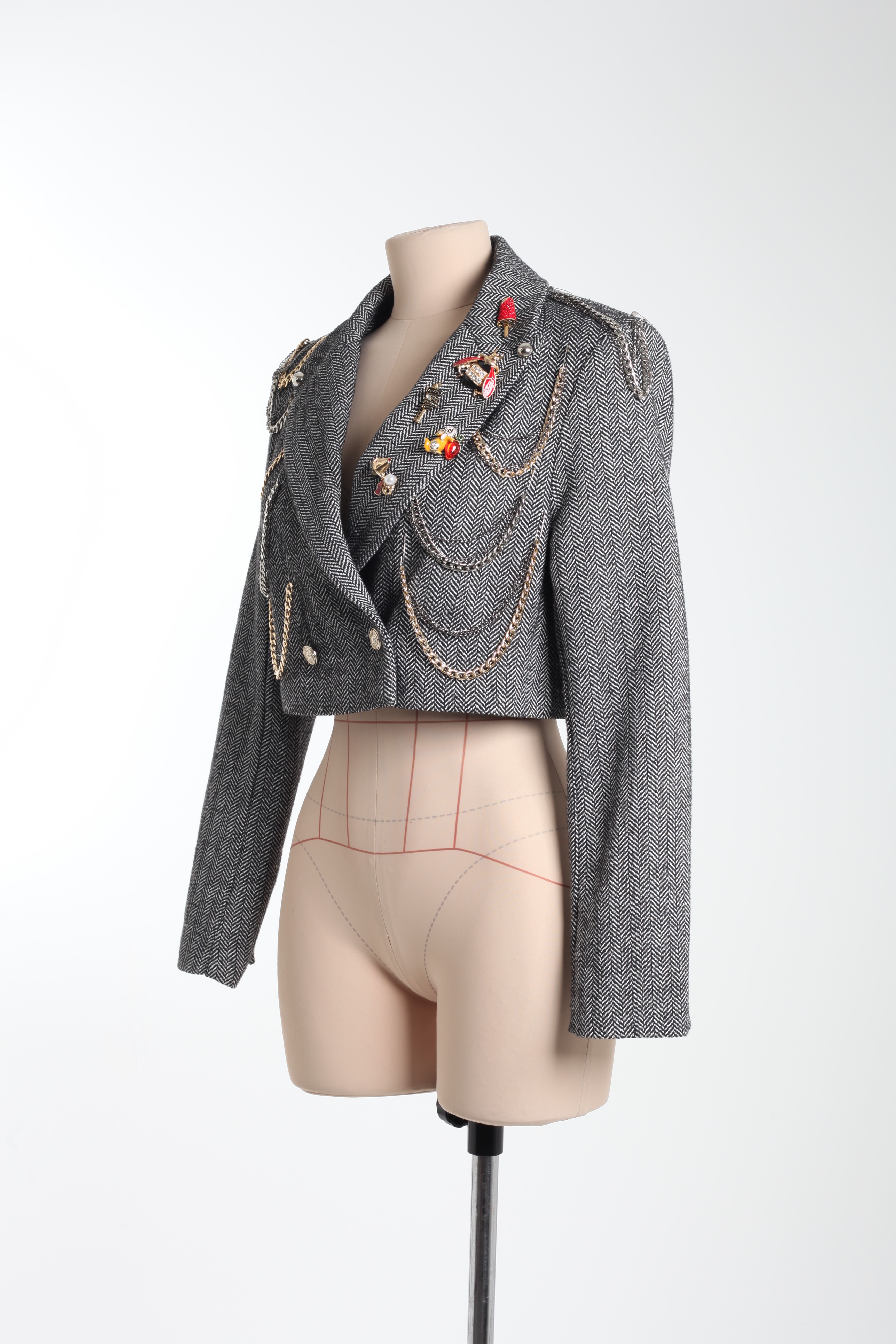 Жакет серый из костюмной ткани с цепями и значками