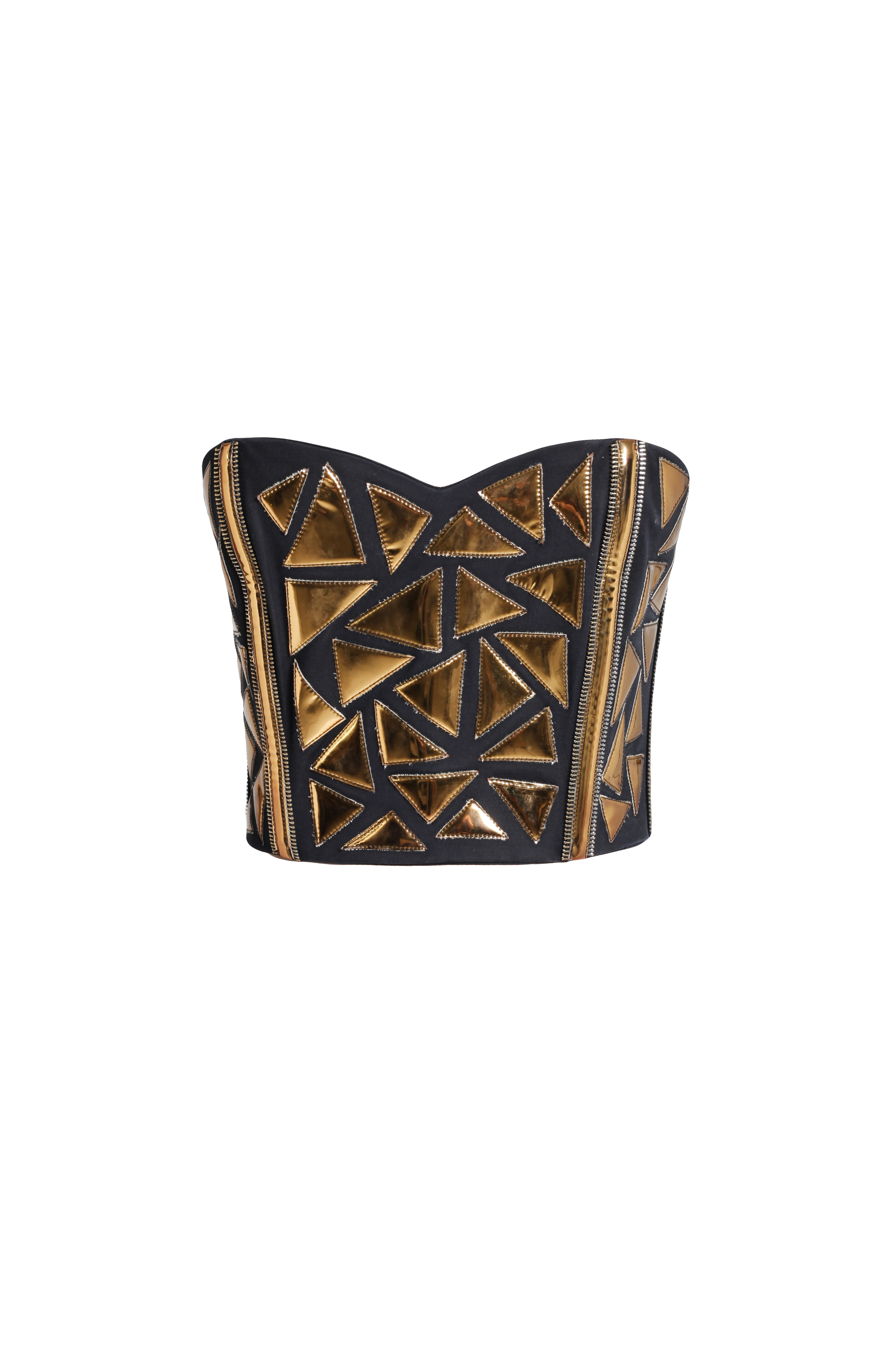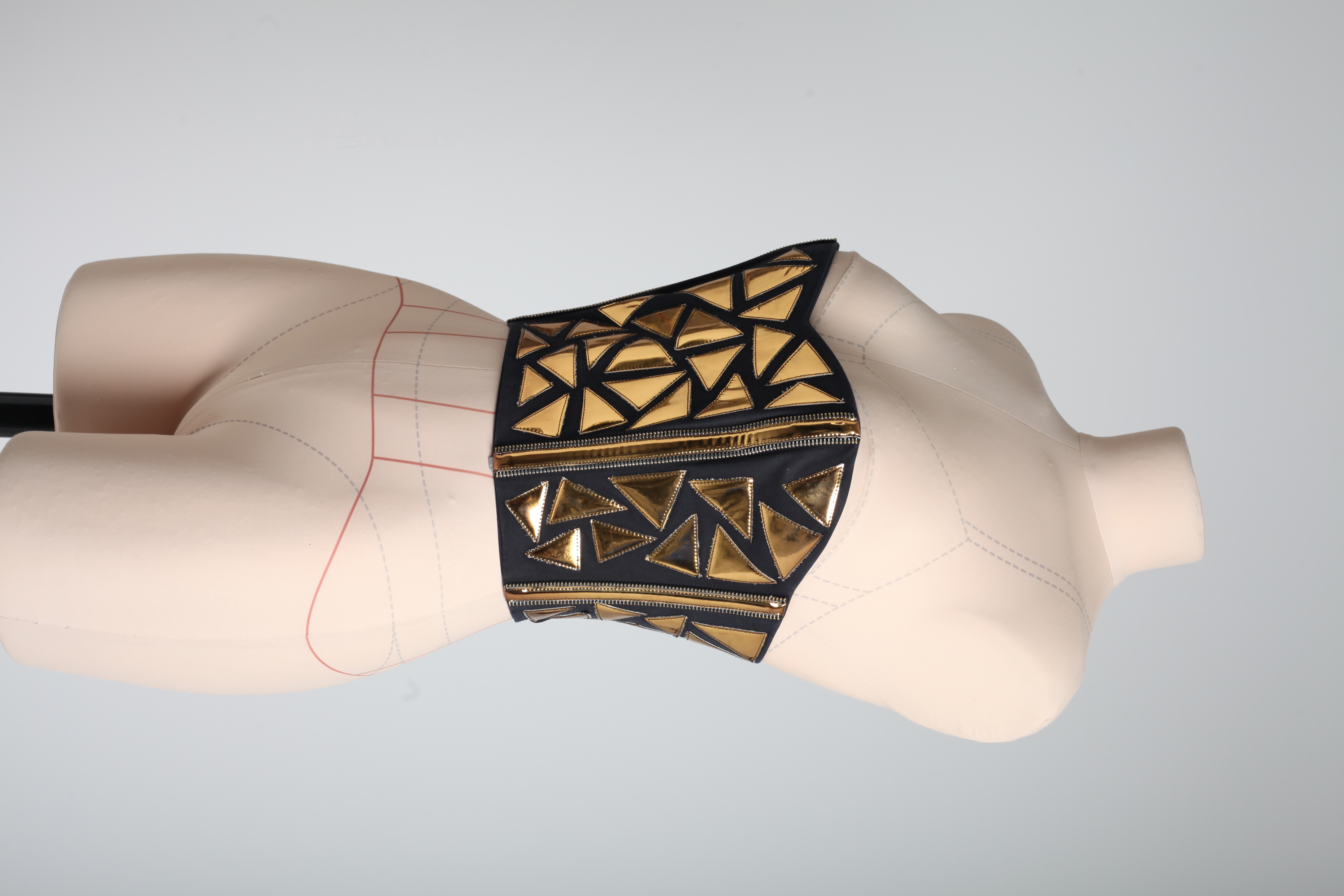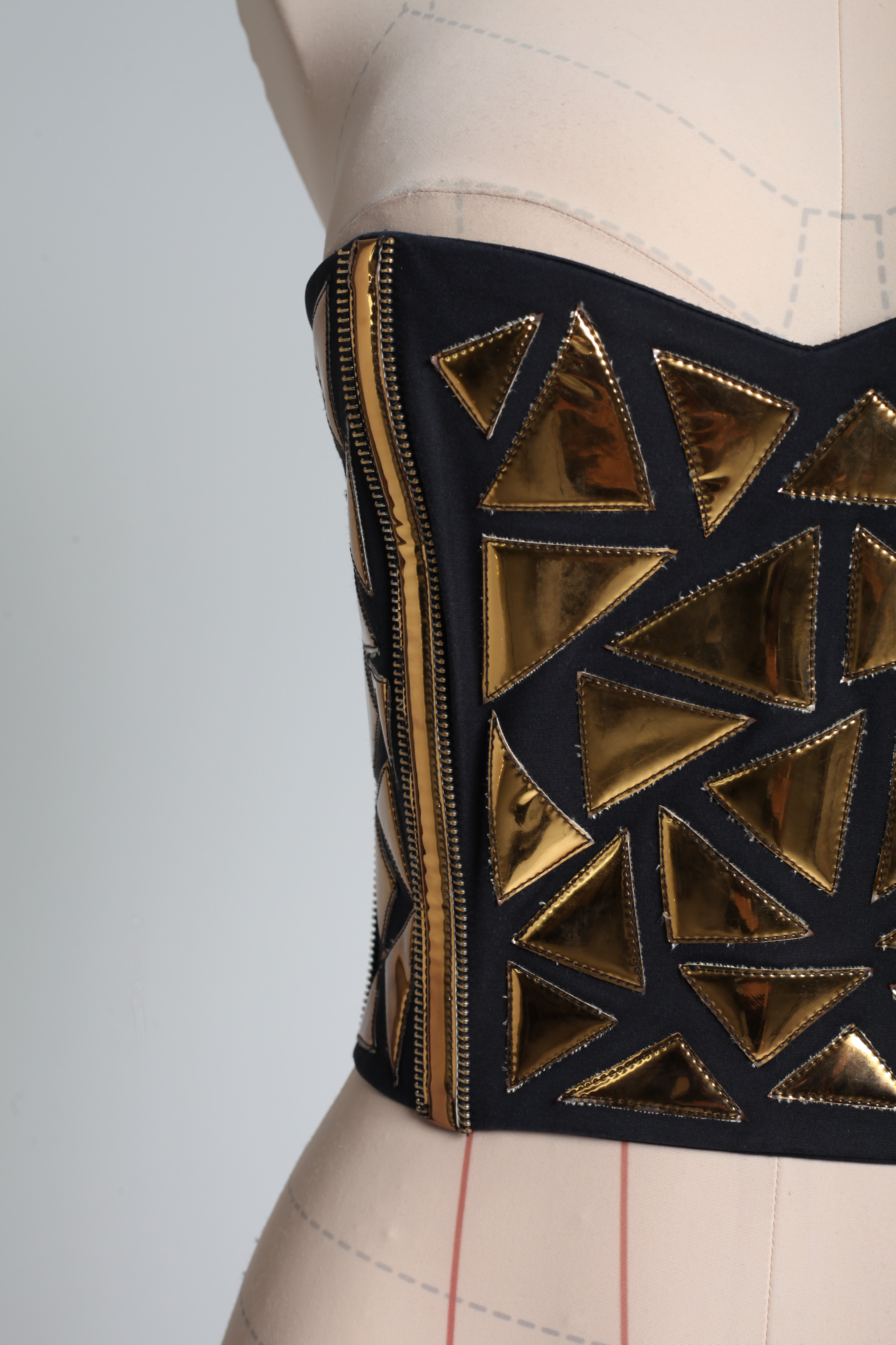 Классический укороченный до талии на шнуровке. Выполнен из черной костюмной ткани и расшит зеркальными элементами золотого цвета.
