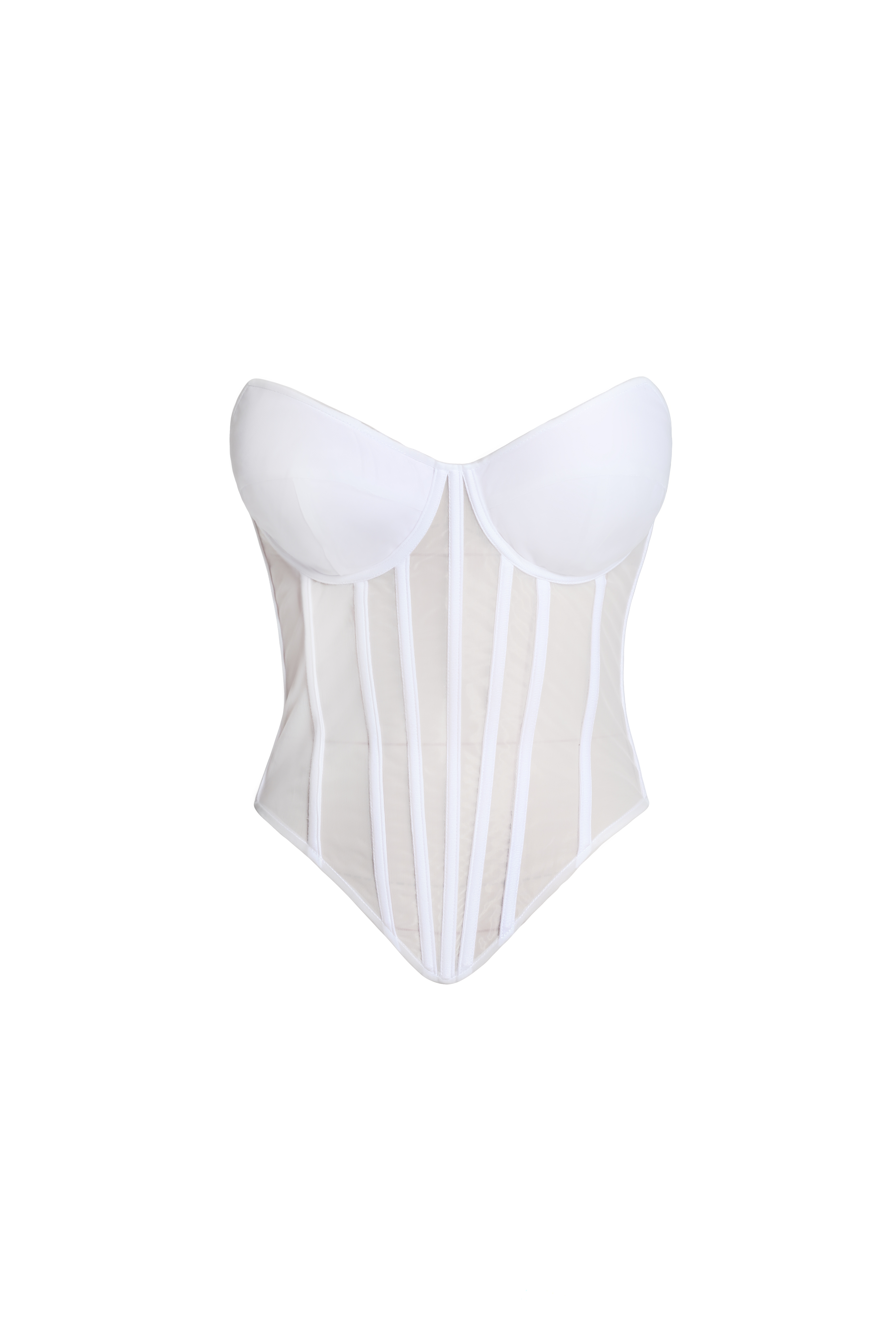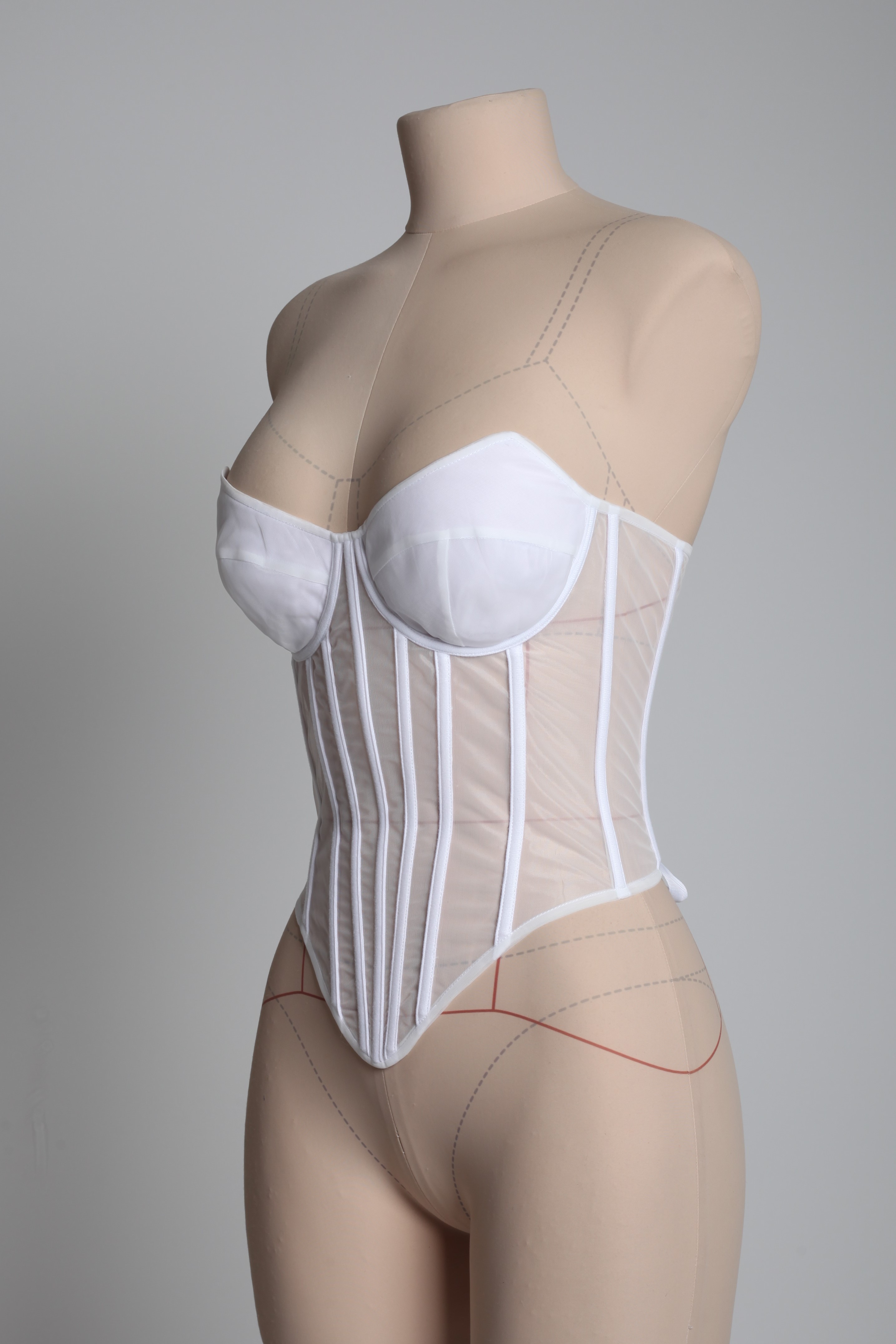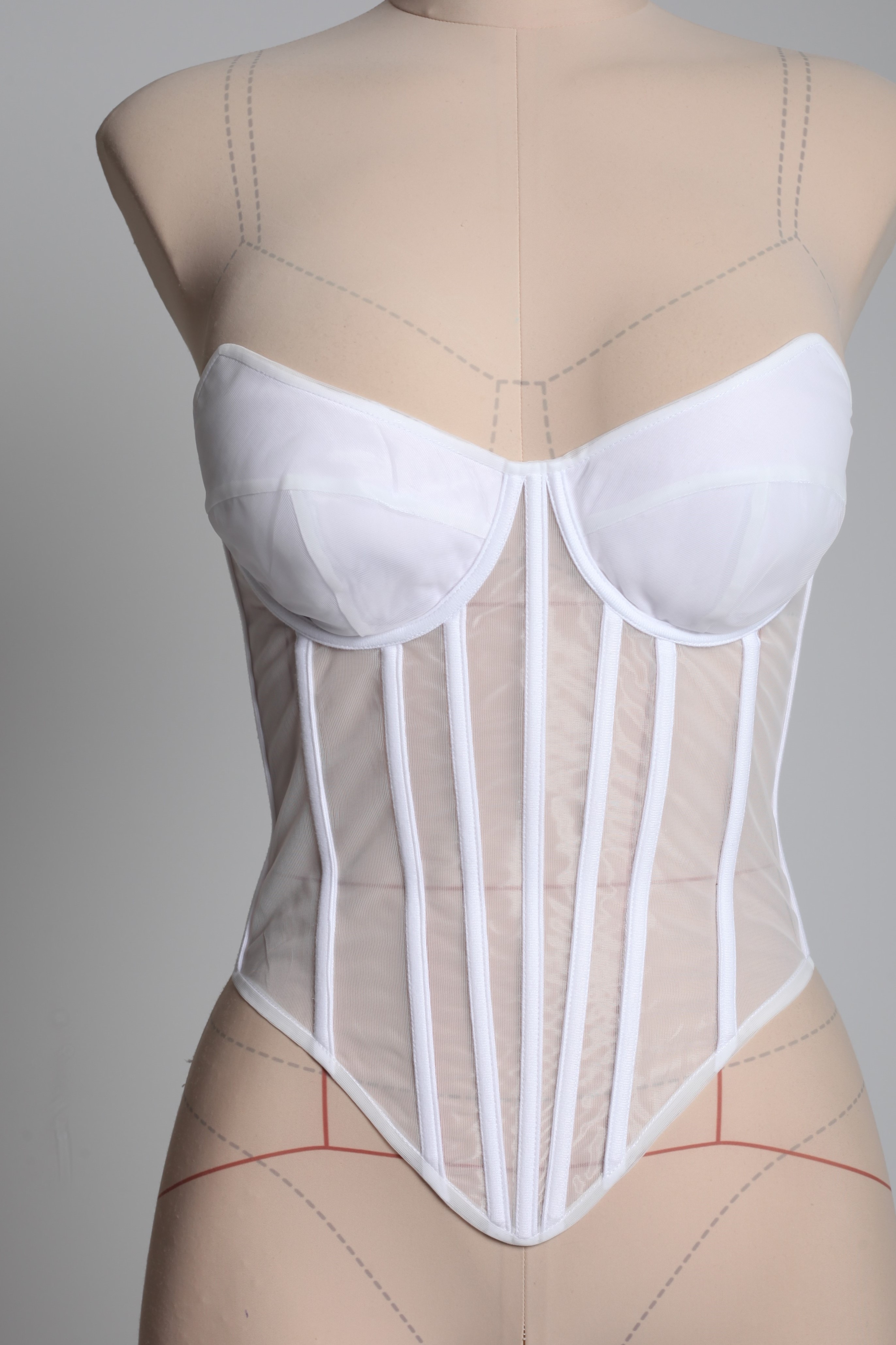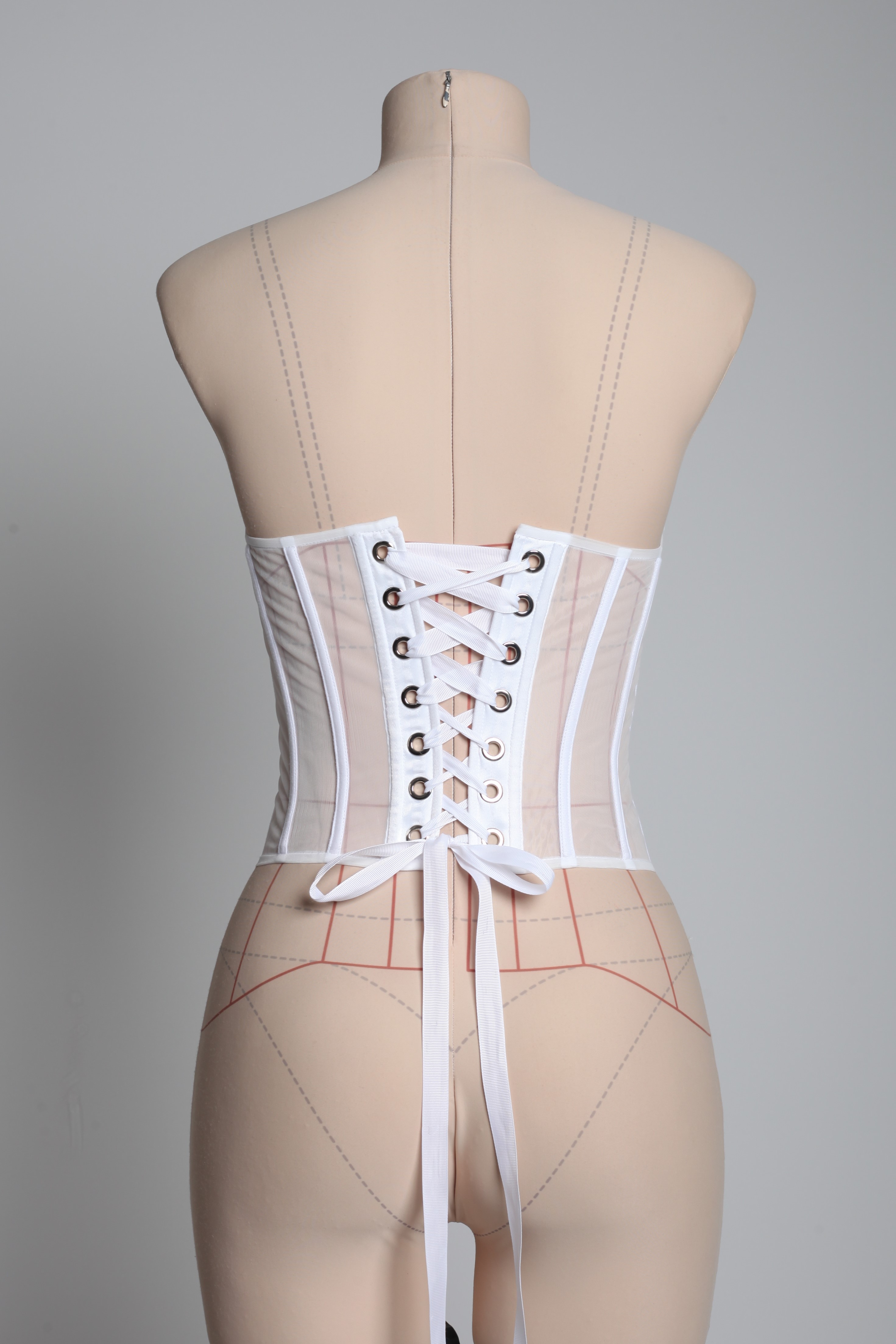 Корсет белый прозрачный из сетки с чашками удлиненный