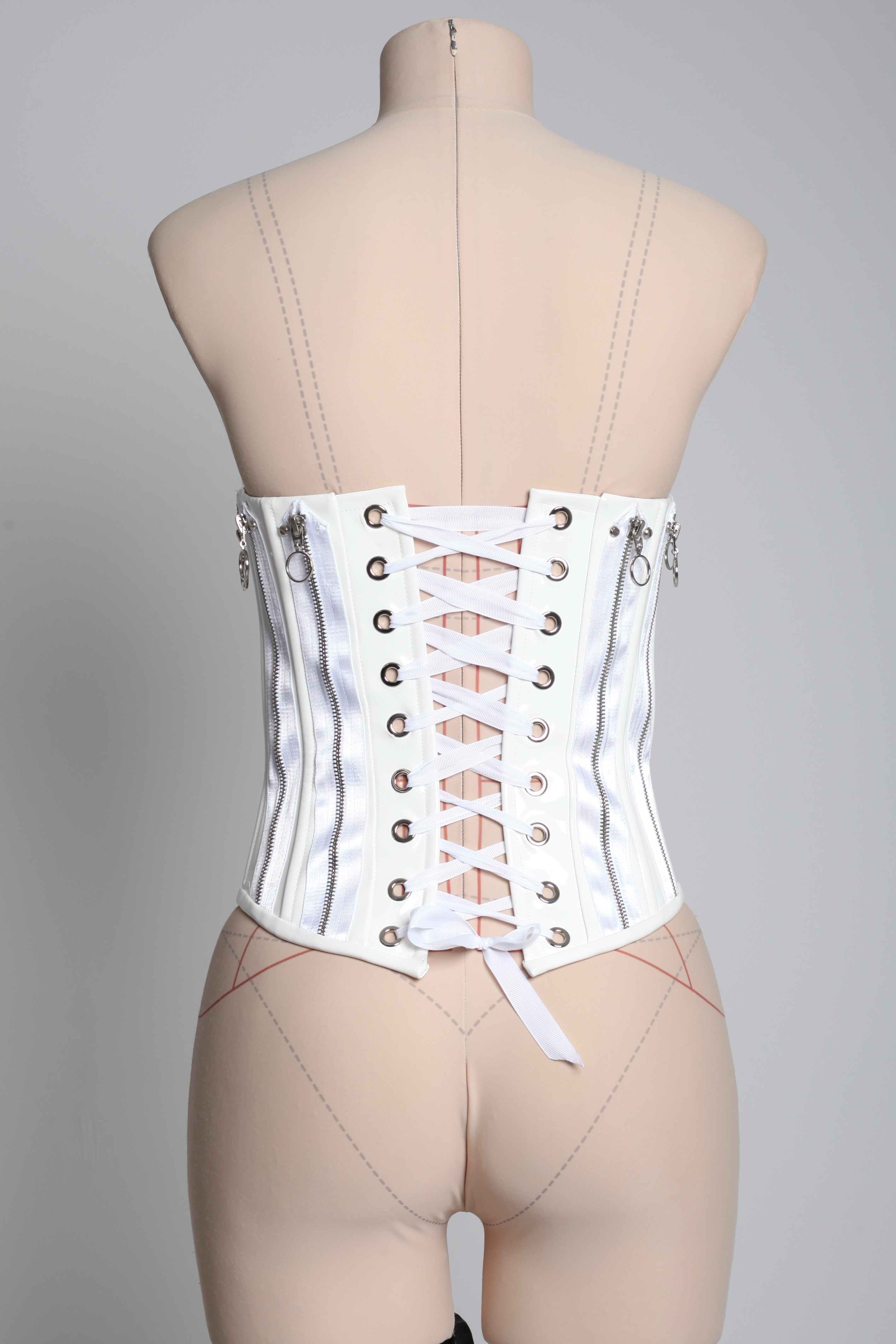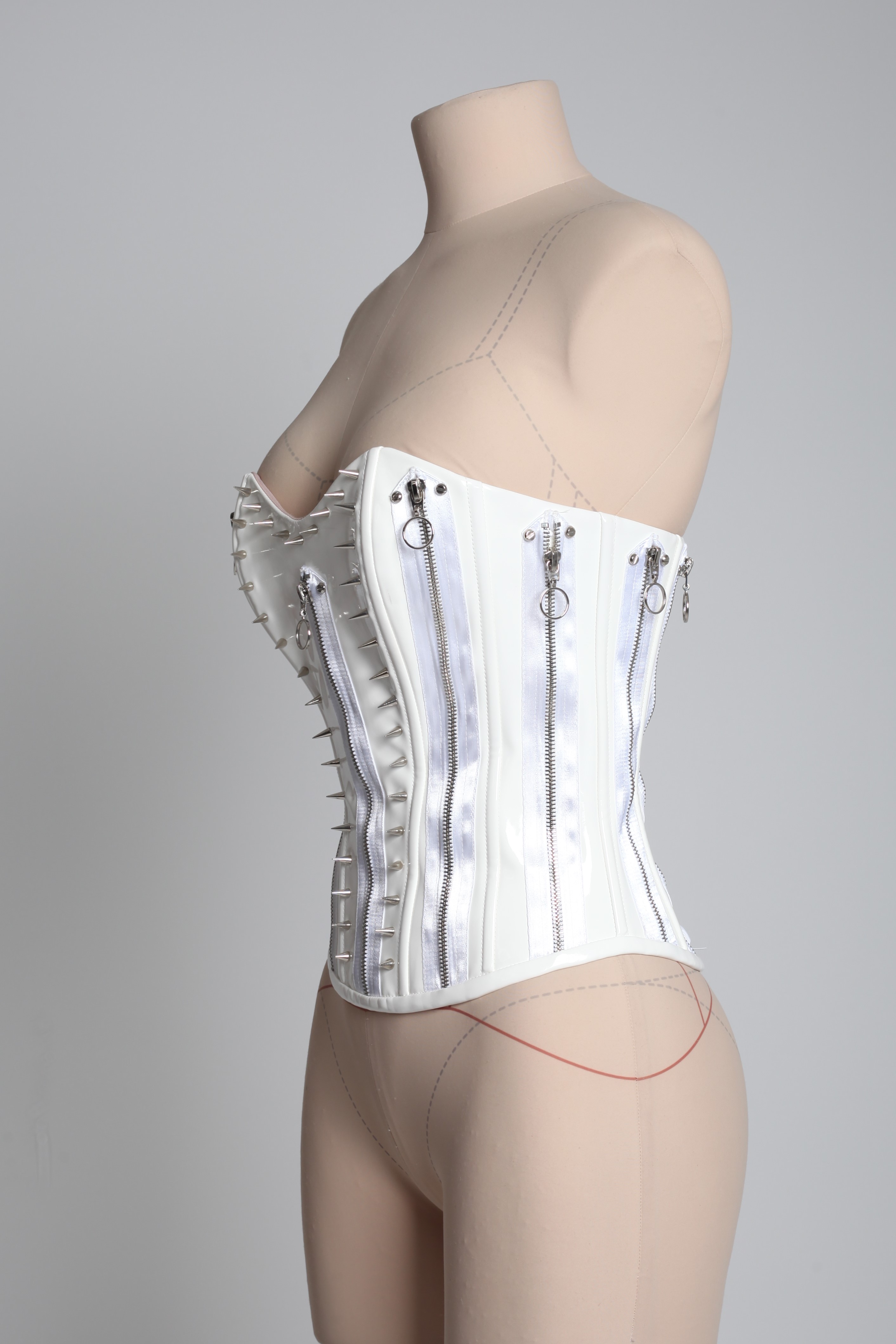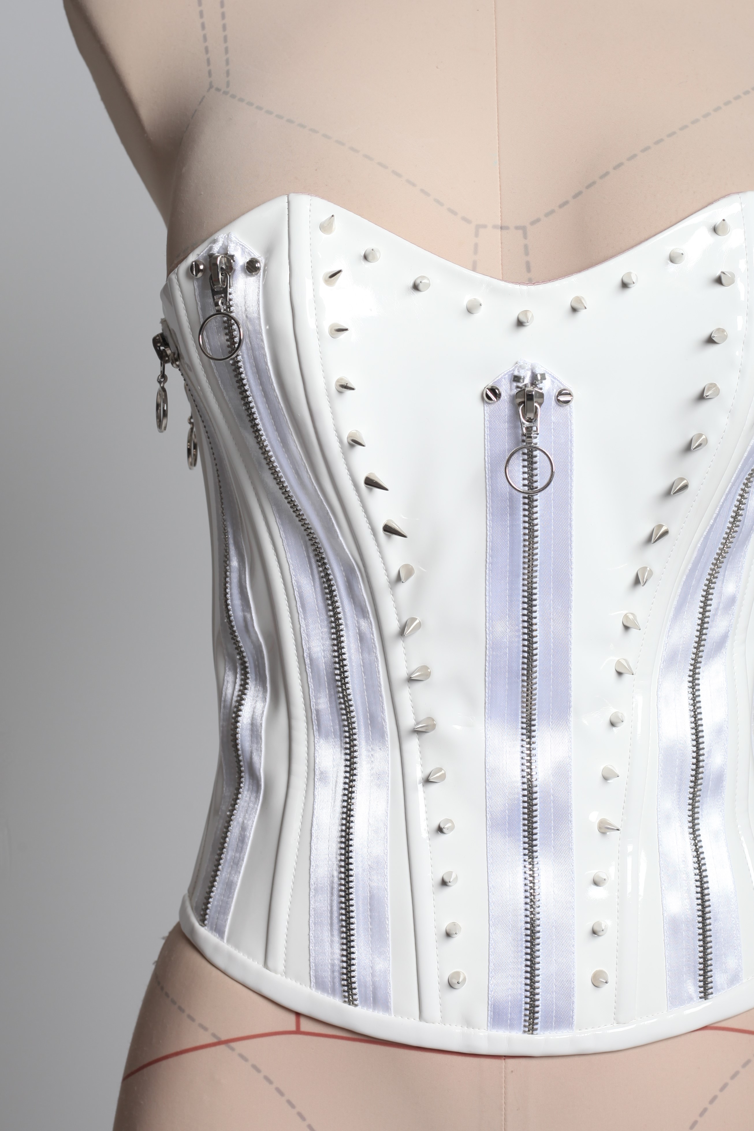 Корсет белый из лака с молниями и шипами