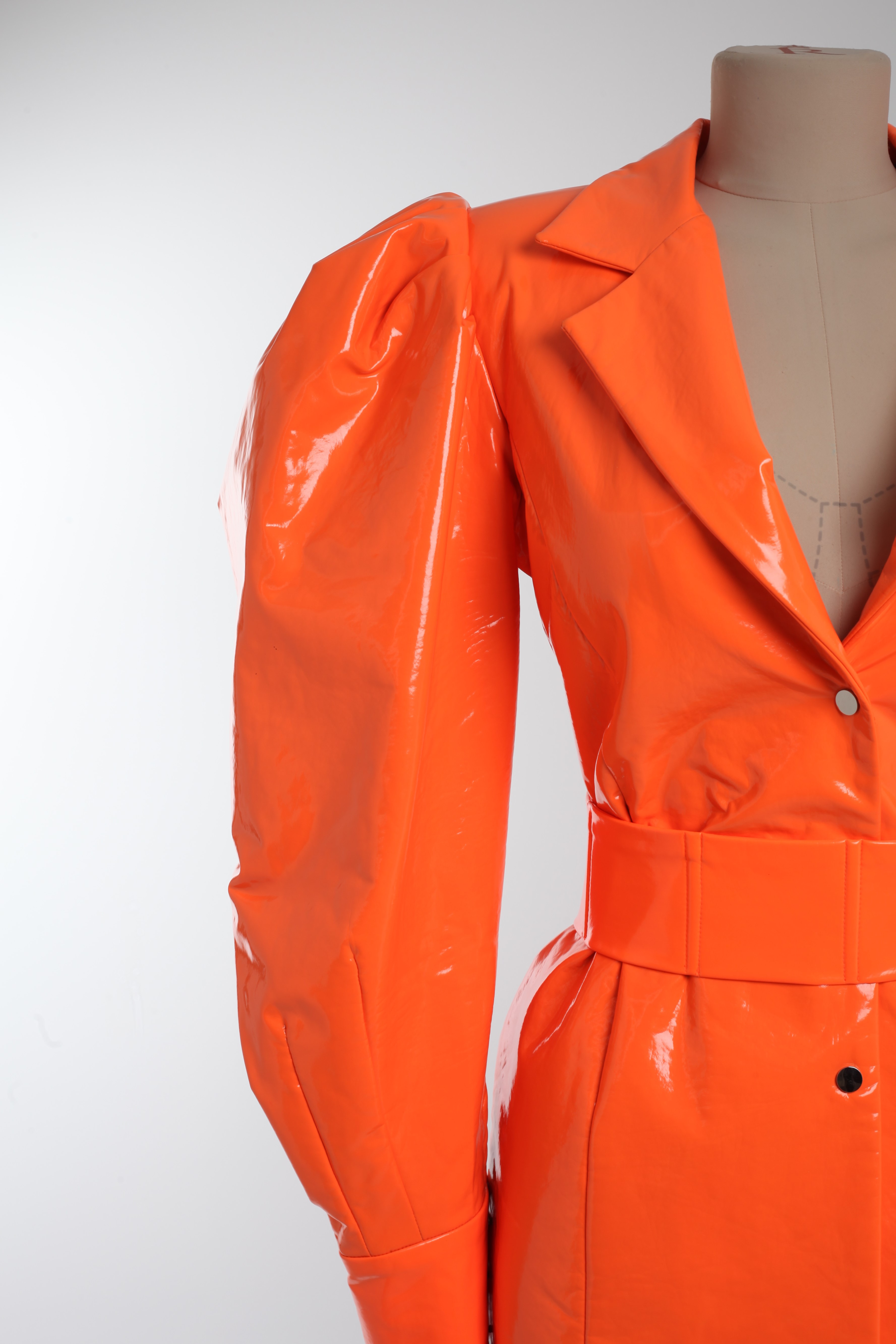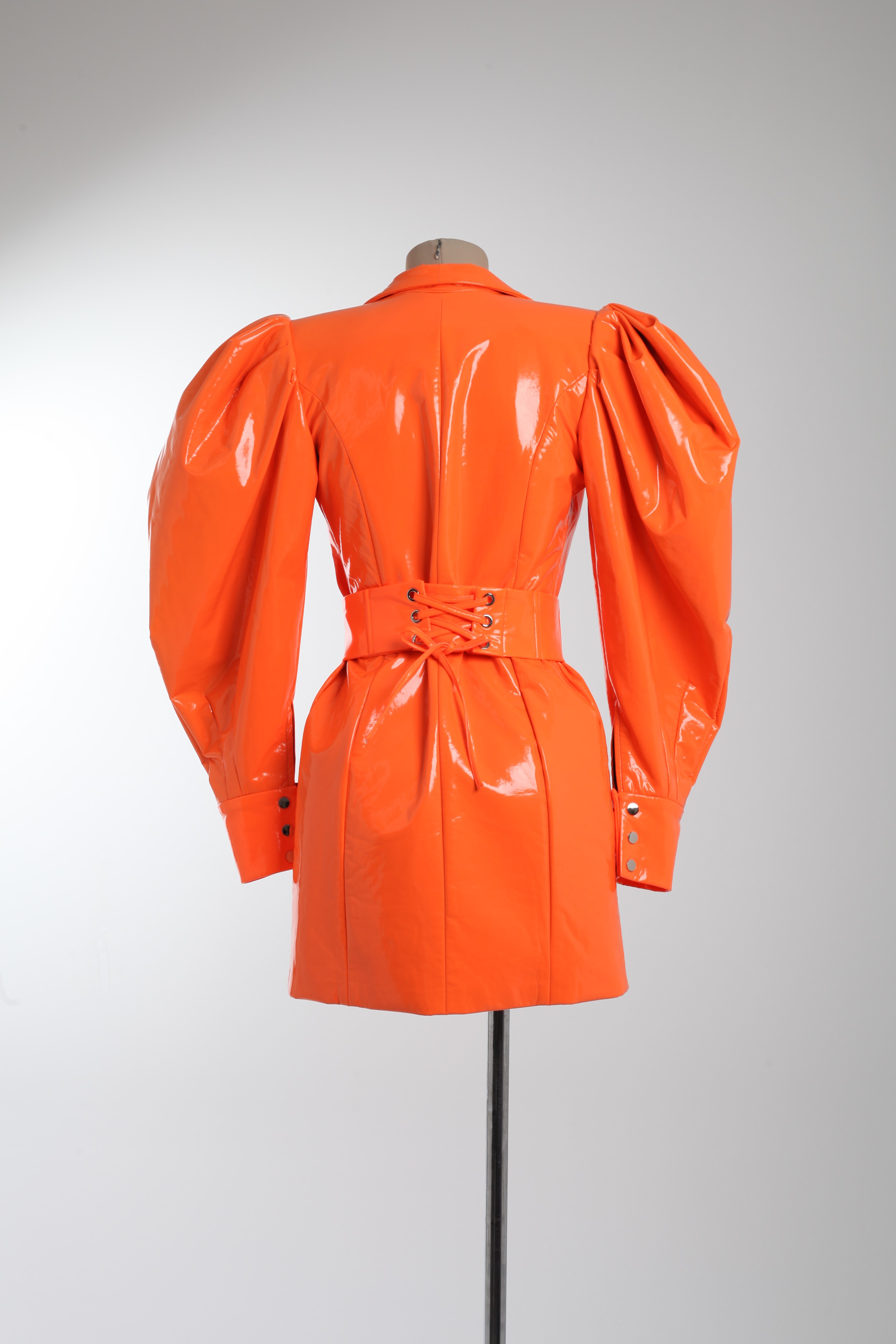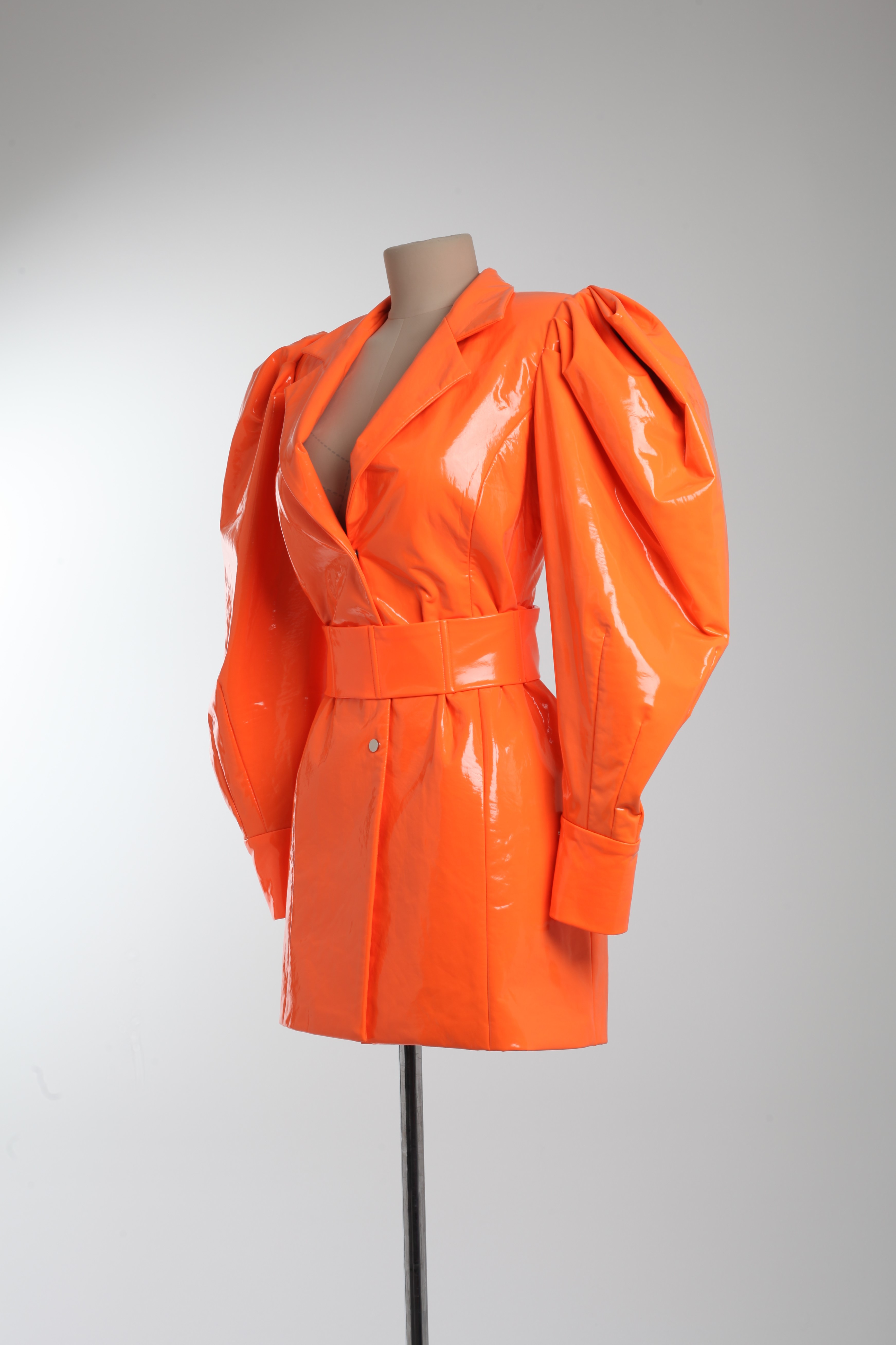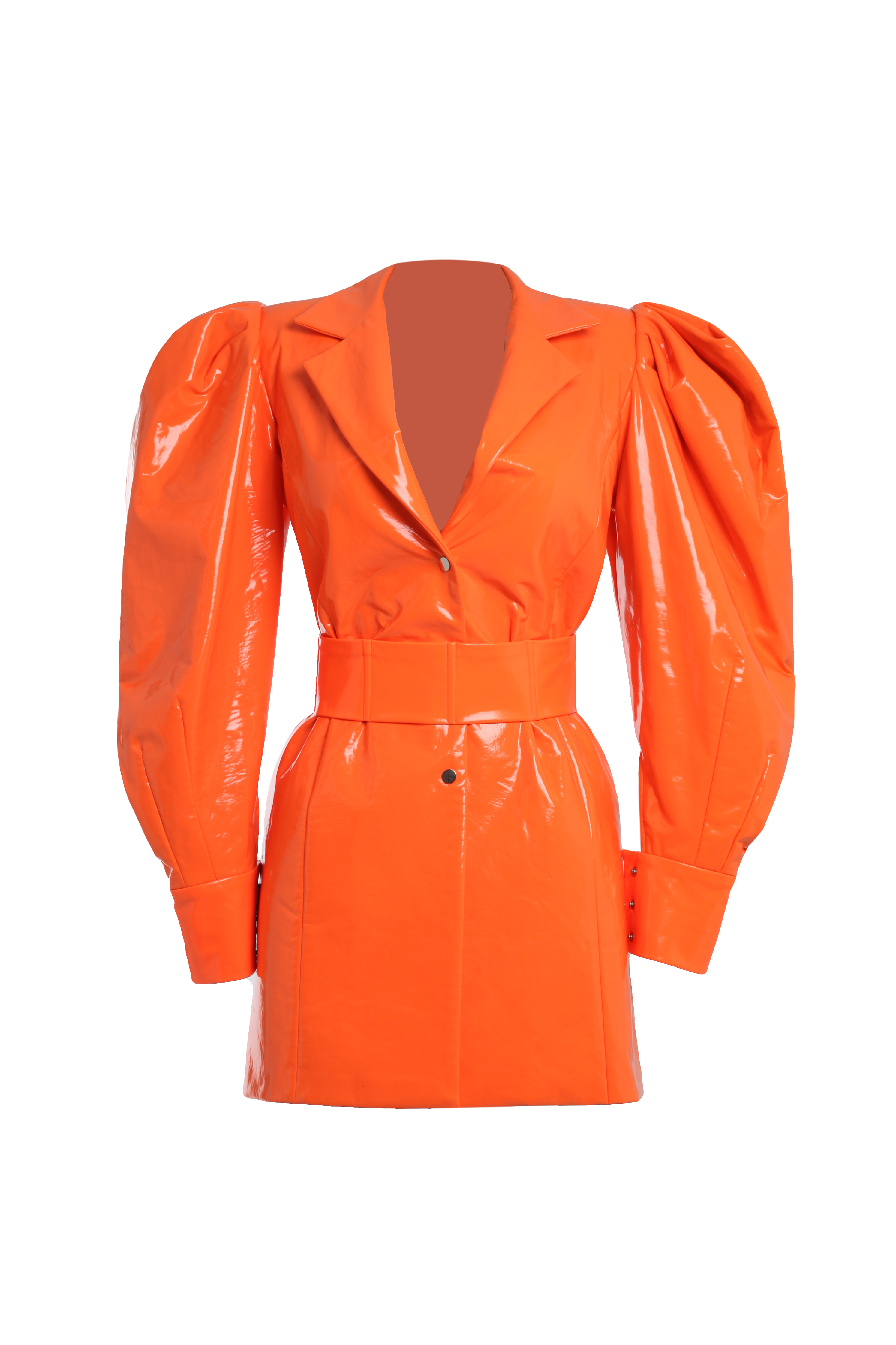 Платье неоново-оранжевое из латекса с объемными рукавами