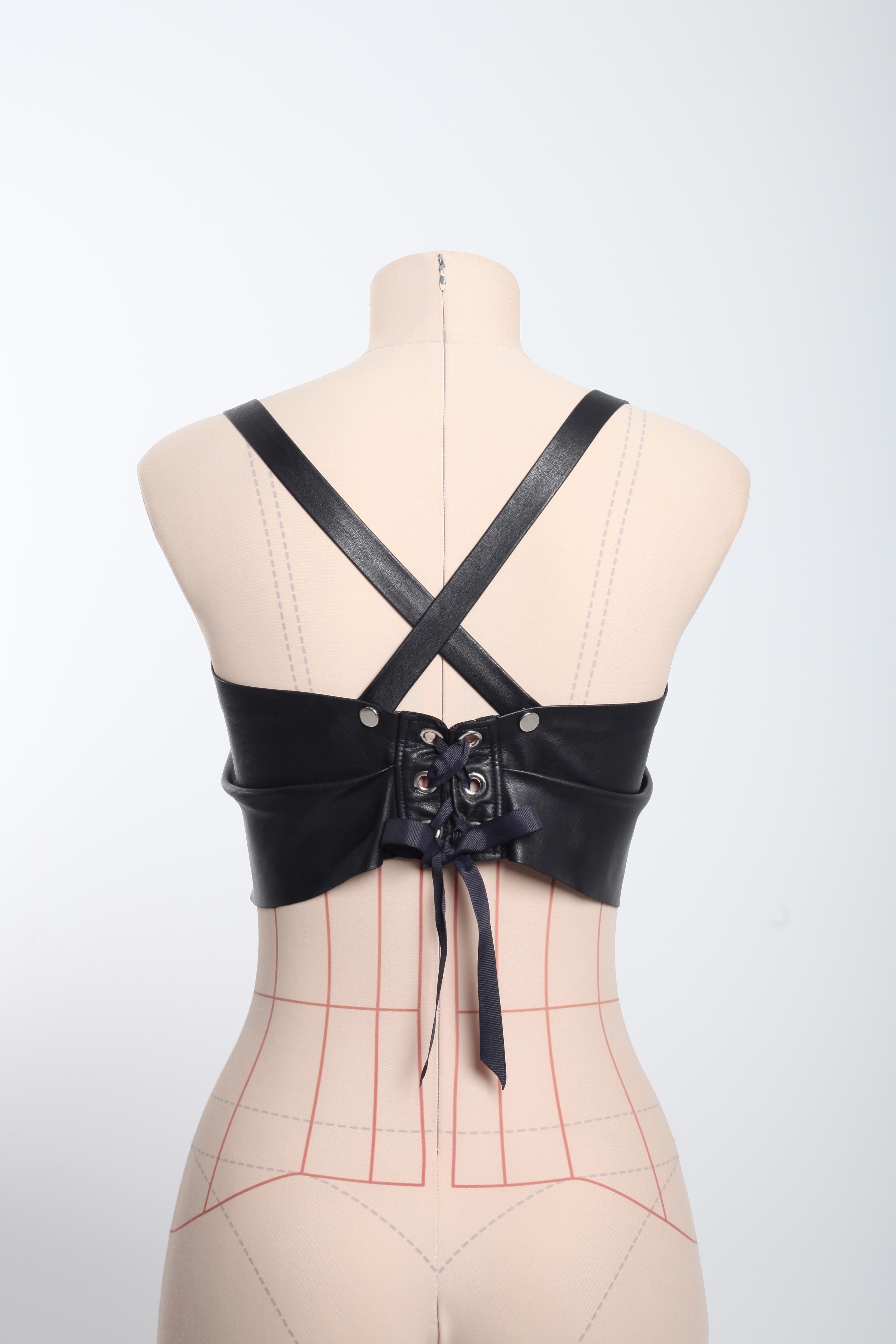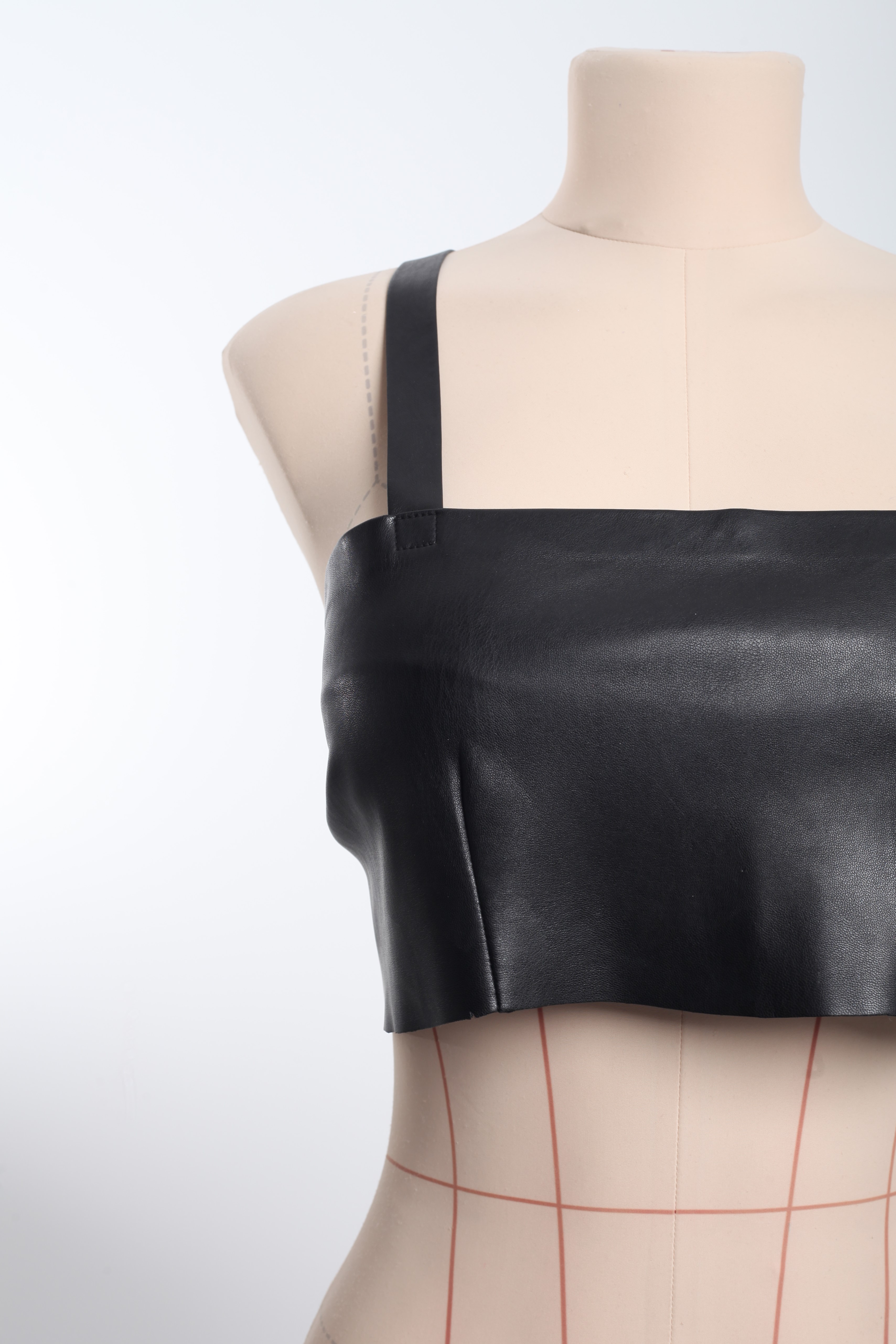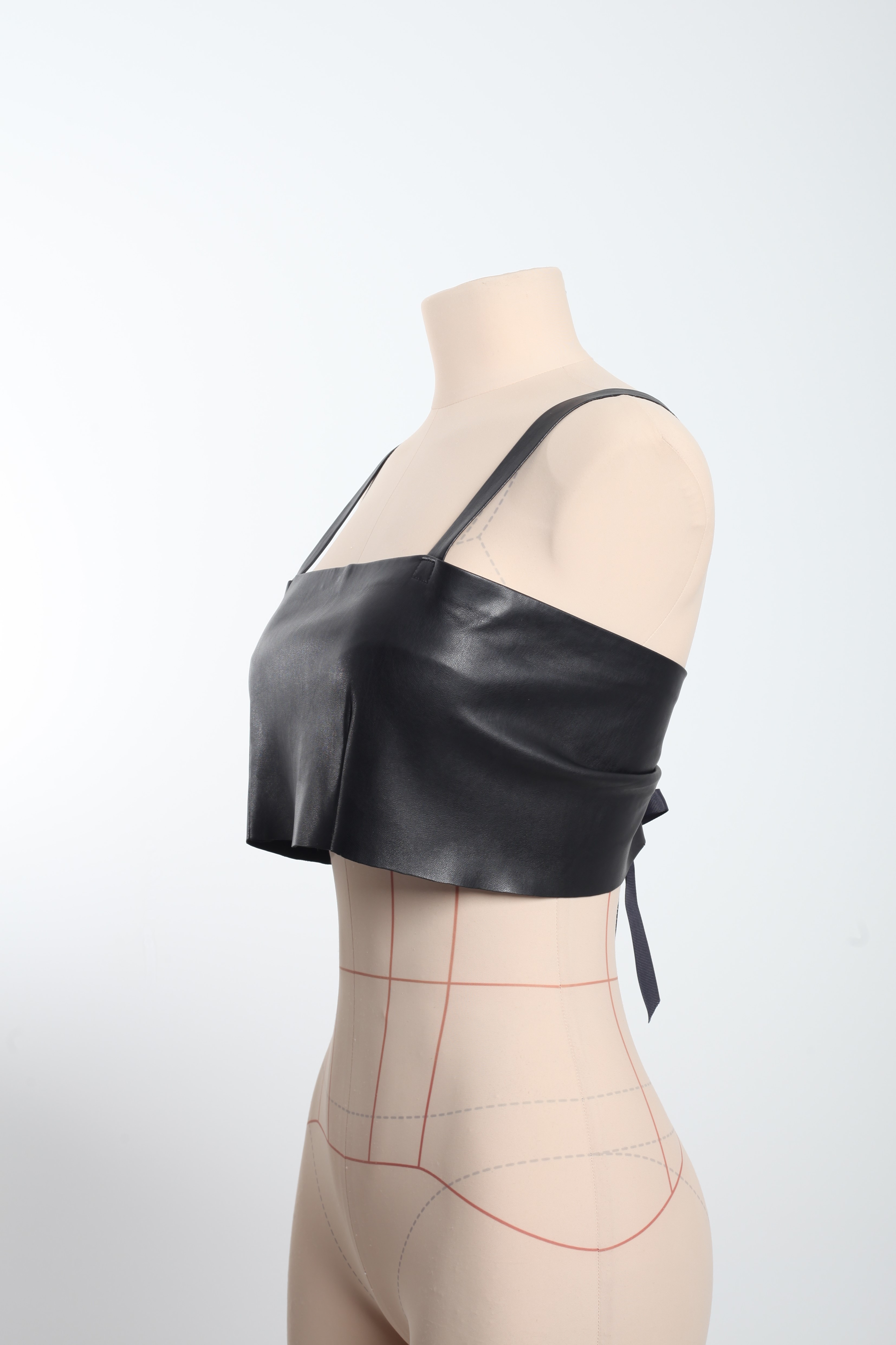 Укороченный топ-полоска из эко-кожи. На шнуровке сзади. Длина бретелей регулируется кнопками.