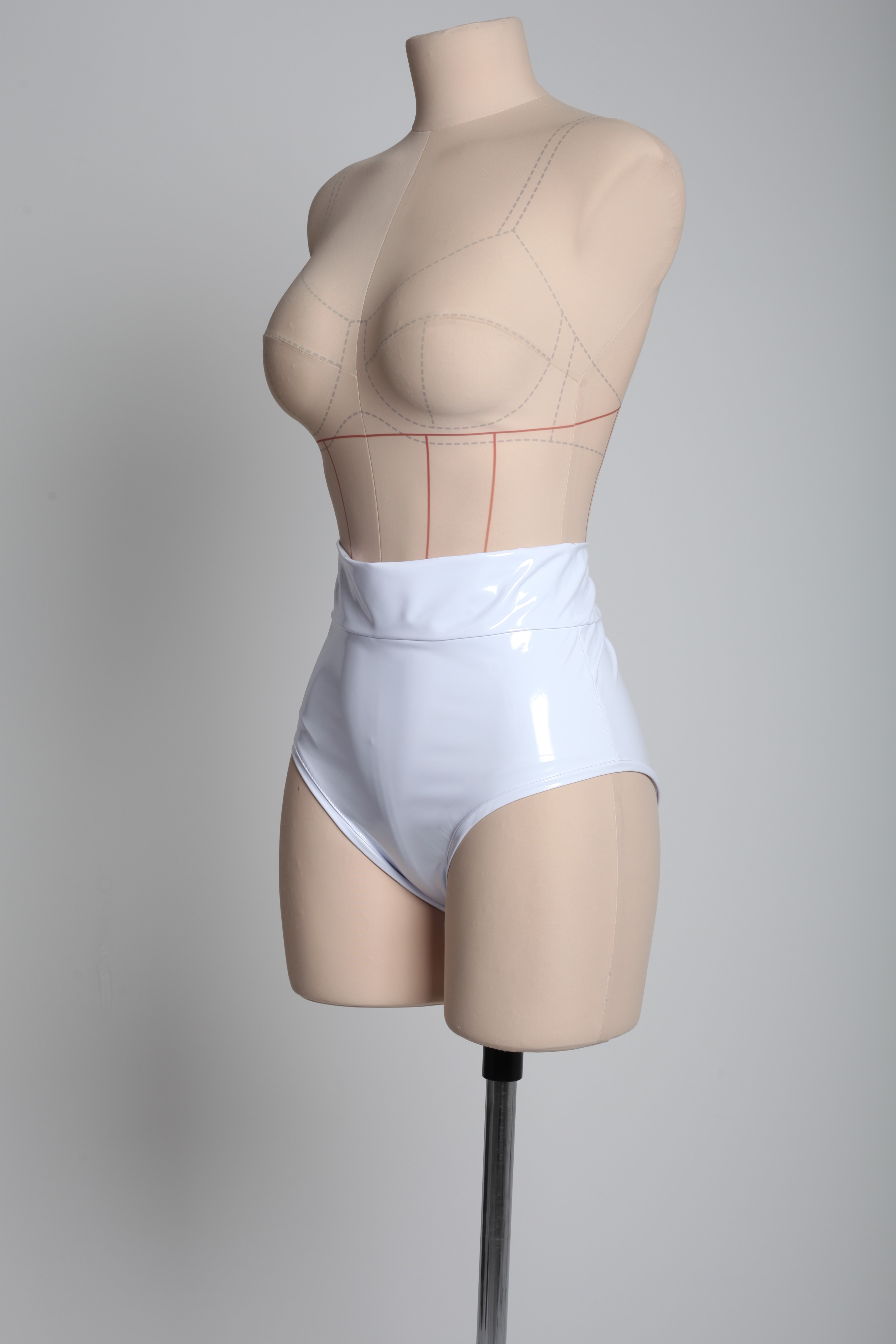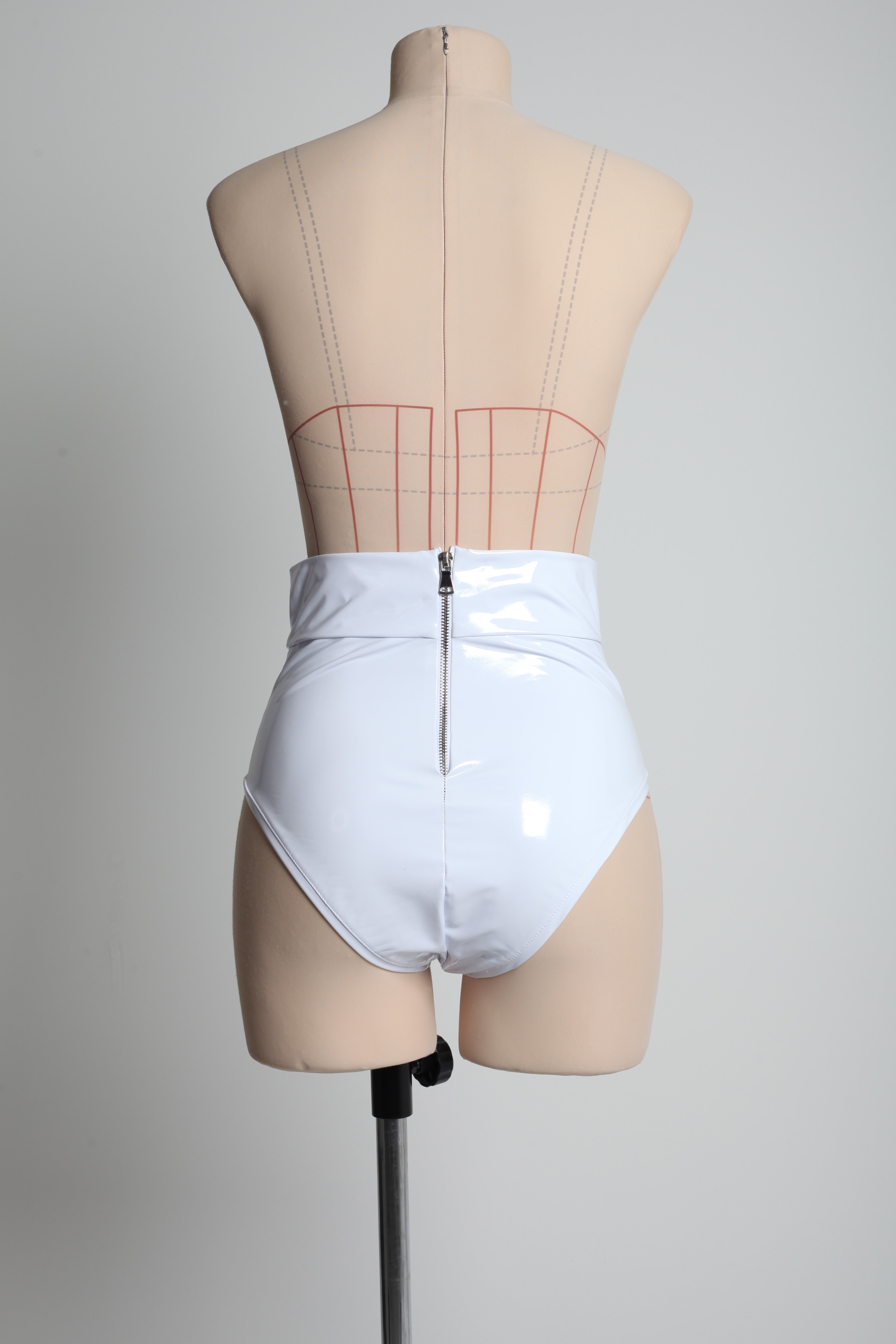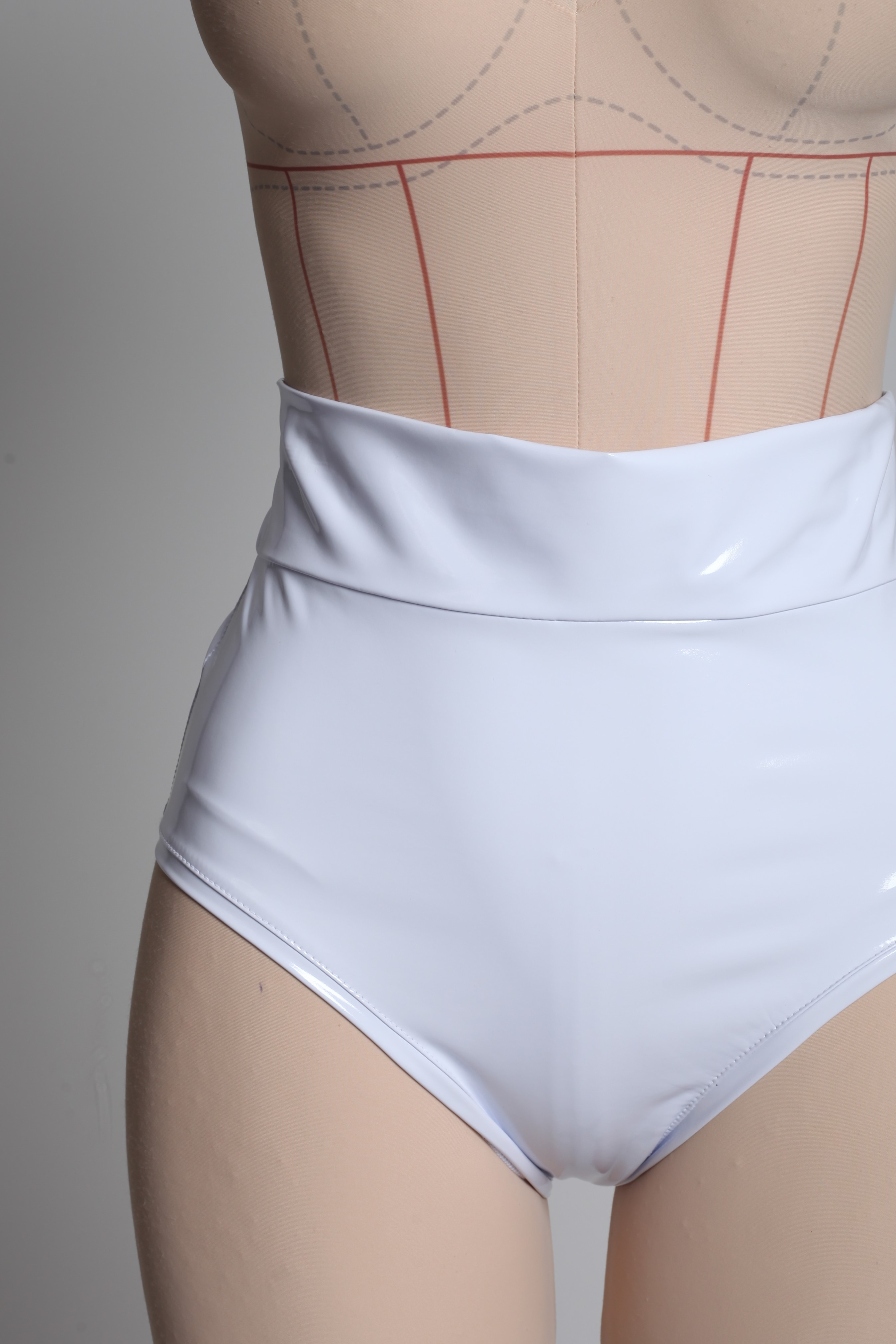 Лаковые трусы с завышенной талией из белоснежного латекса. Эффектно подчёркивают талию. Застегиваются на молнию сзади.