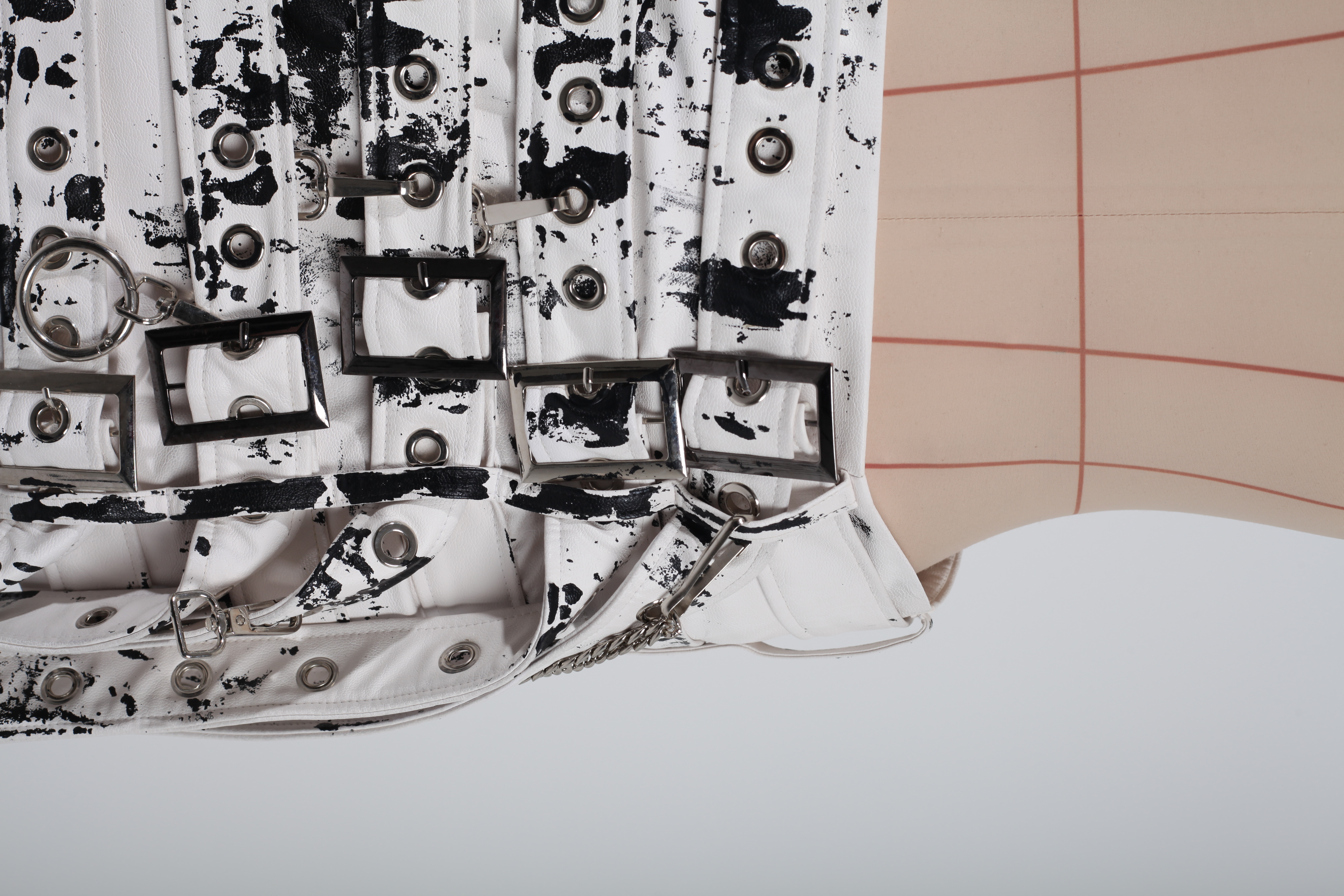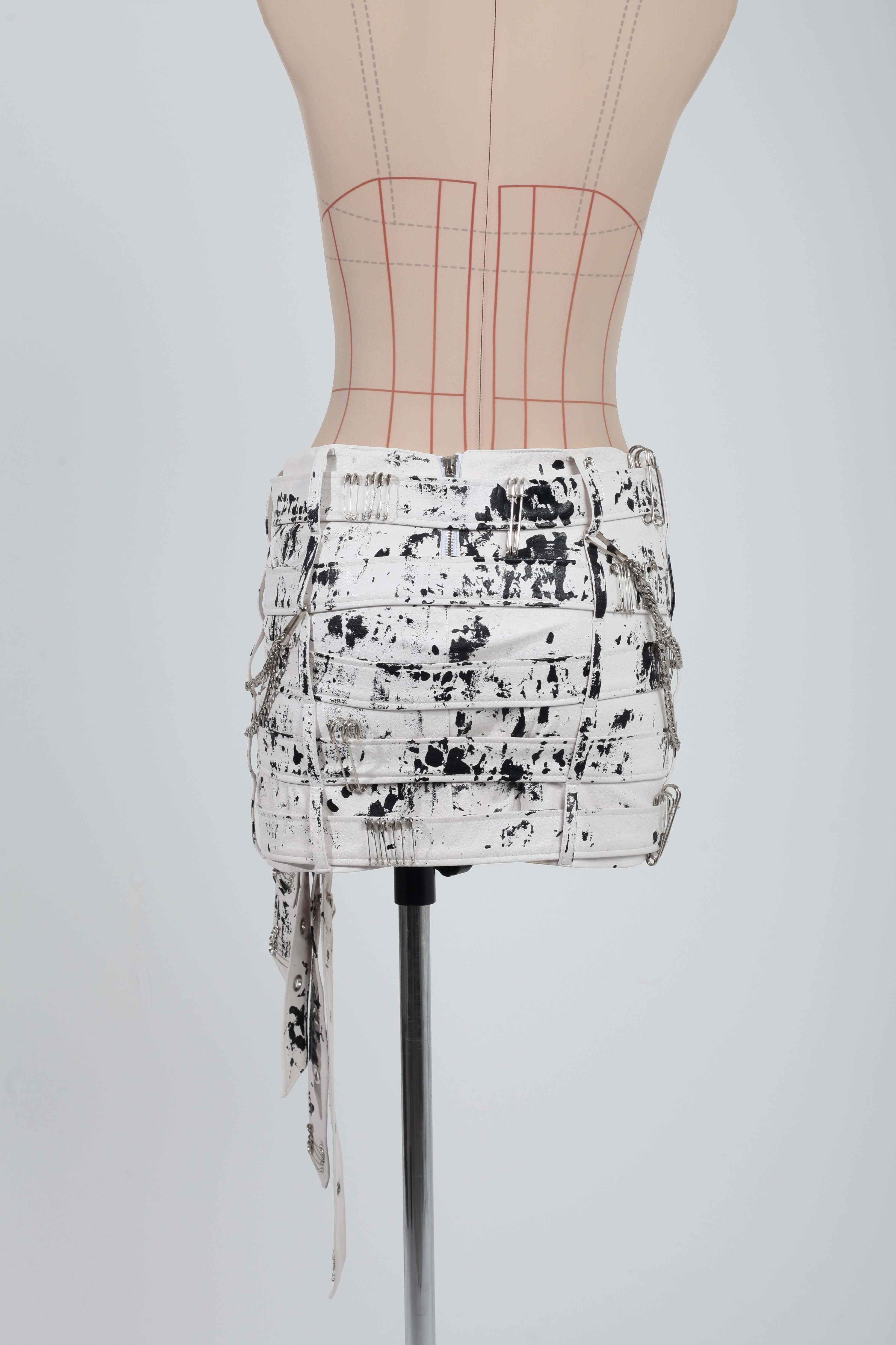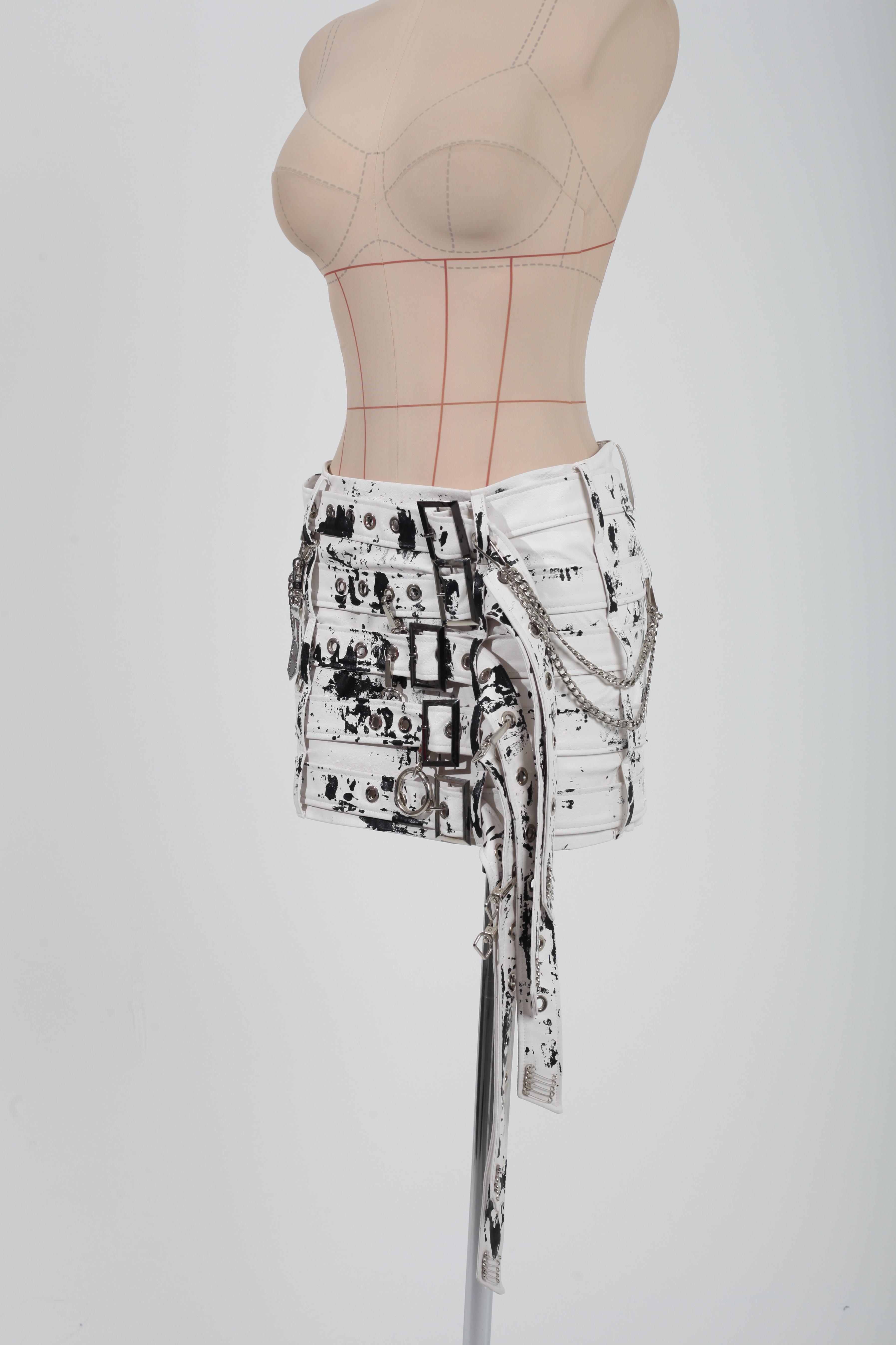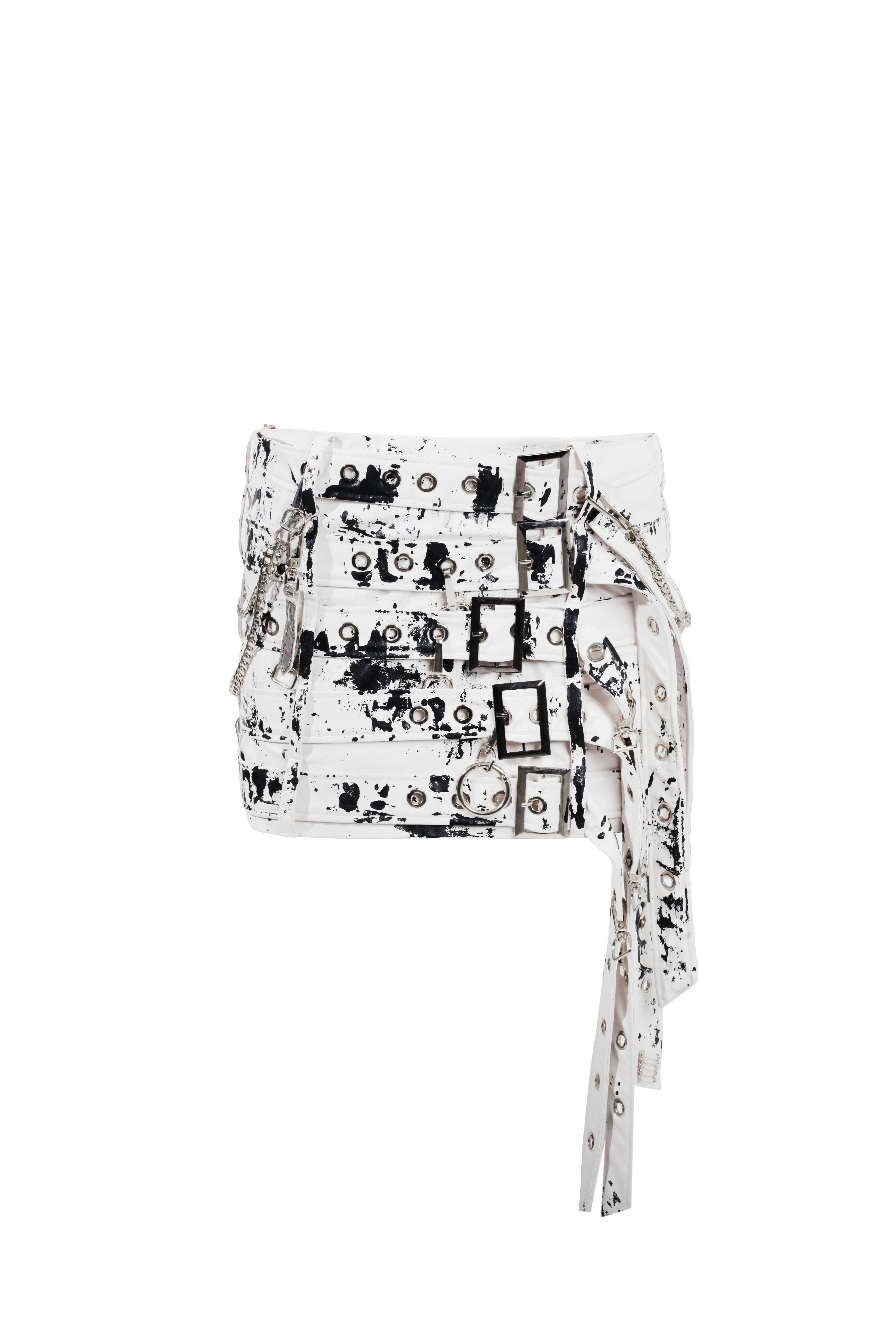 Юбка-мини белая из экокожи с ремнями и черной росписью