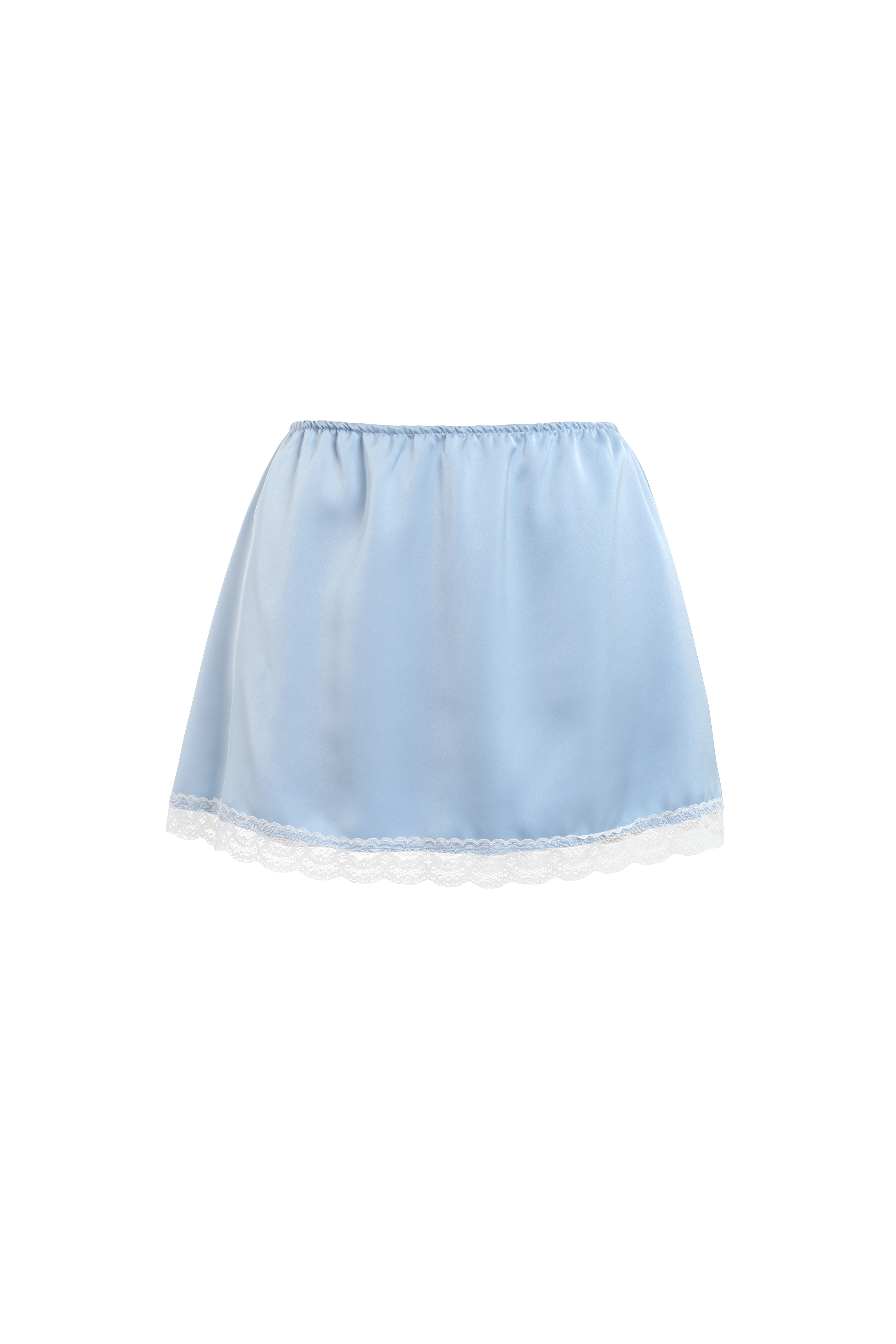 Юбка-мини из голубой атласной ткани с тесьмой из кружева