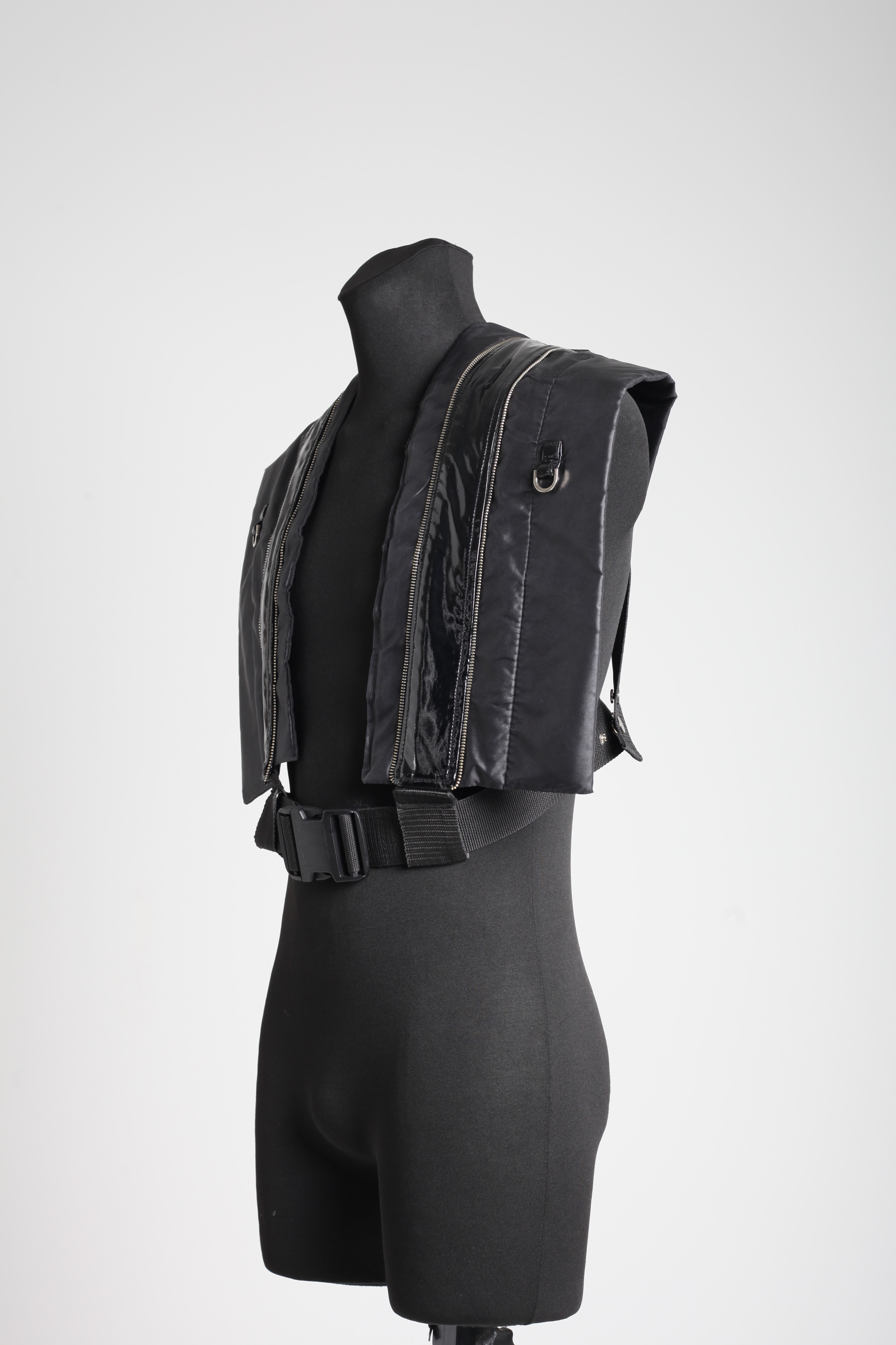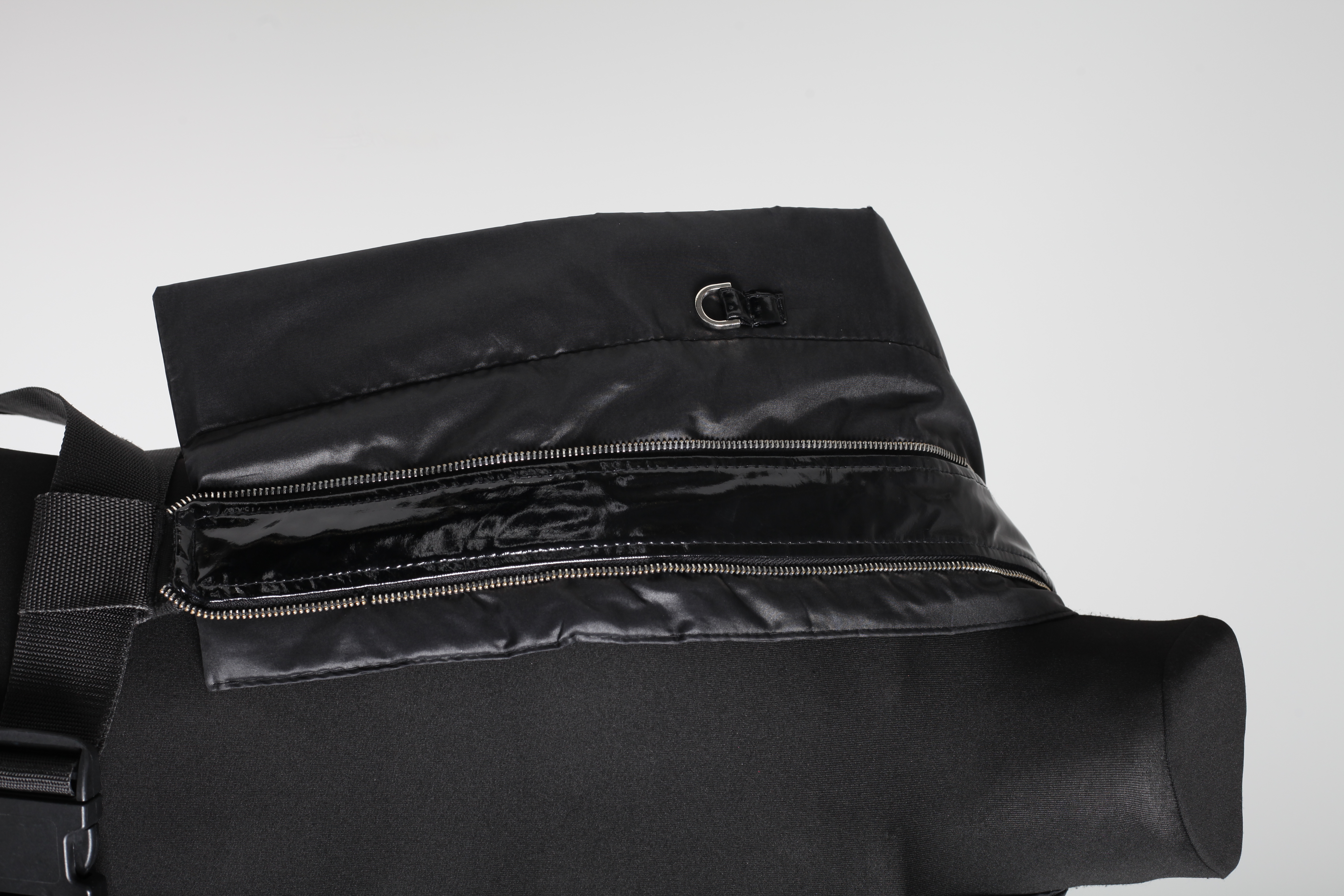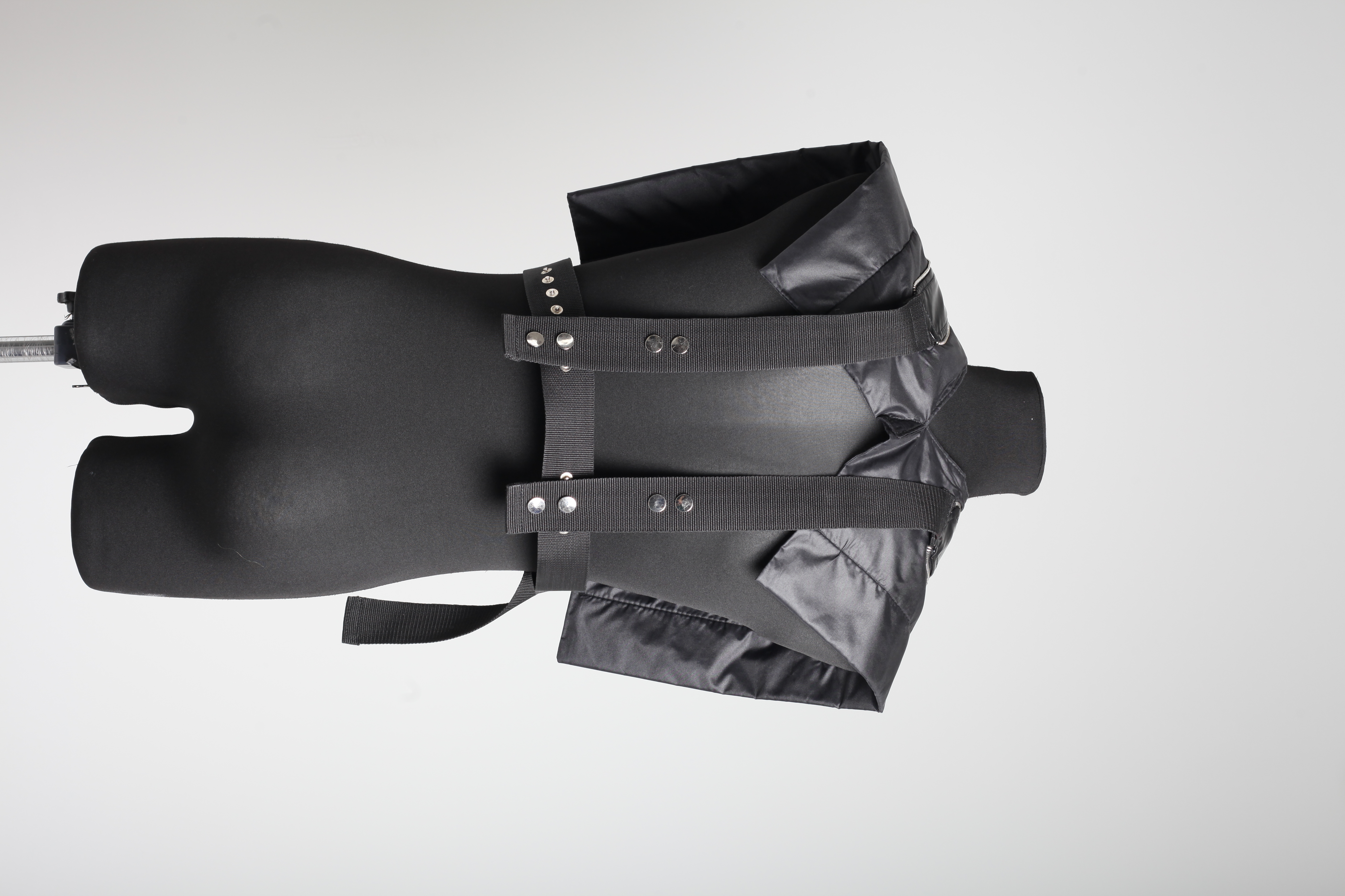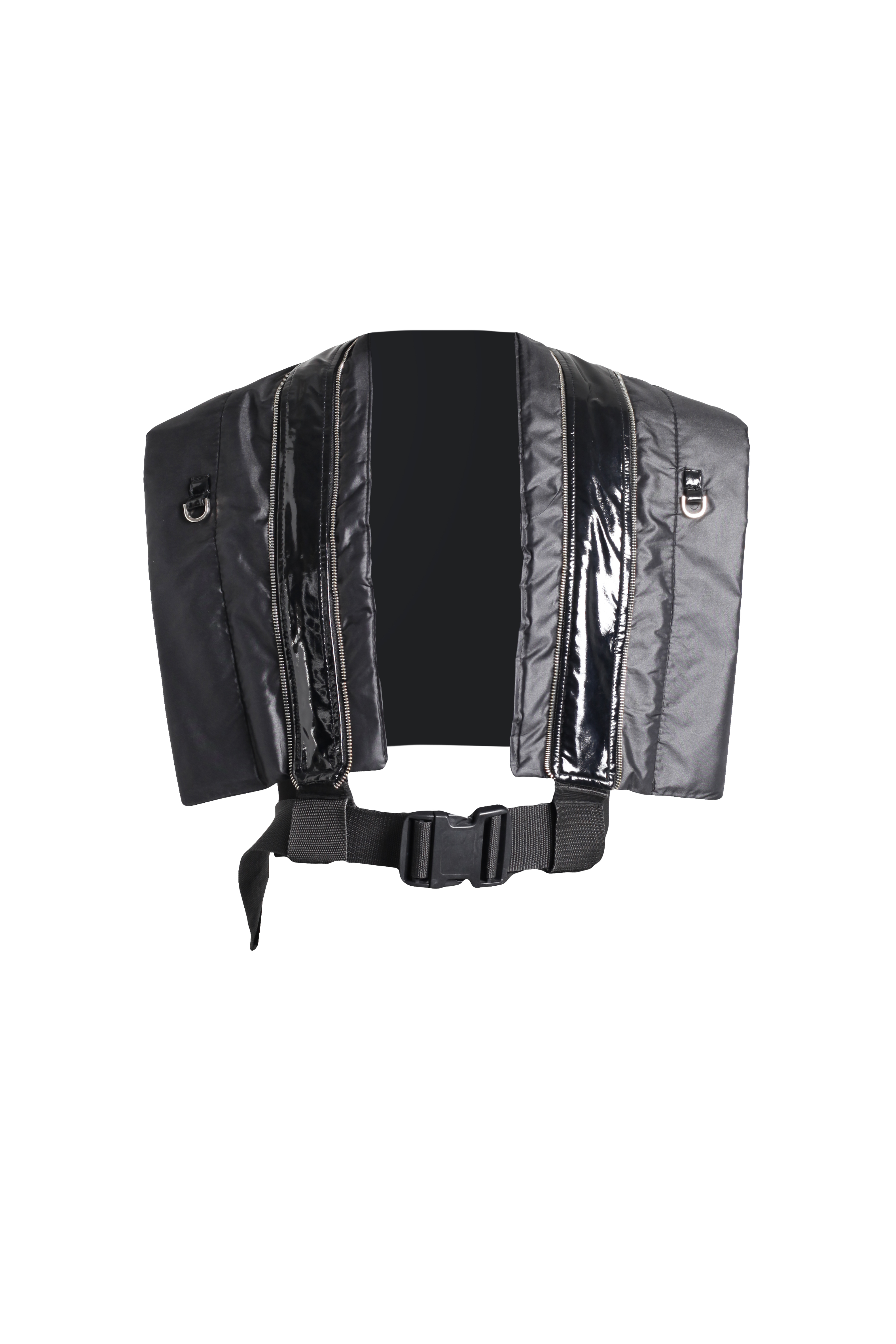 Обьемный жилет с акцентом на плечи из плащевой и лаковой ткани черного цвета. Пояс и бретели выполнены из черной стропы. Декорирован металлическими карабинами.