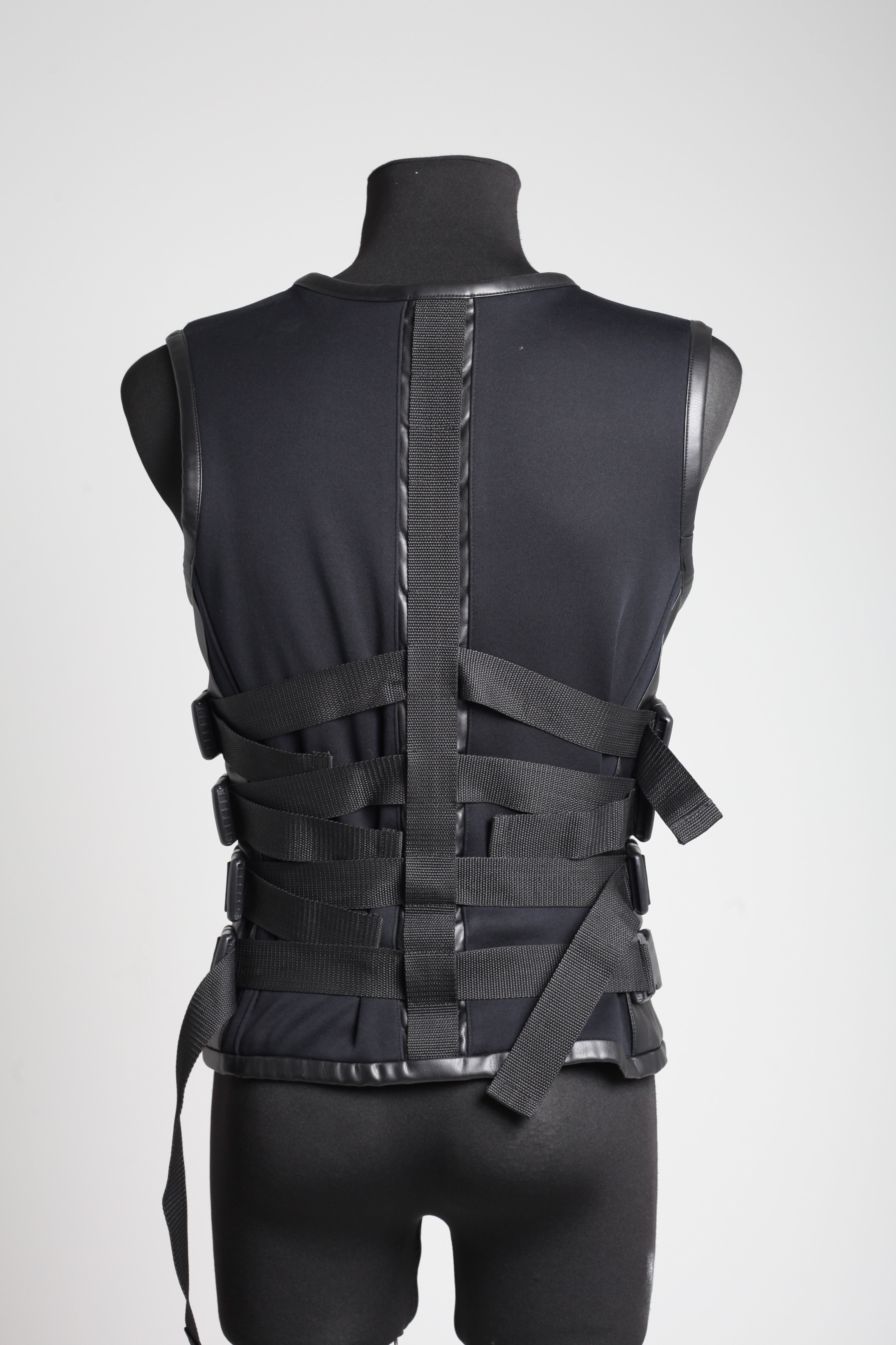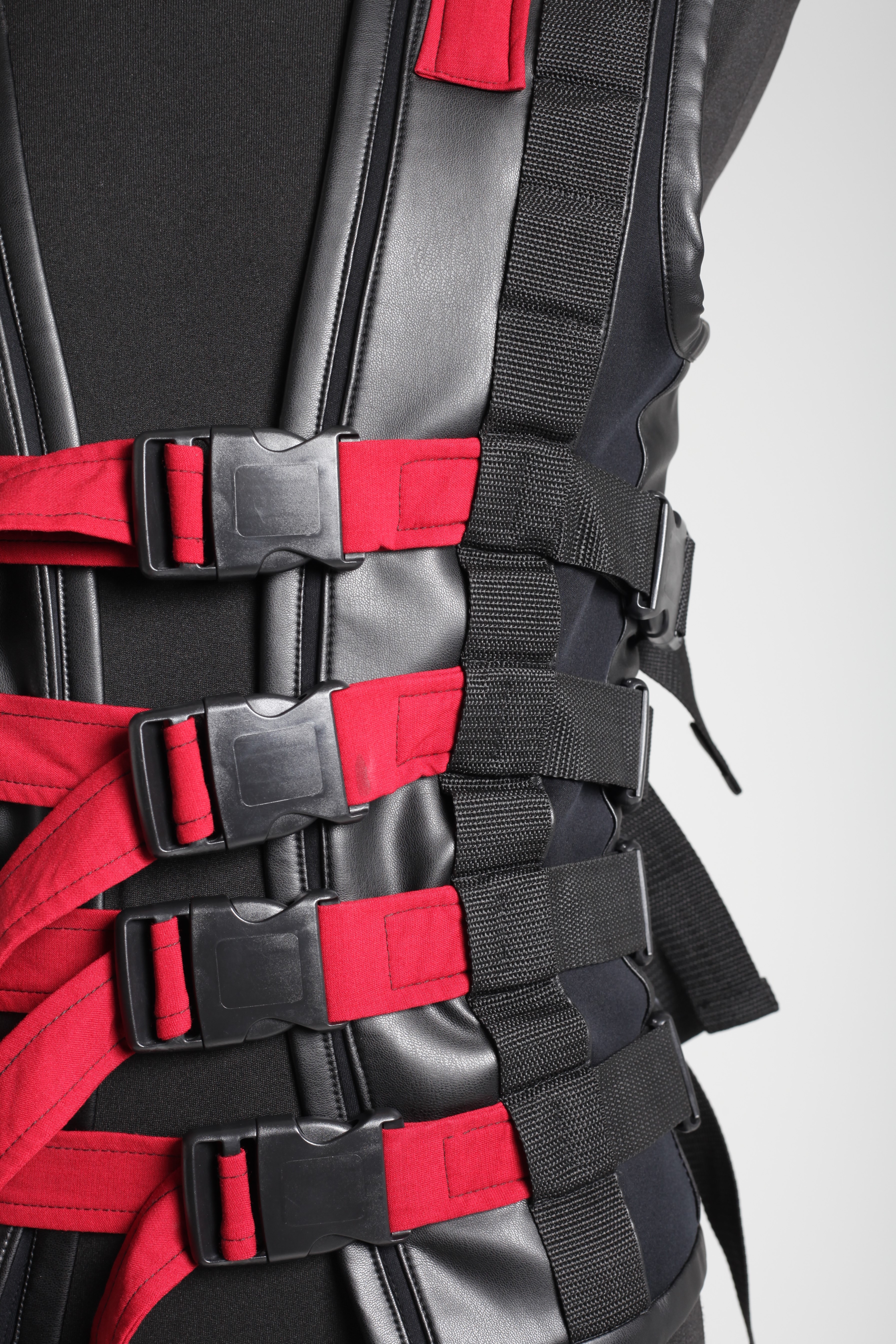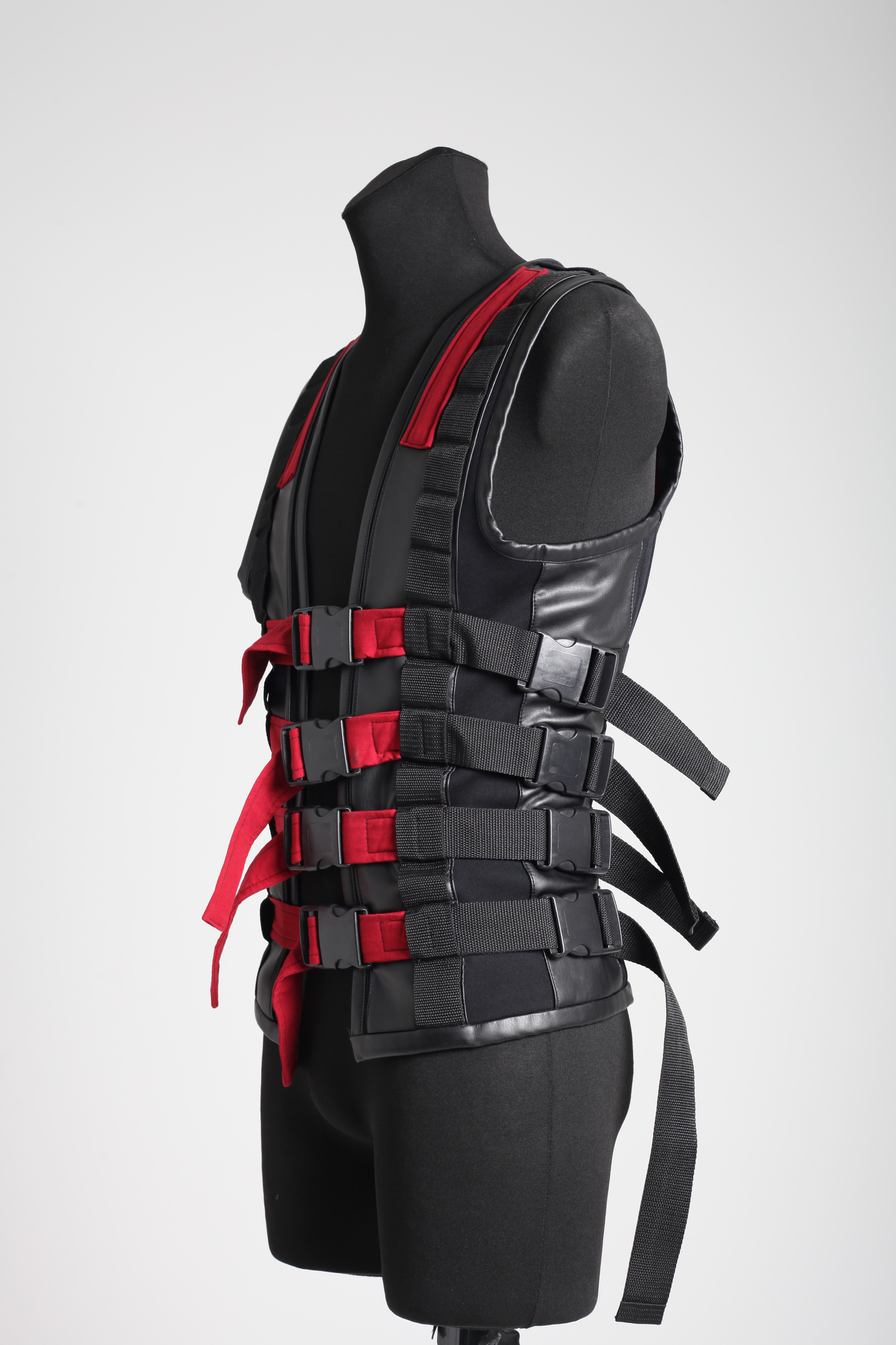 Массивеый жилет в стиле киберпанк из неопрена и эко-кожи черного цвета. Дополнен ремешками из черной стропы с пластиковыми пряжкам. Передние ремешки выполнены из костюмной ткани бордового цвета.