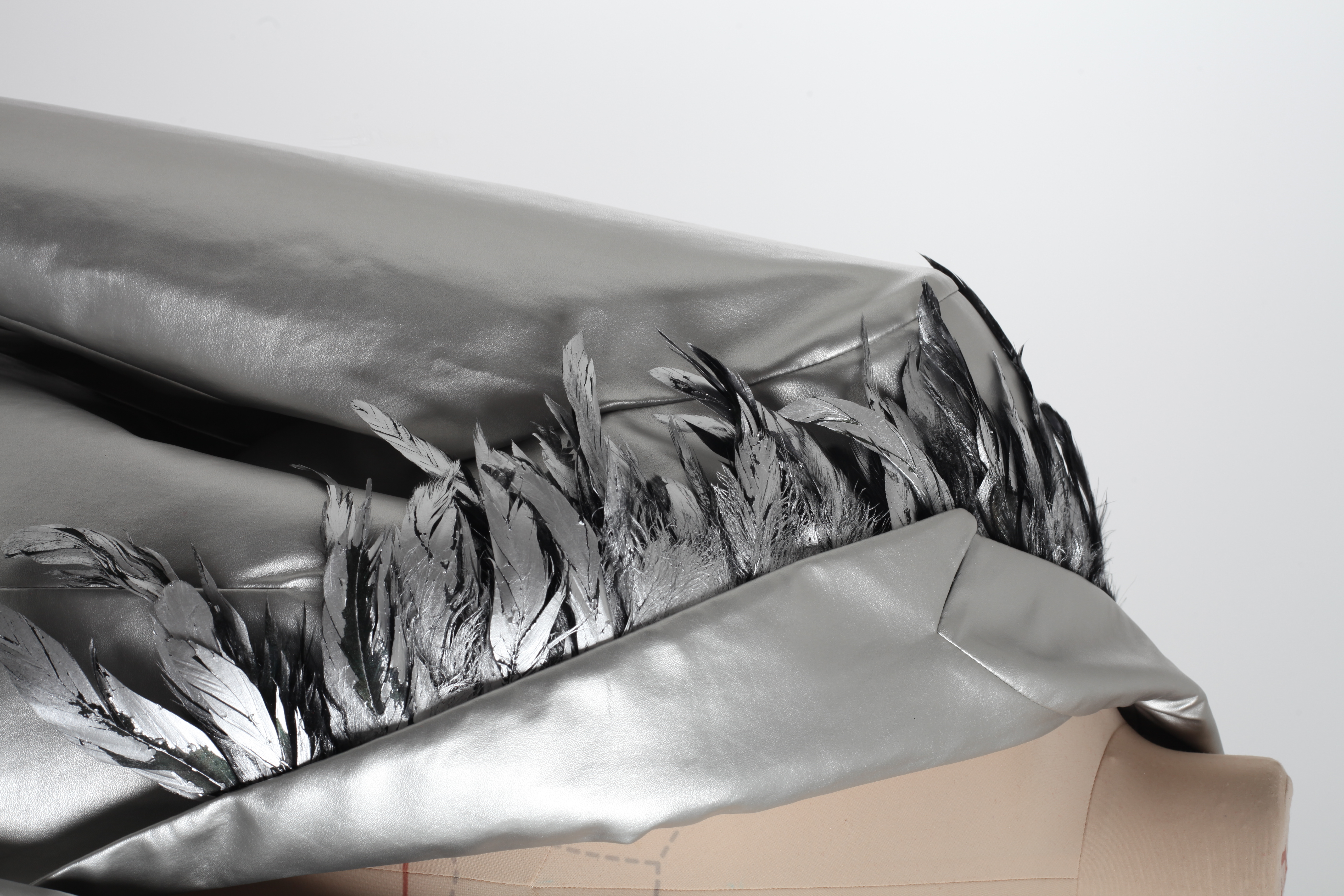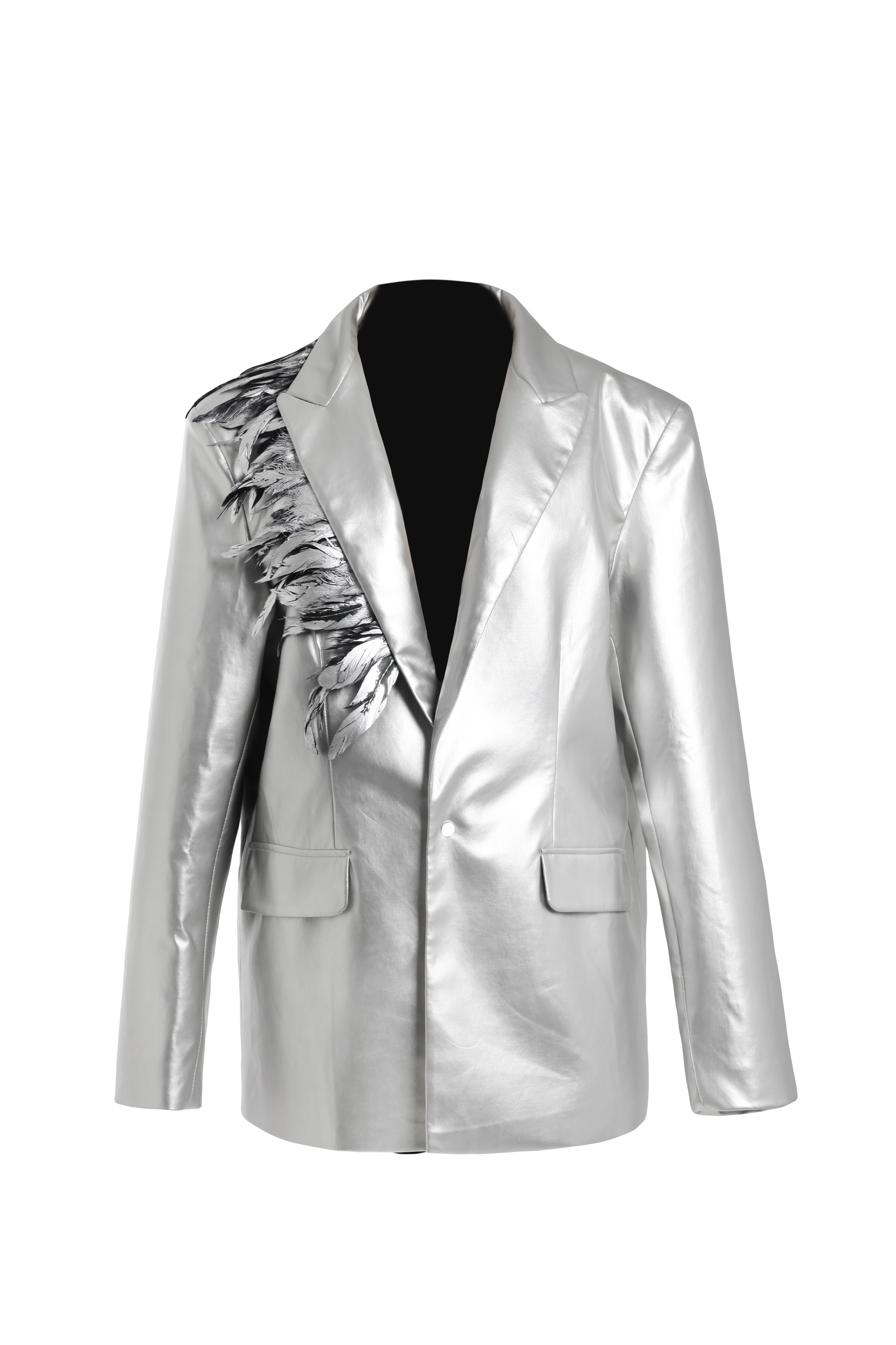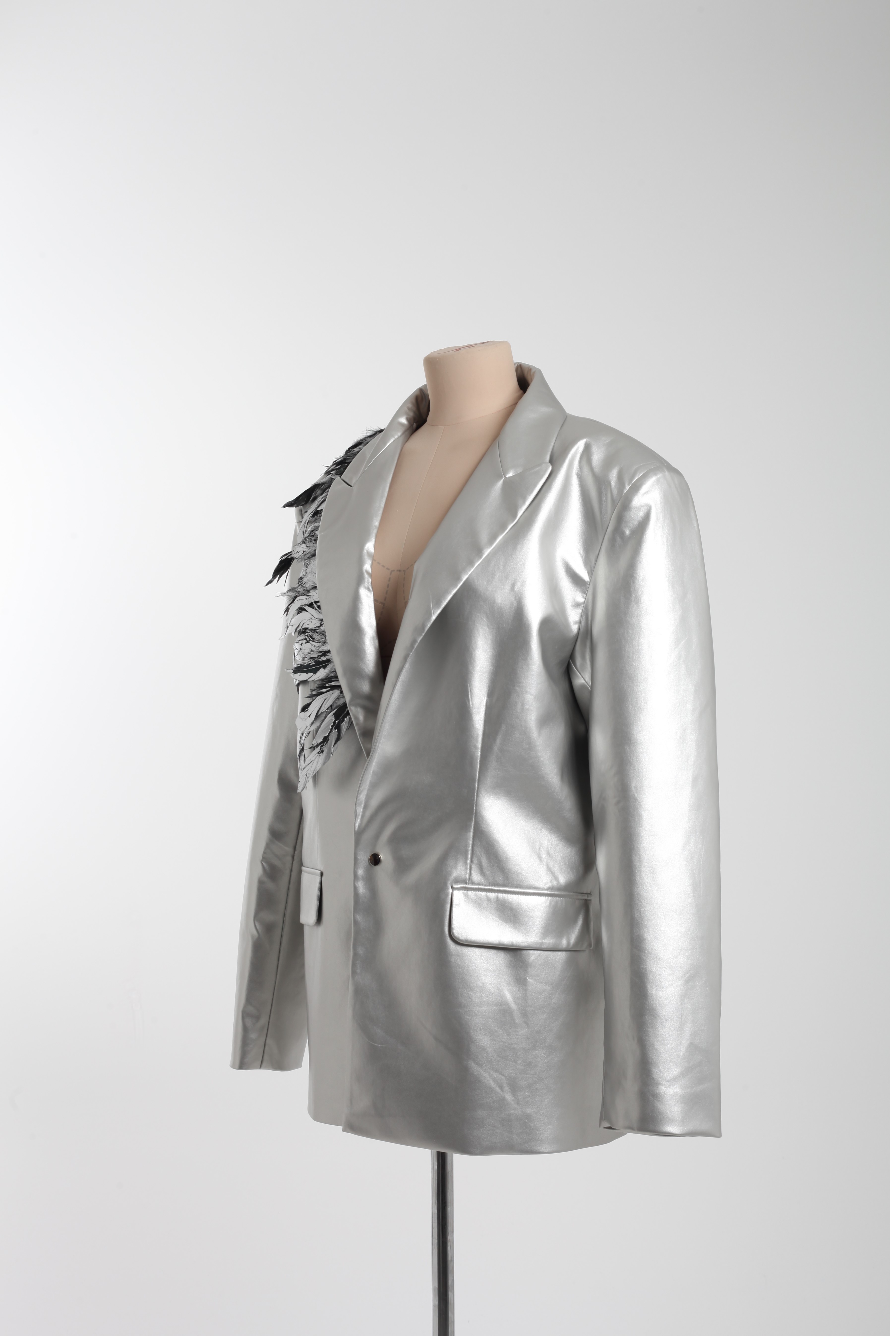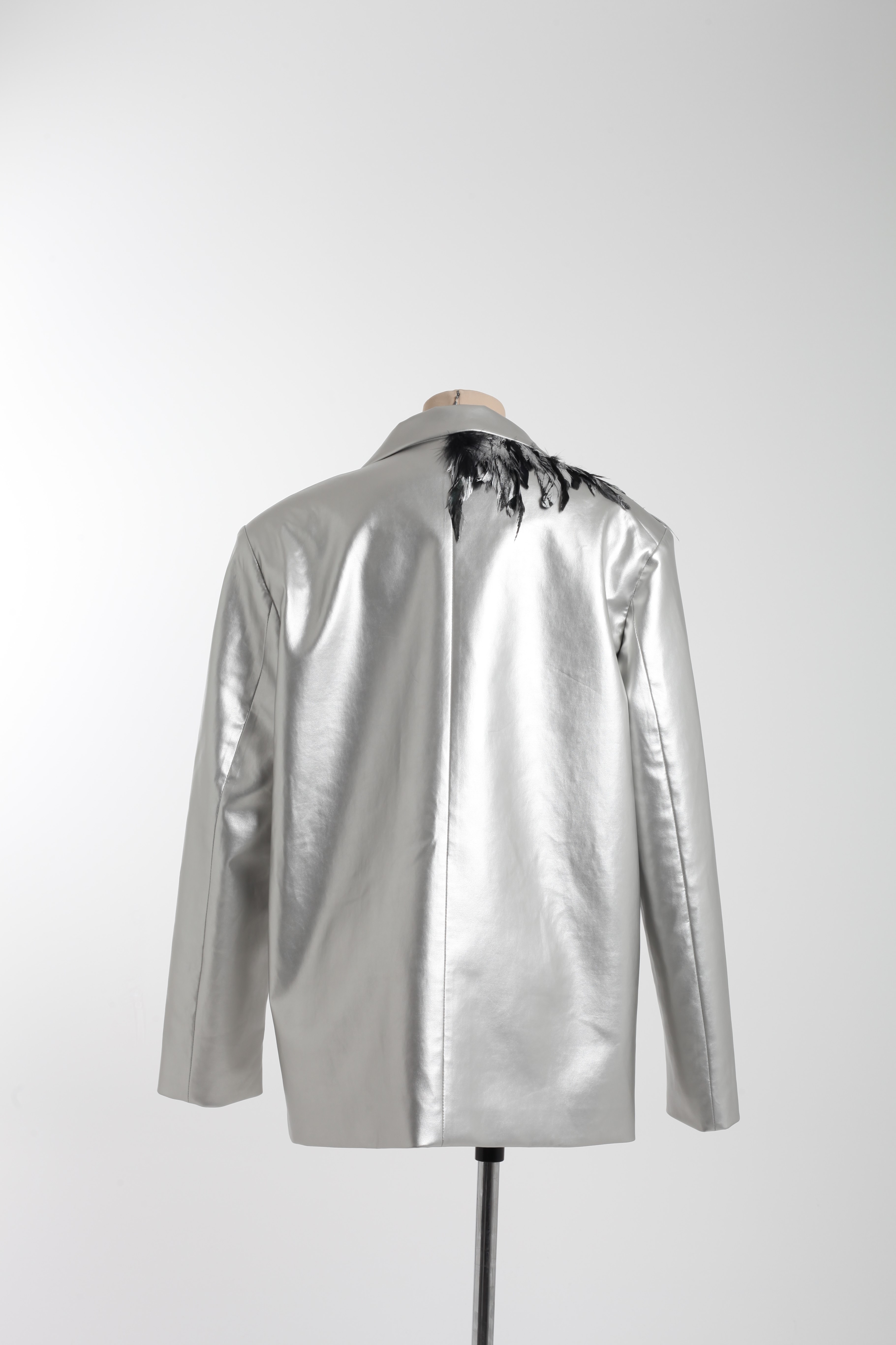 Пиджак серебряный с перьями на воротнике