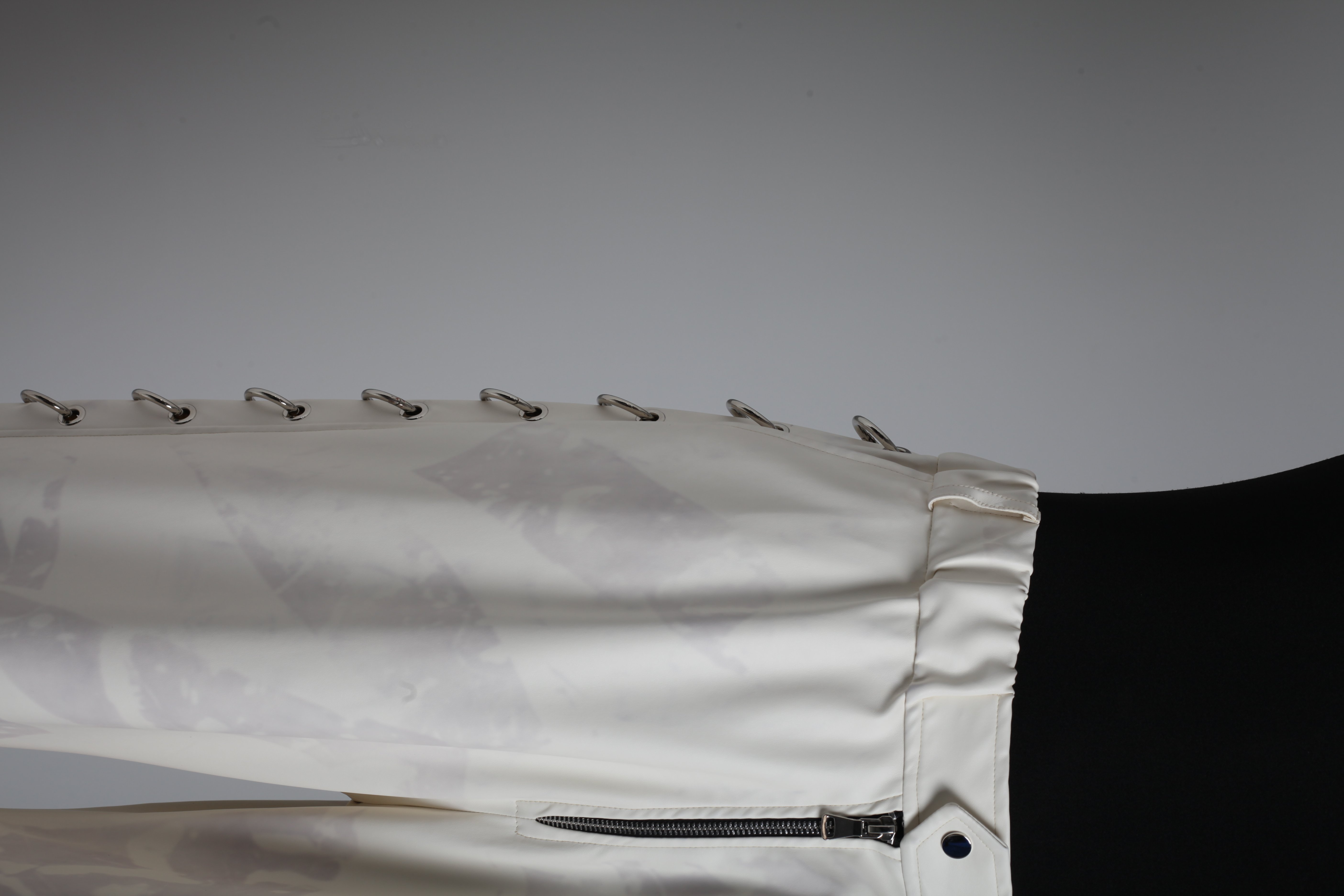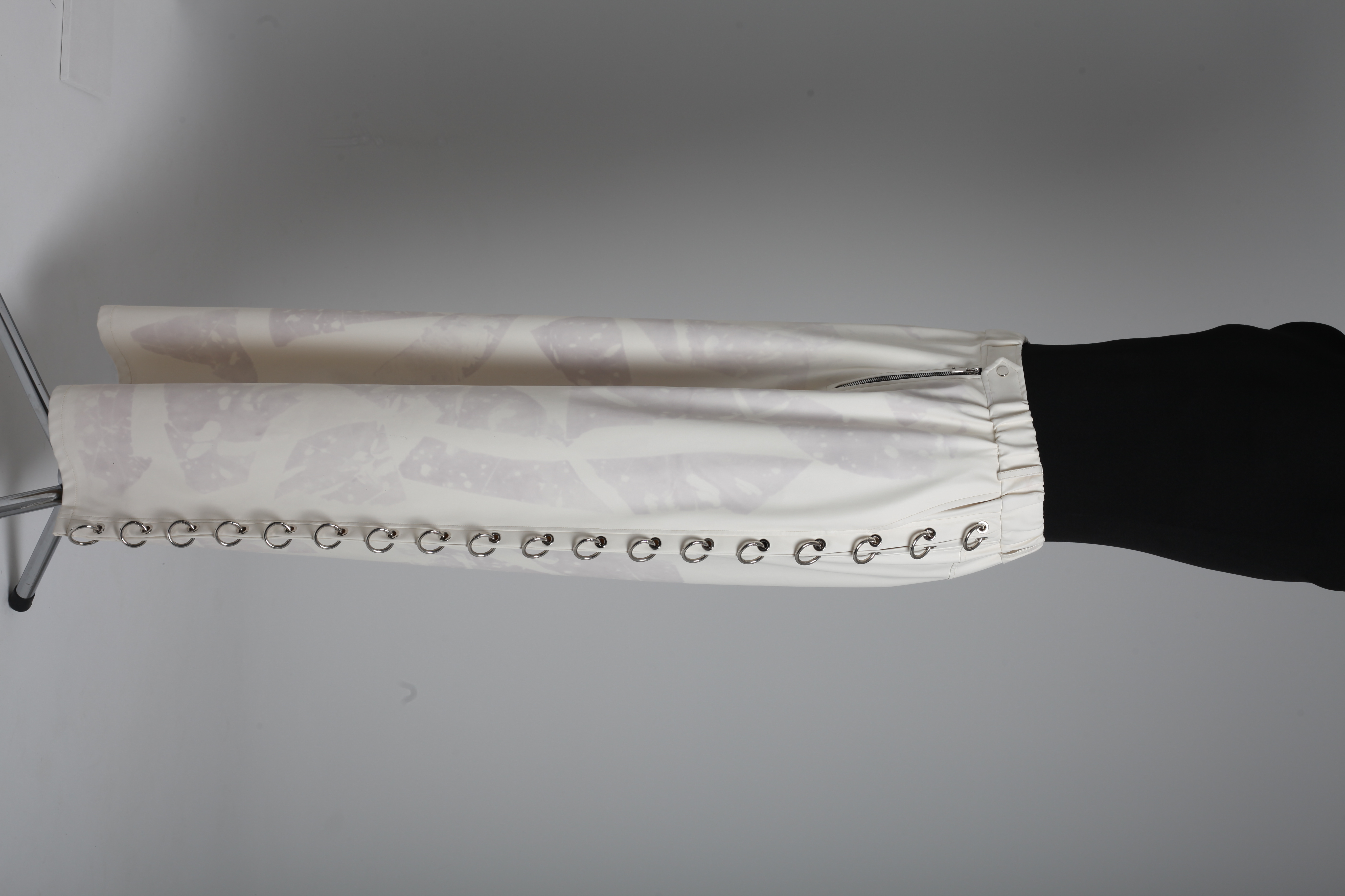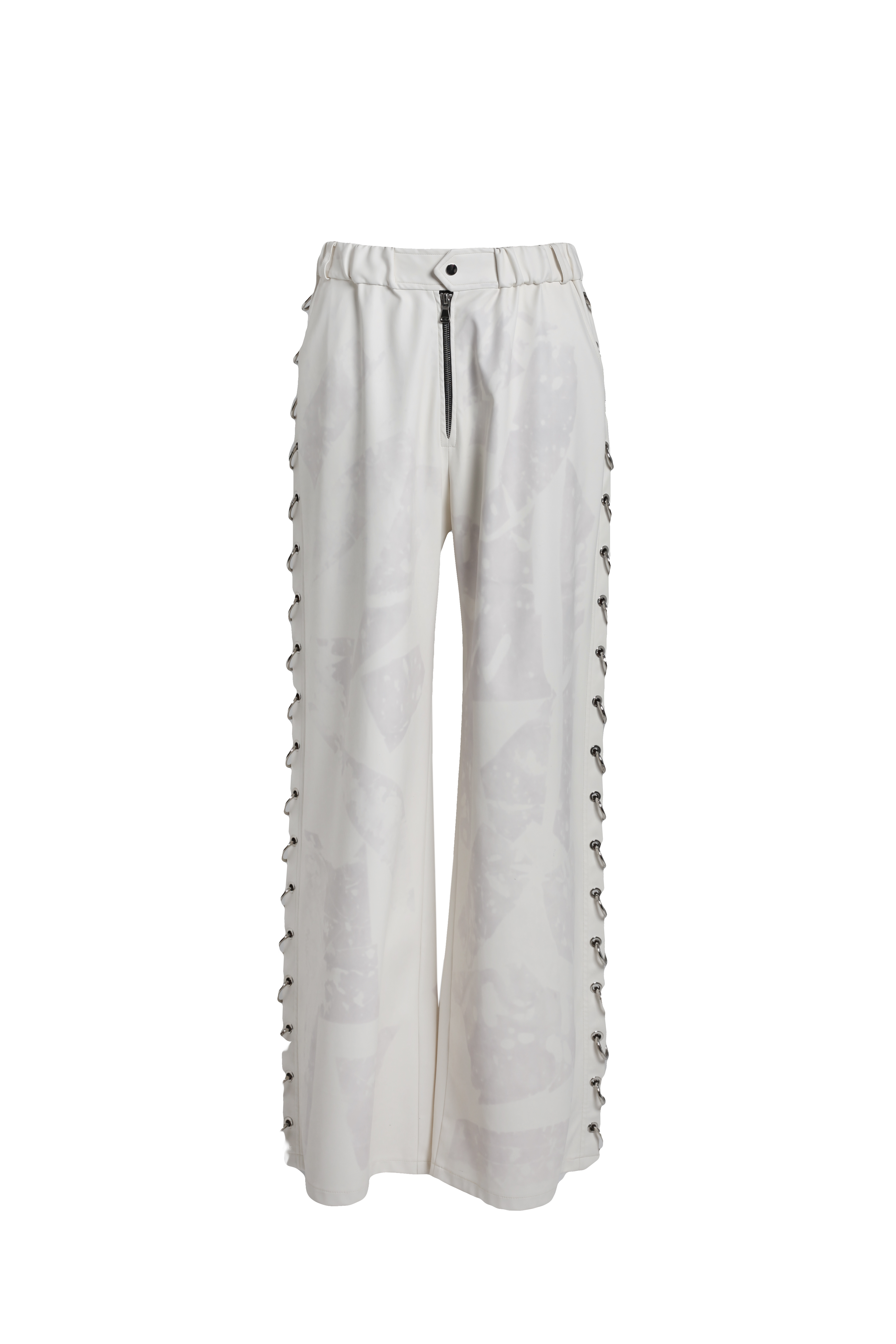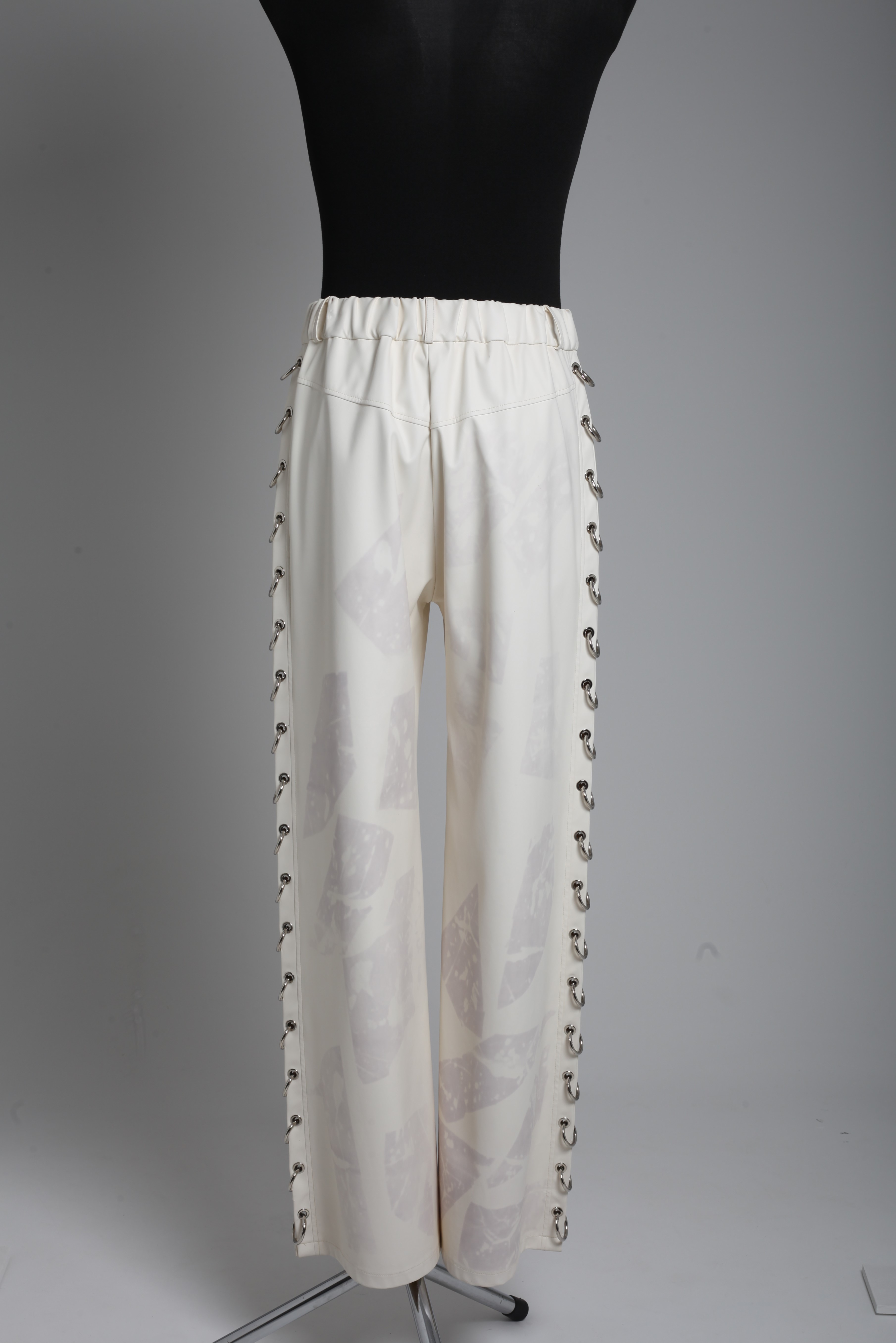 Брюки белые из эко-кожи с декором из круглых карабинов по бокам