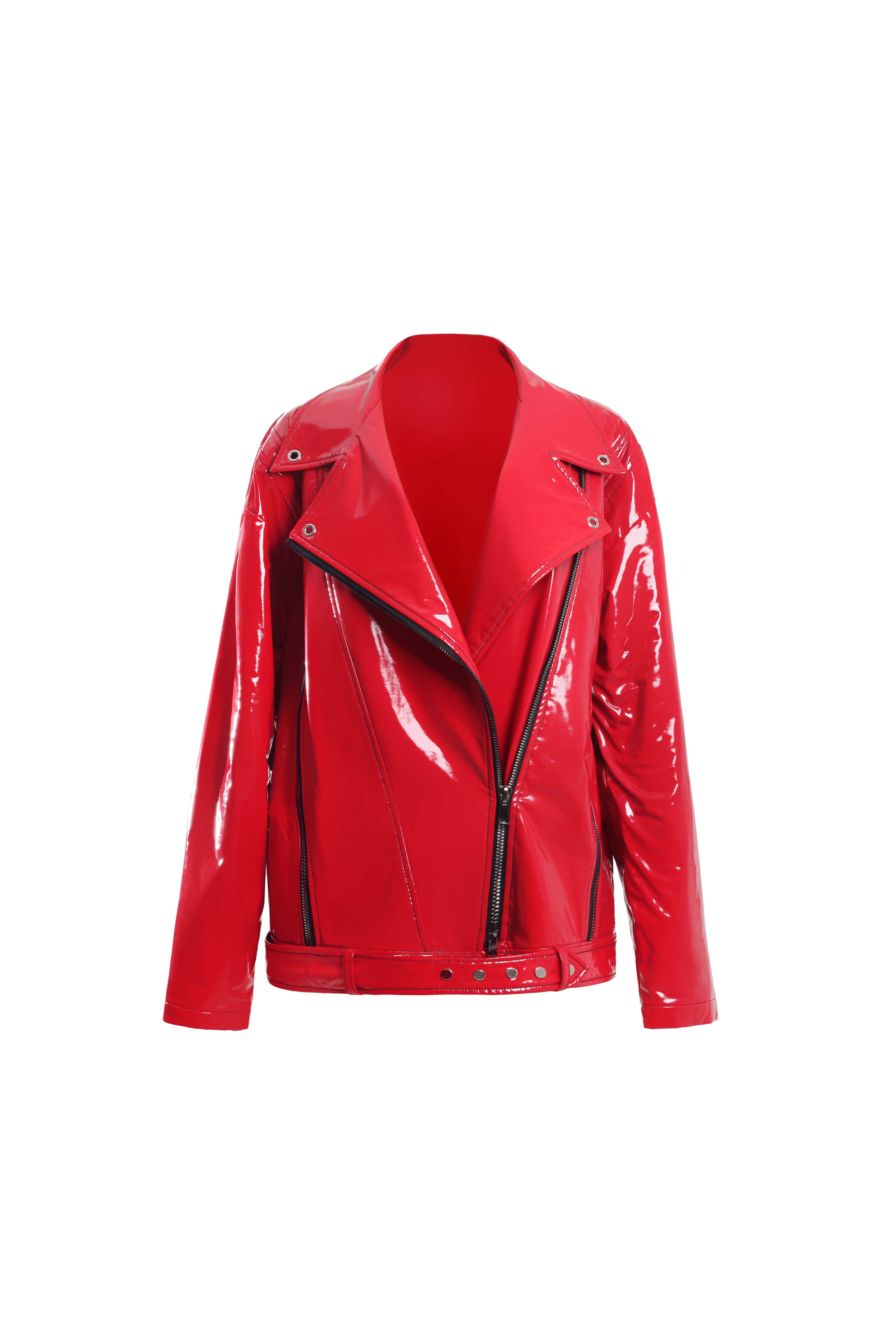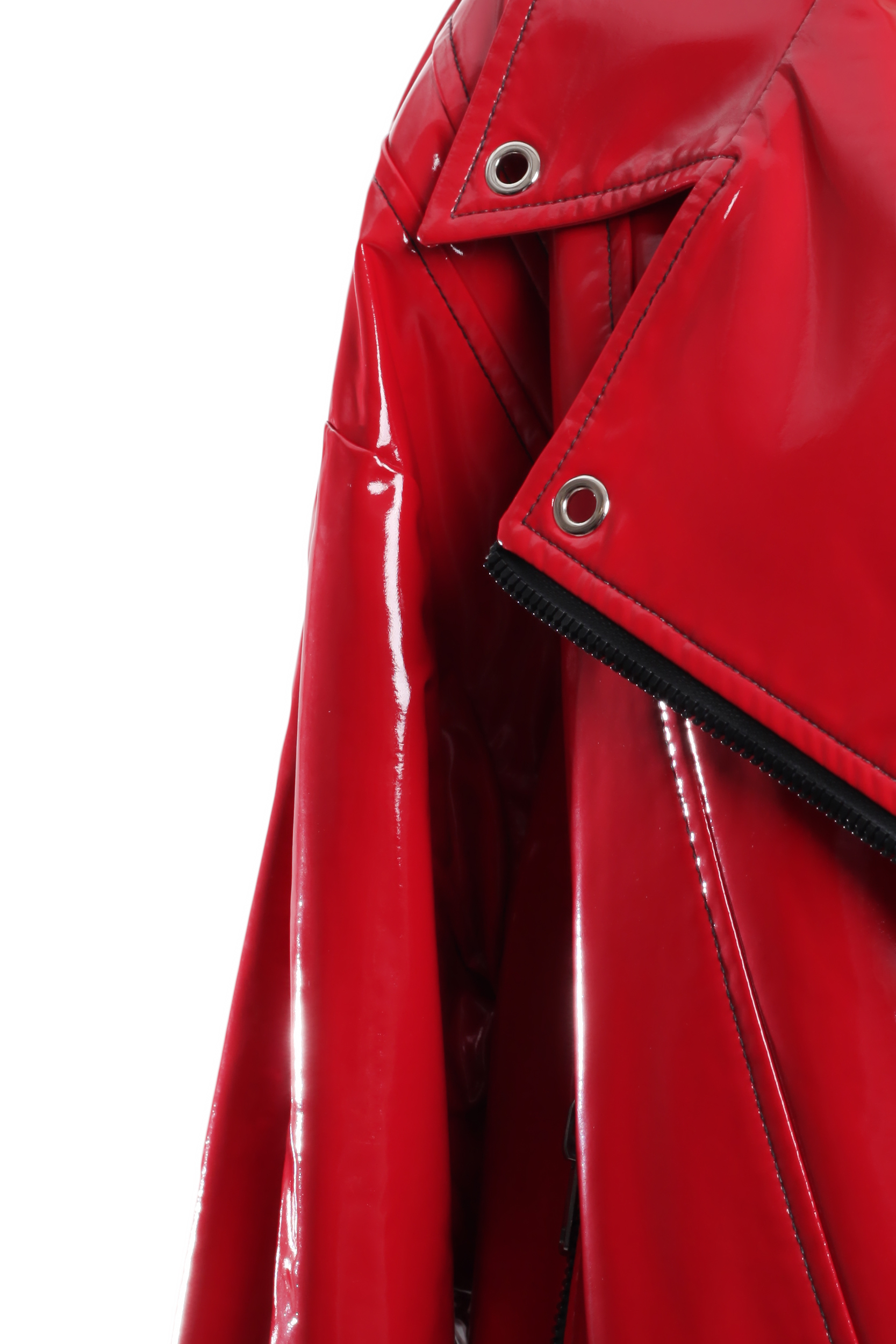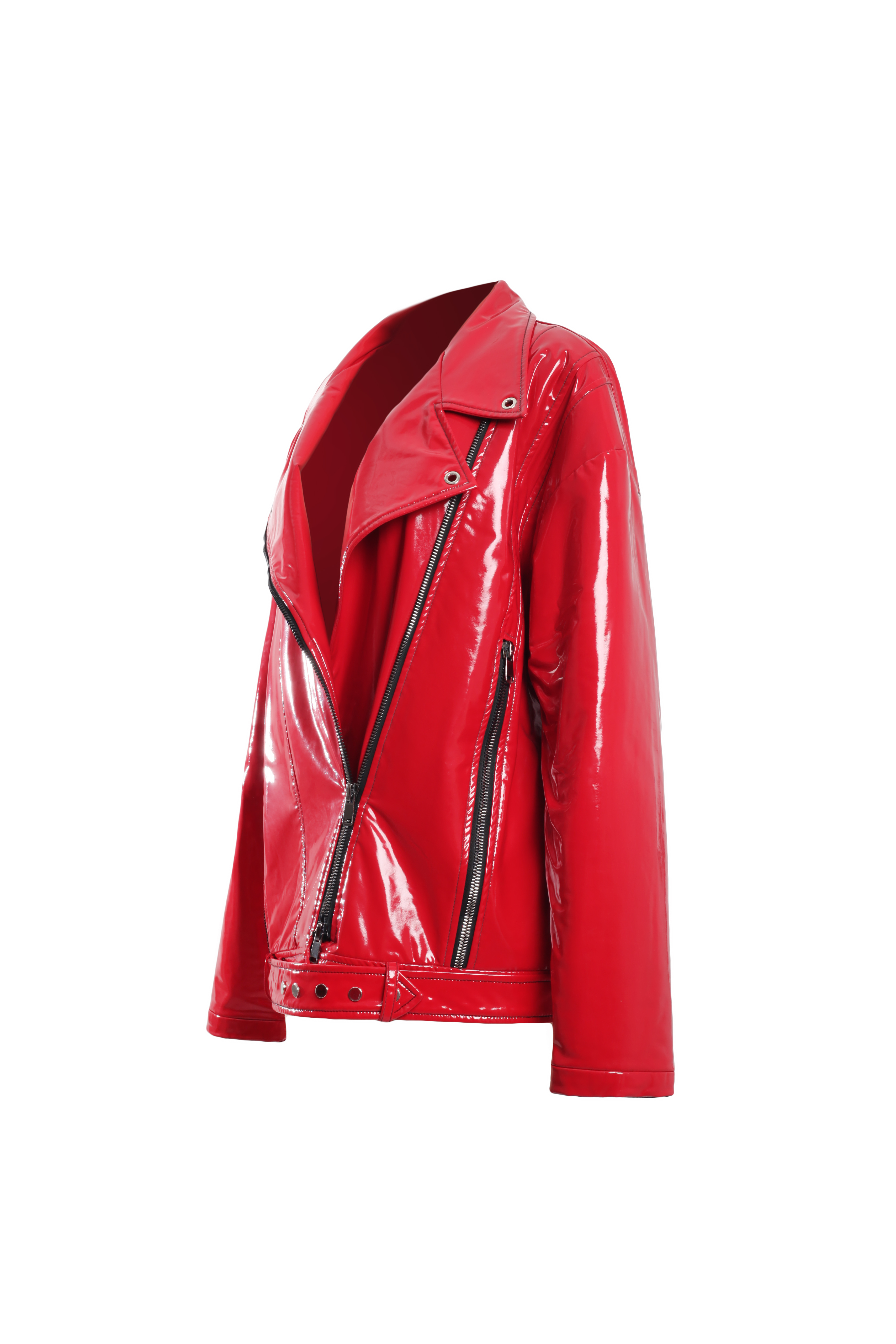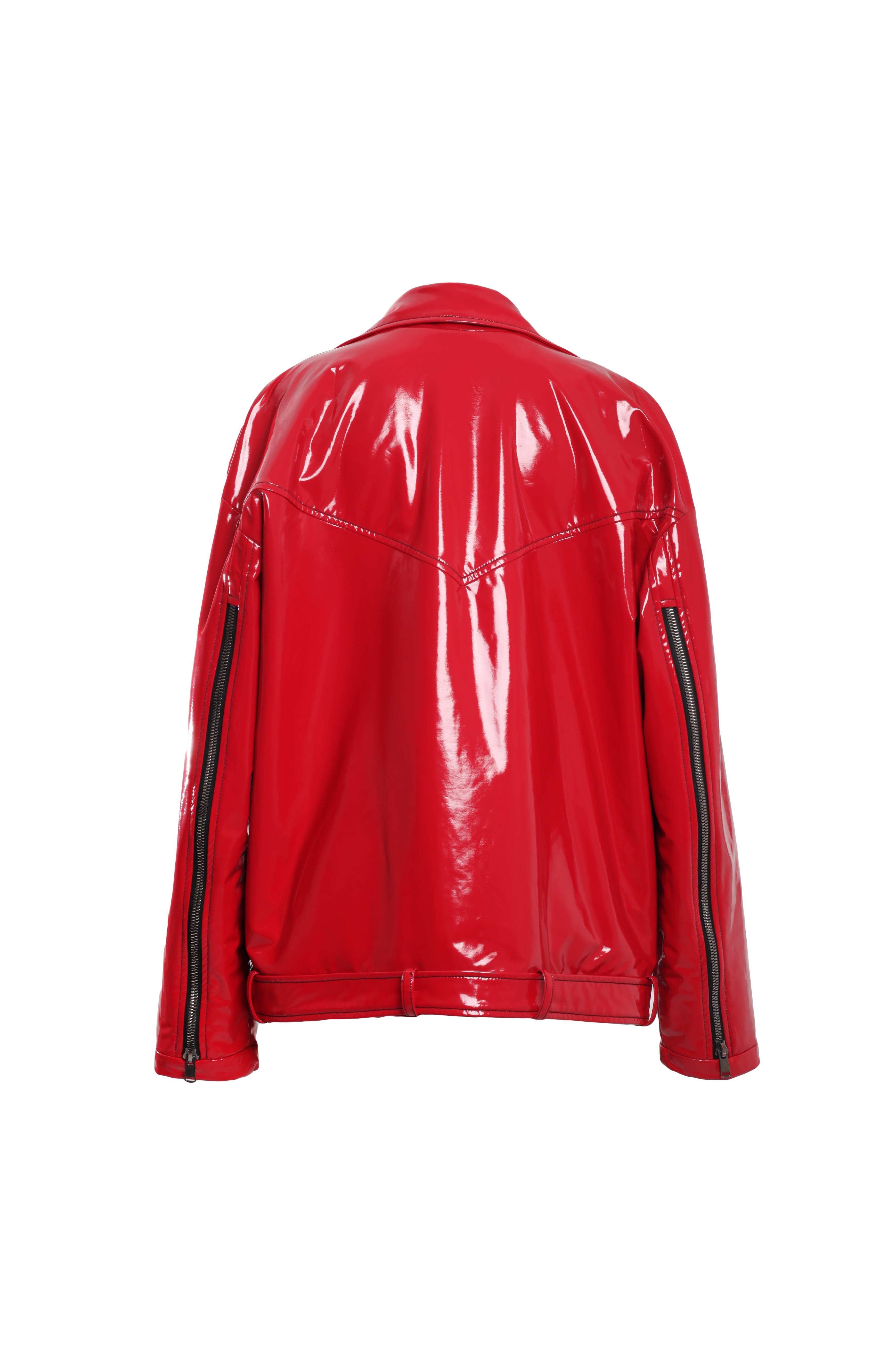 Лаковая косуха красного цвета в стиле оверсайз. Застегивается на массивные молнии.