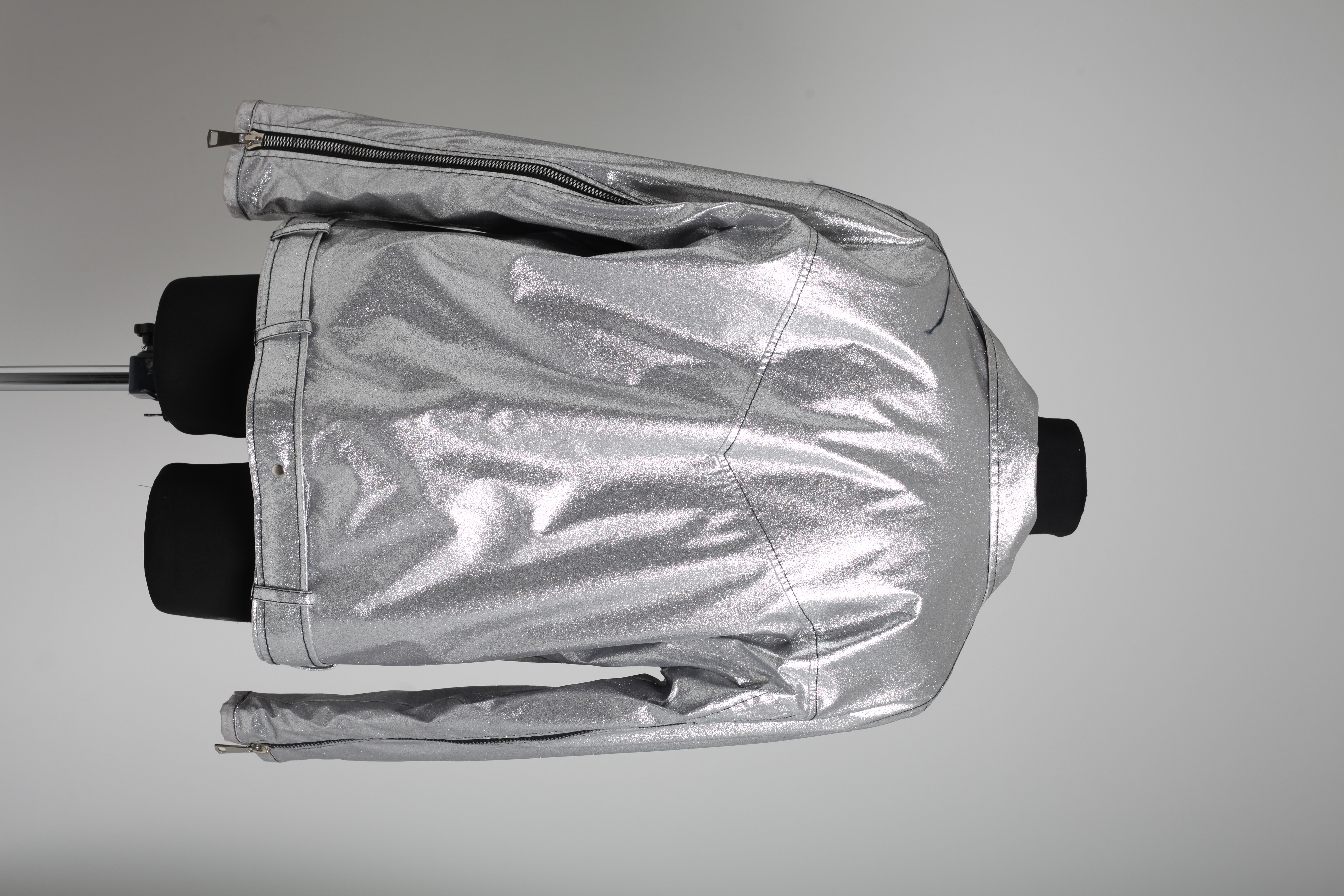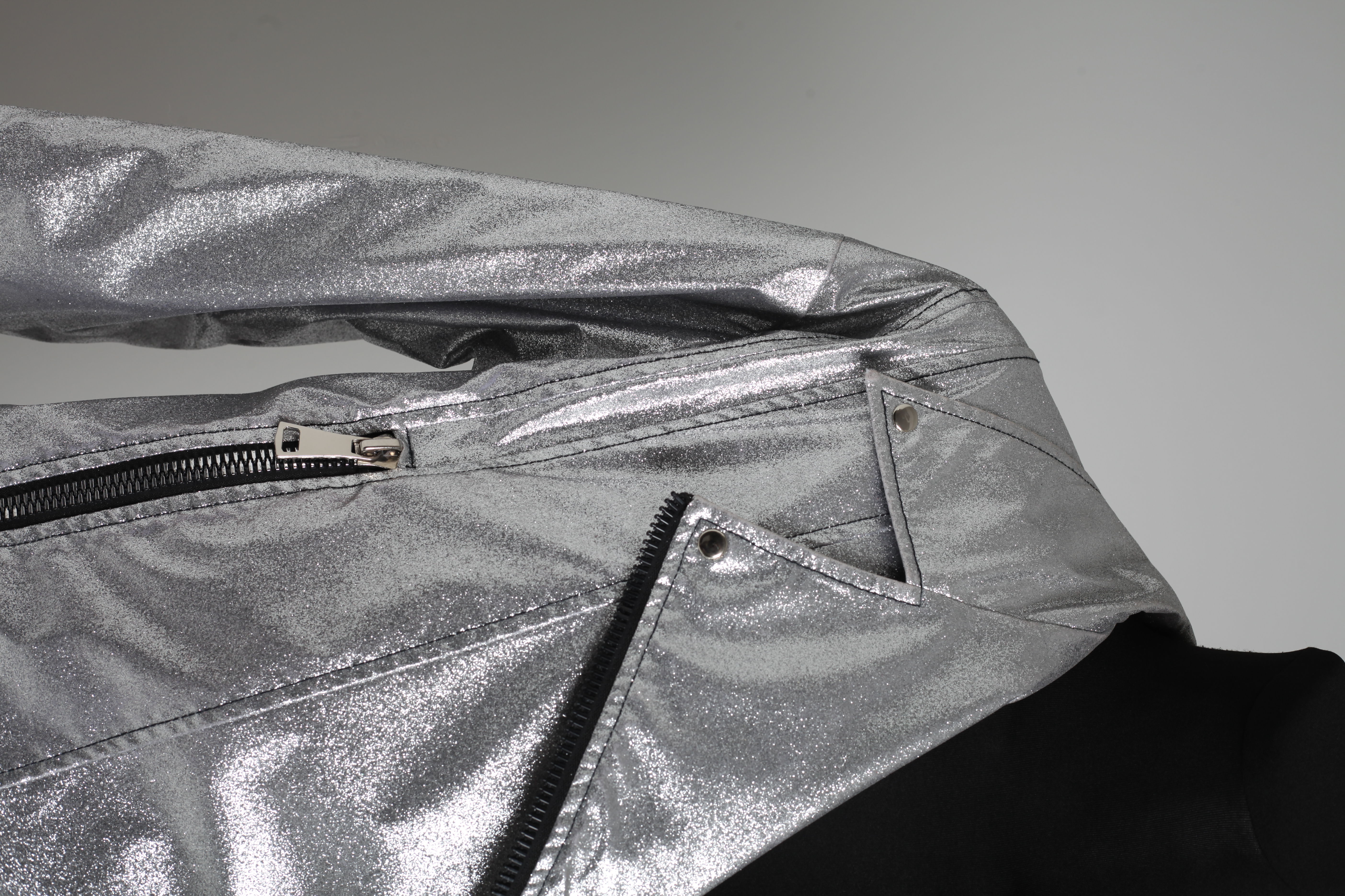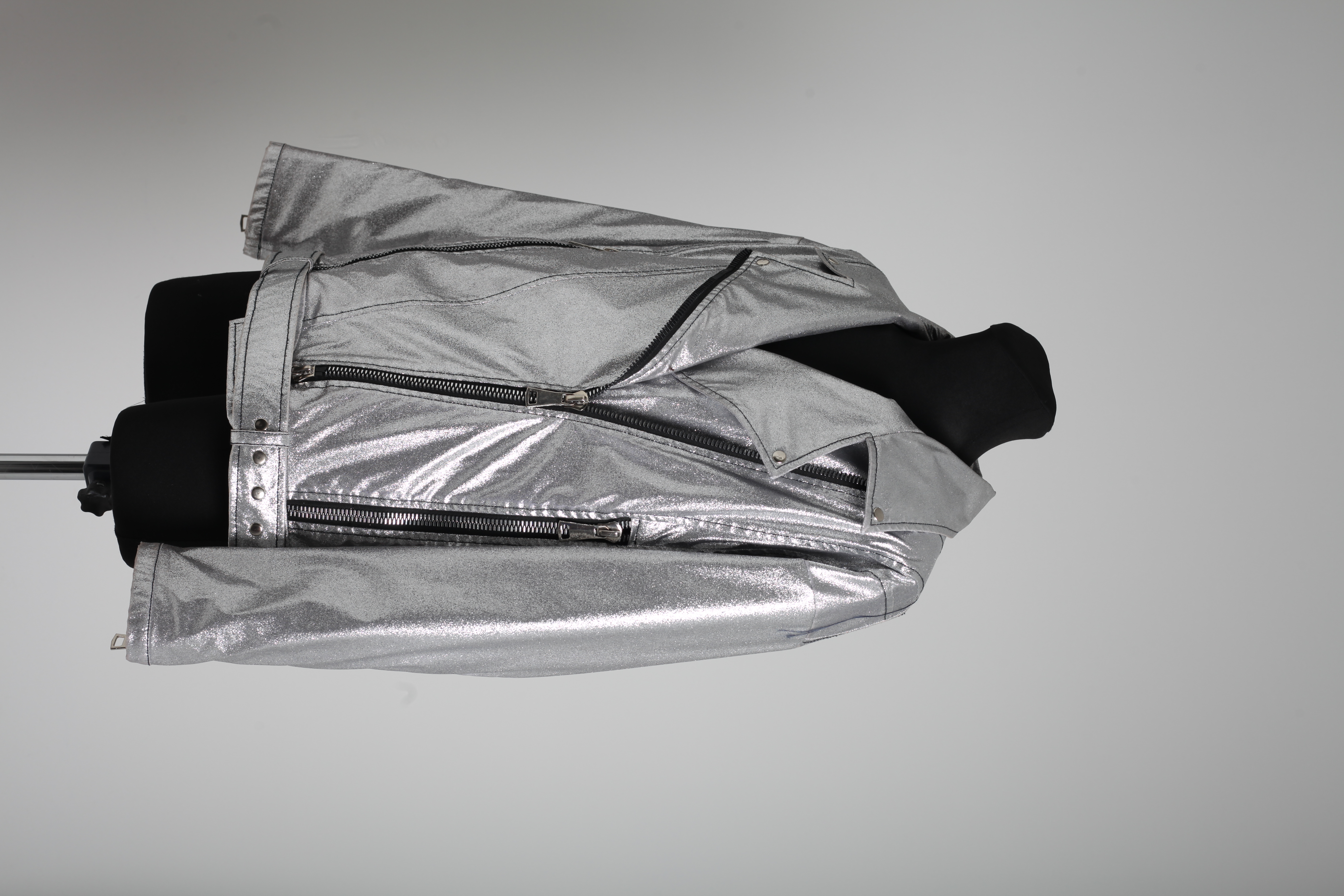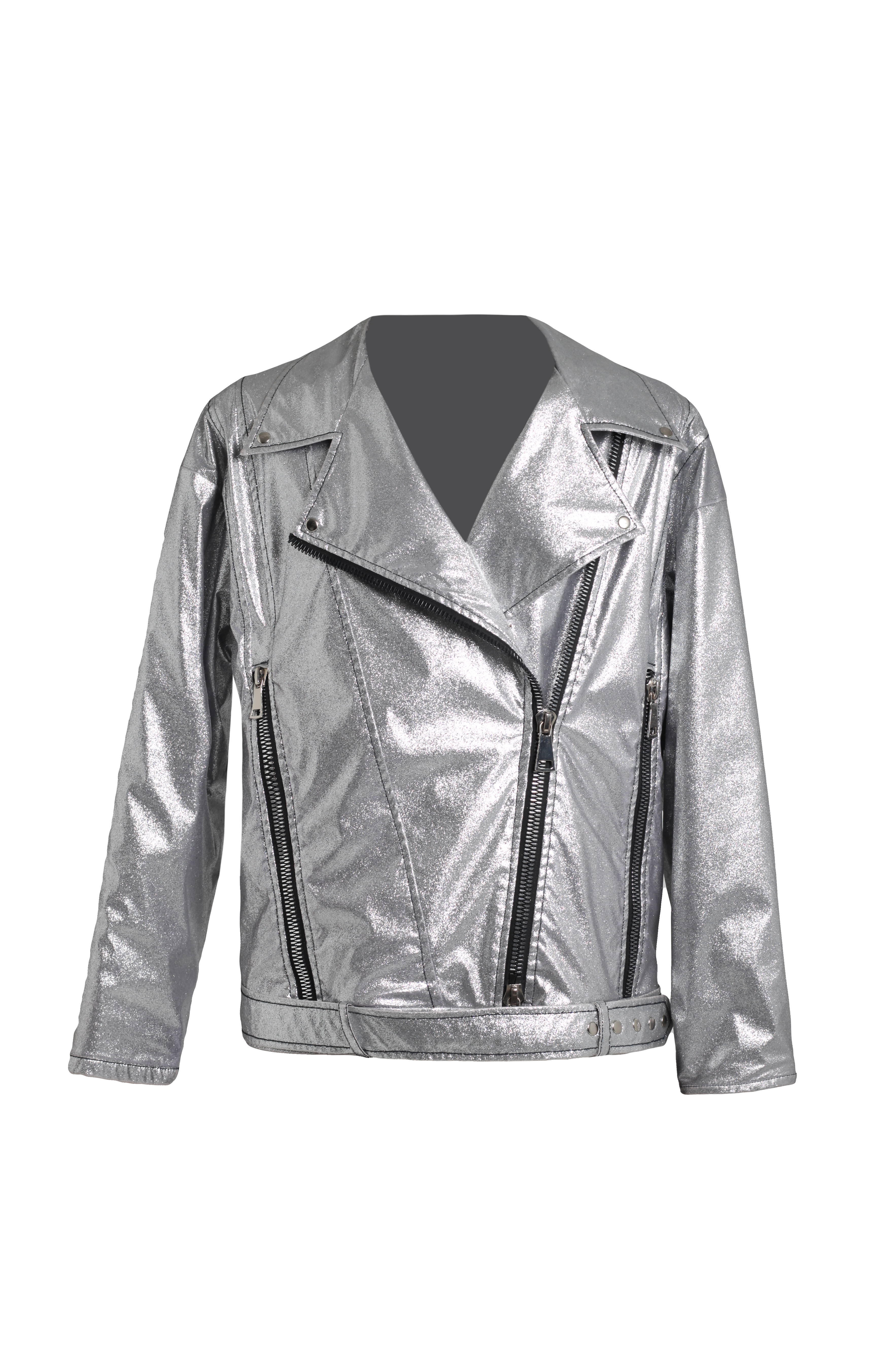 Блестящая косуха в стиле оверсайз из серебряного глиттера. Застегивается на массивные молнии.