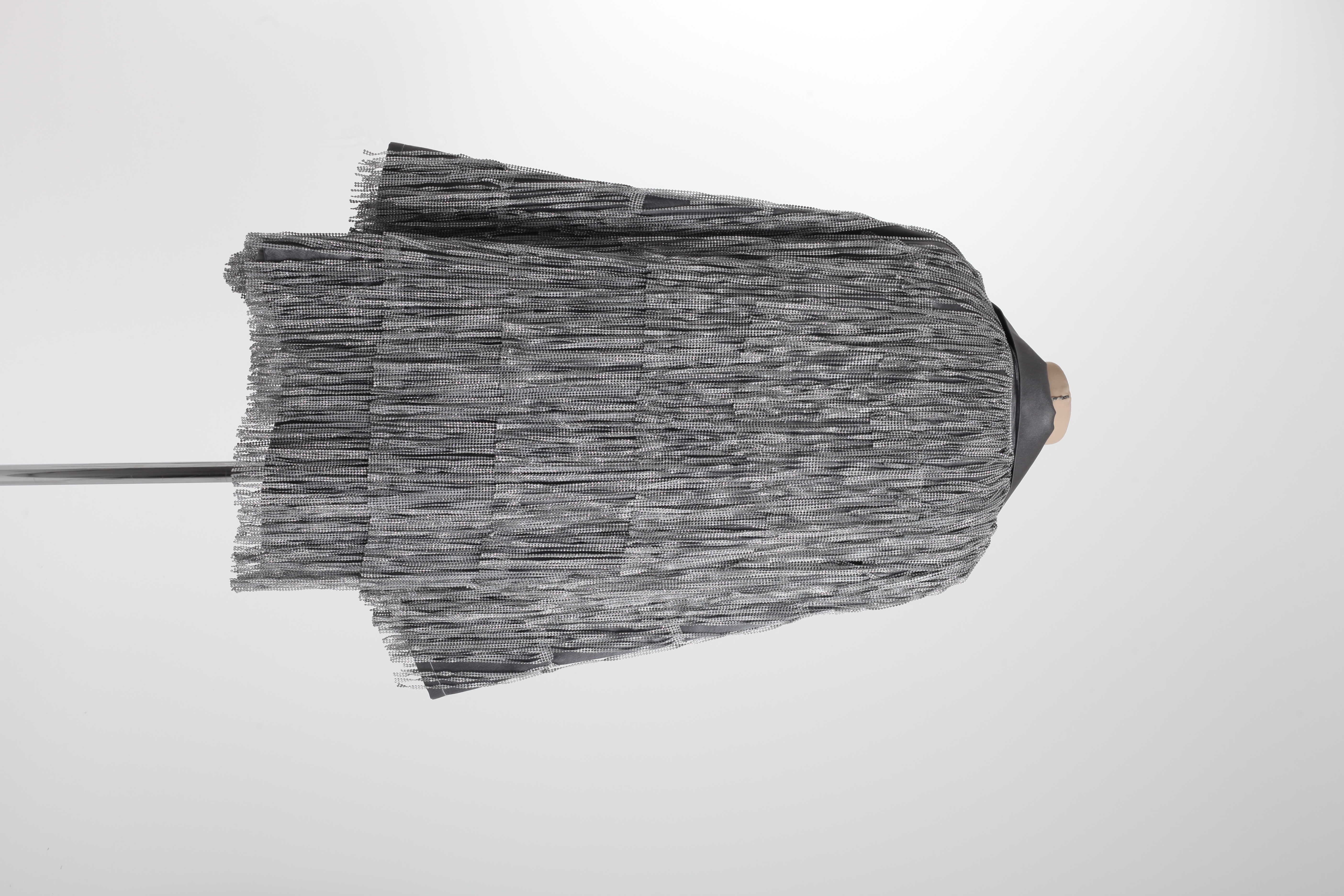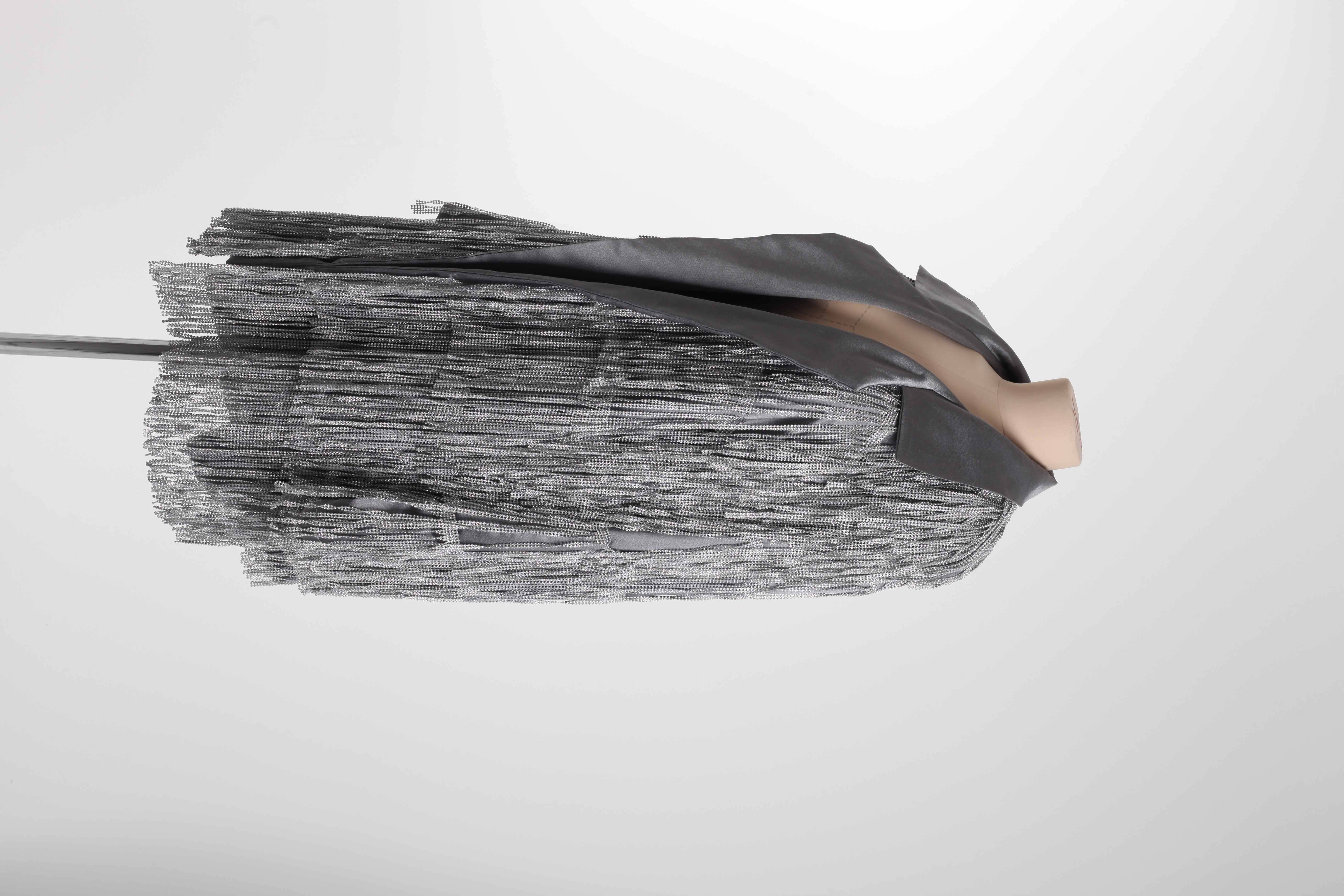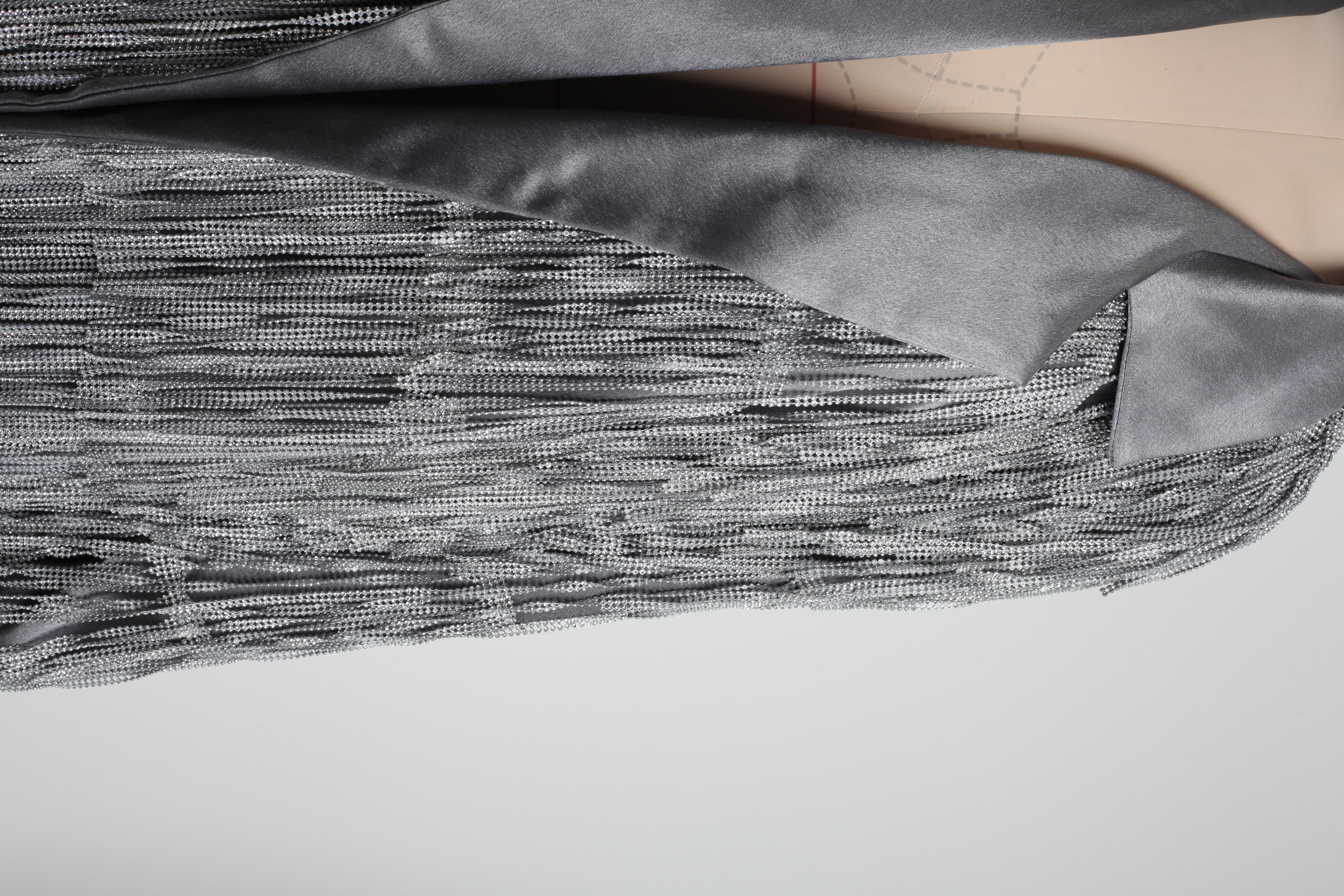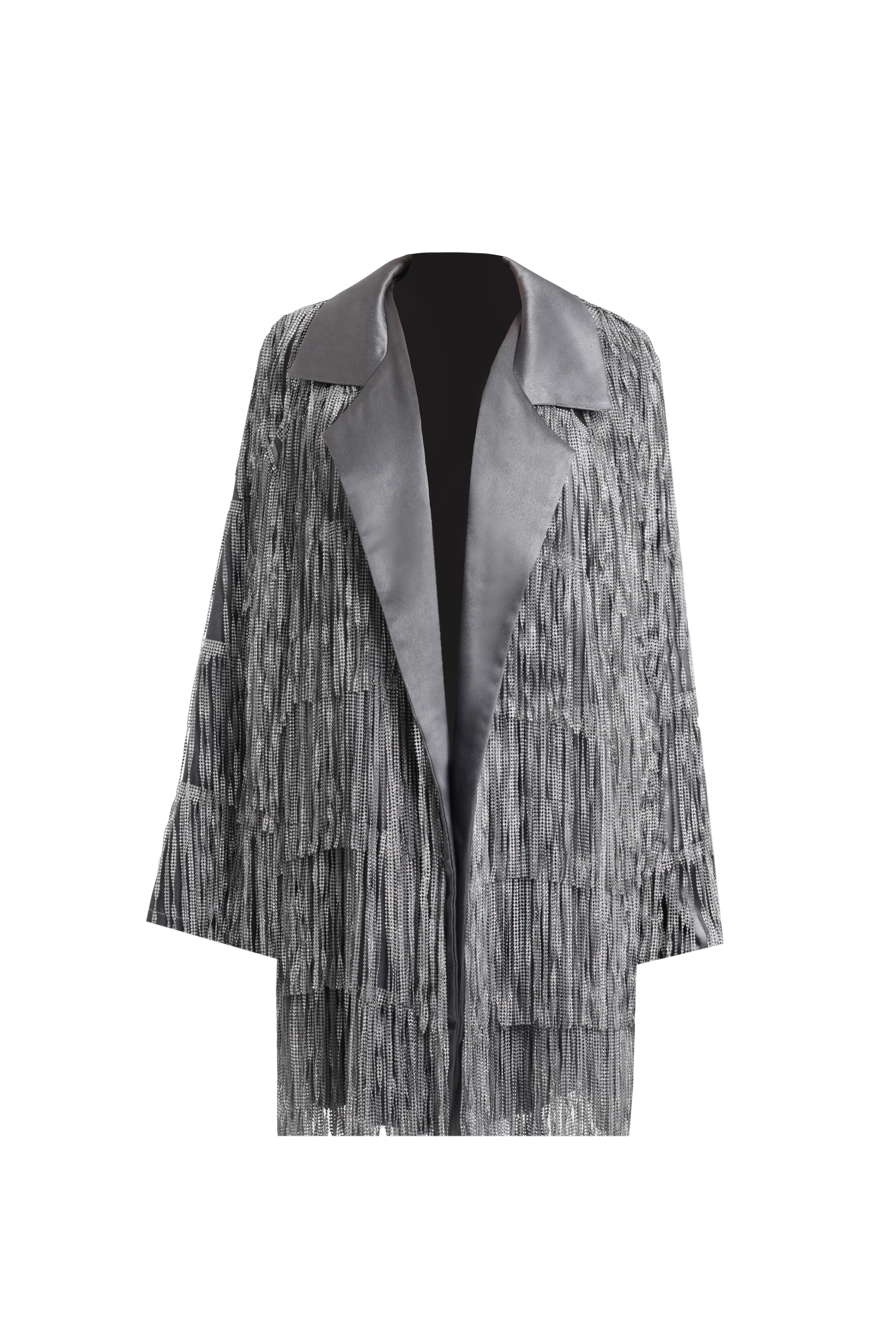 Жакет выполнен на атласной основе с бахромой из серебрянных страз