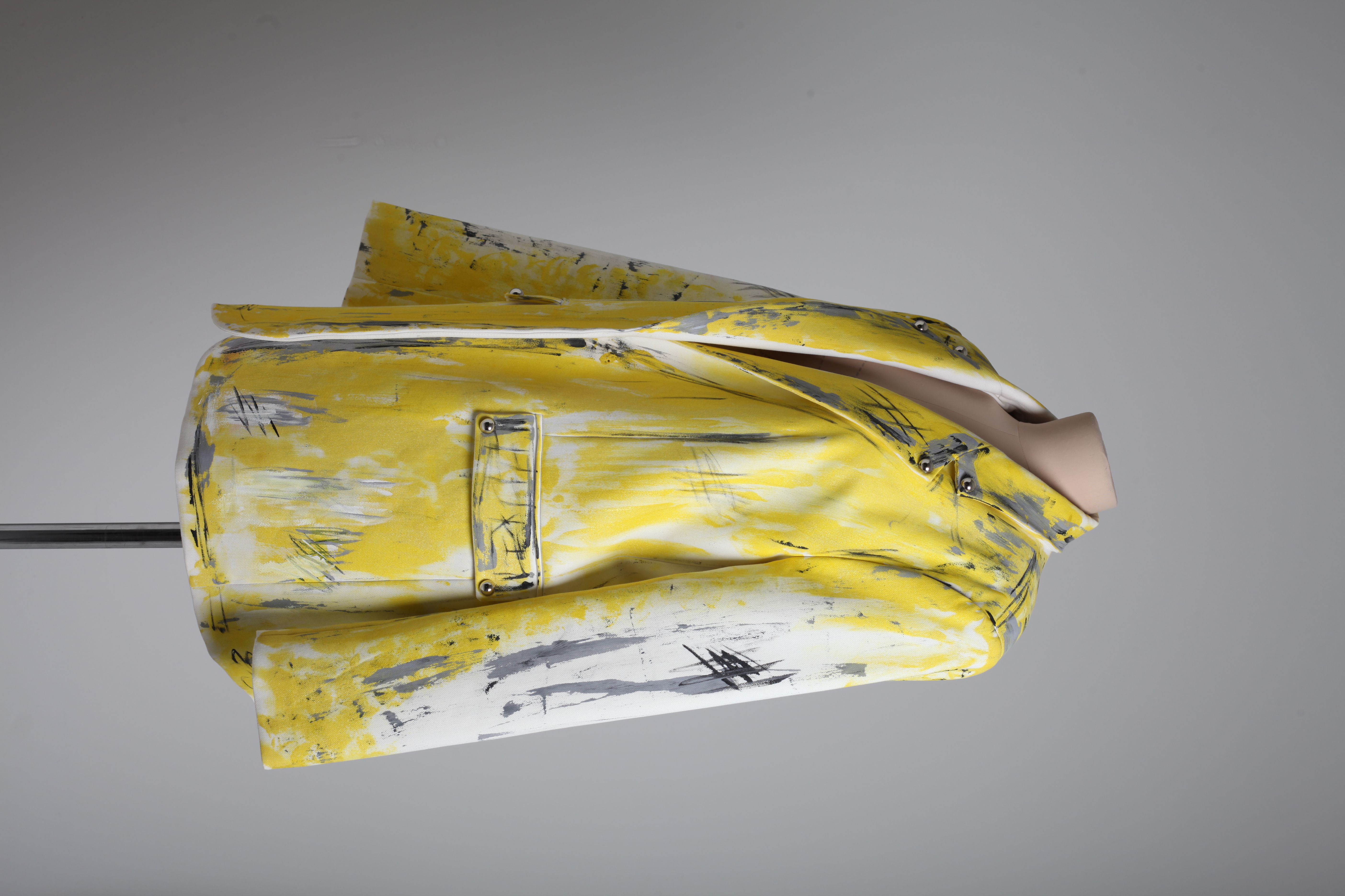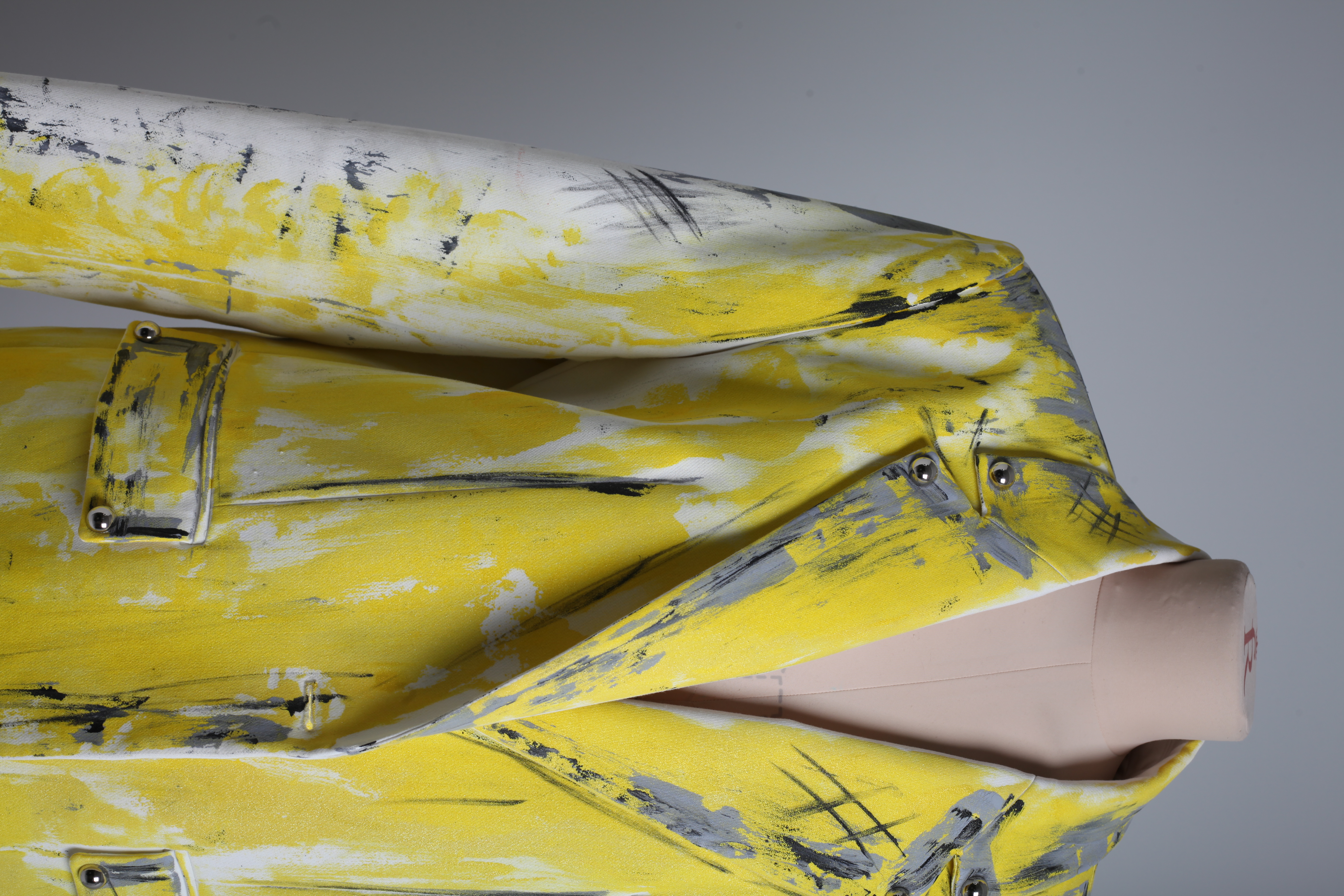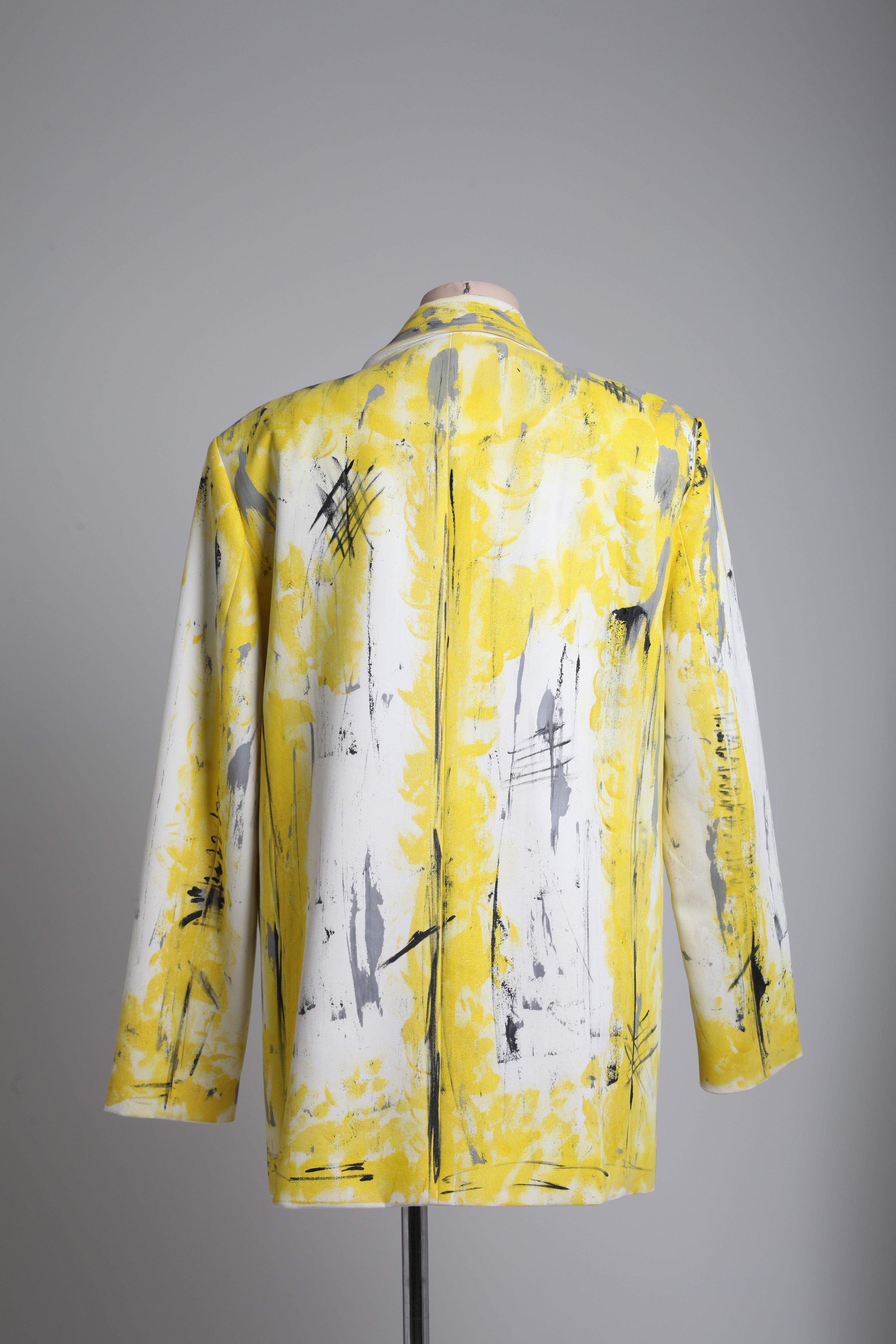 Пиджак желтый из костюмной ткани с ручной росписью серого цвета