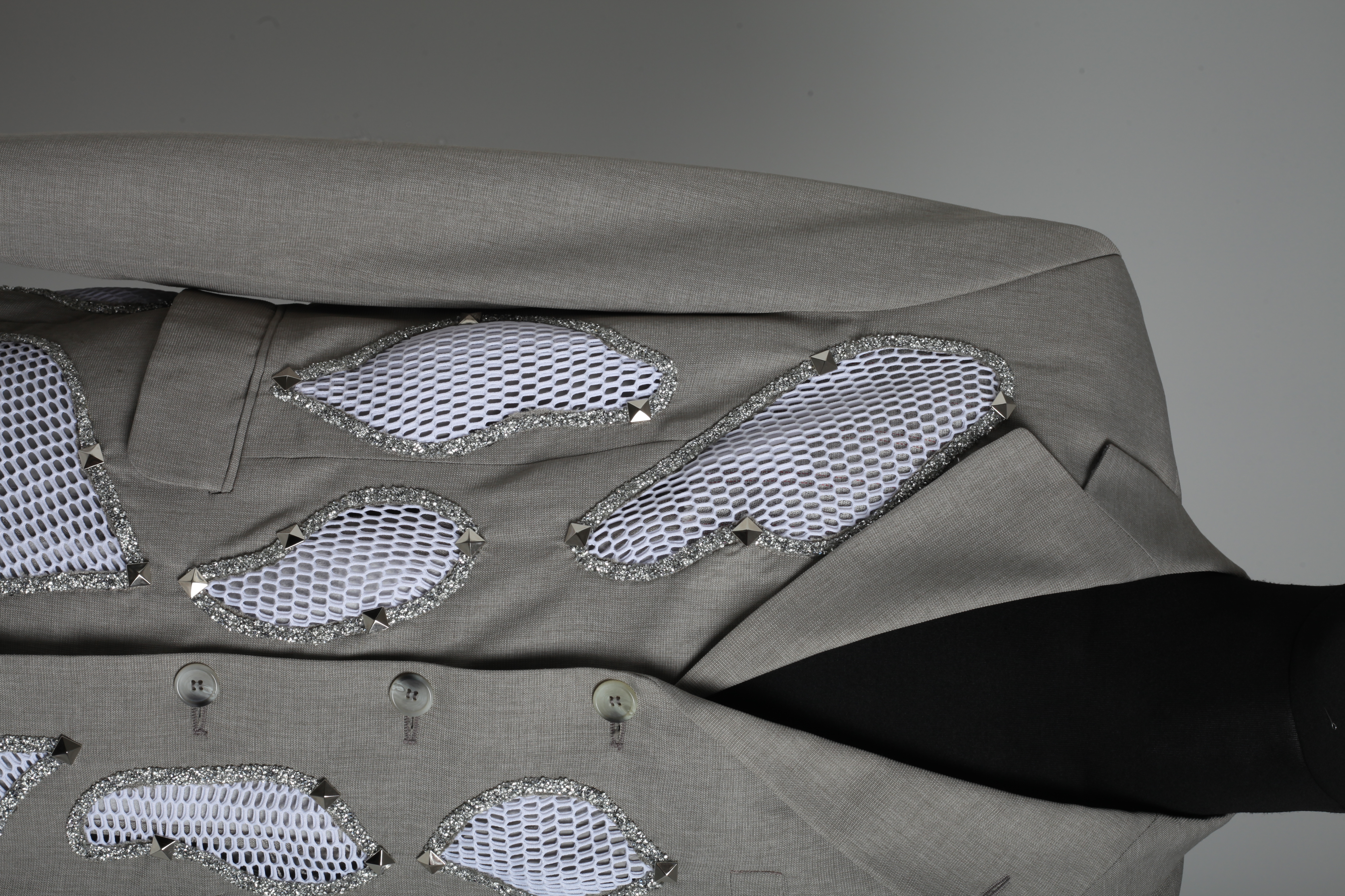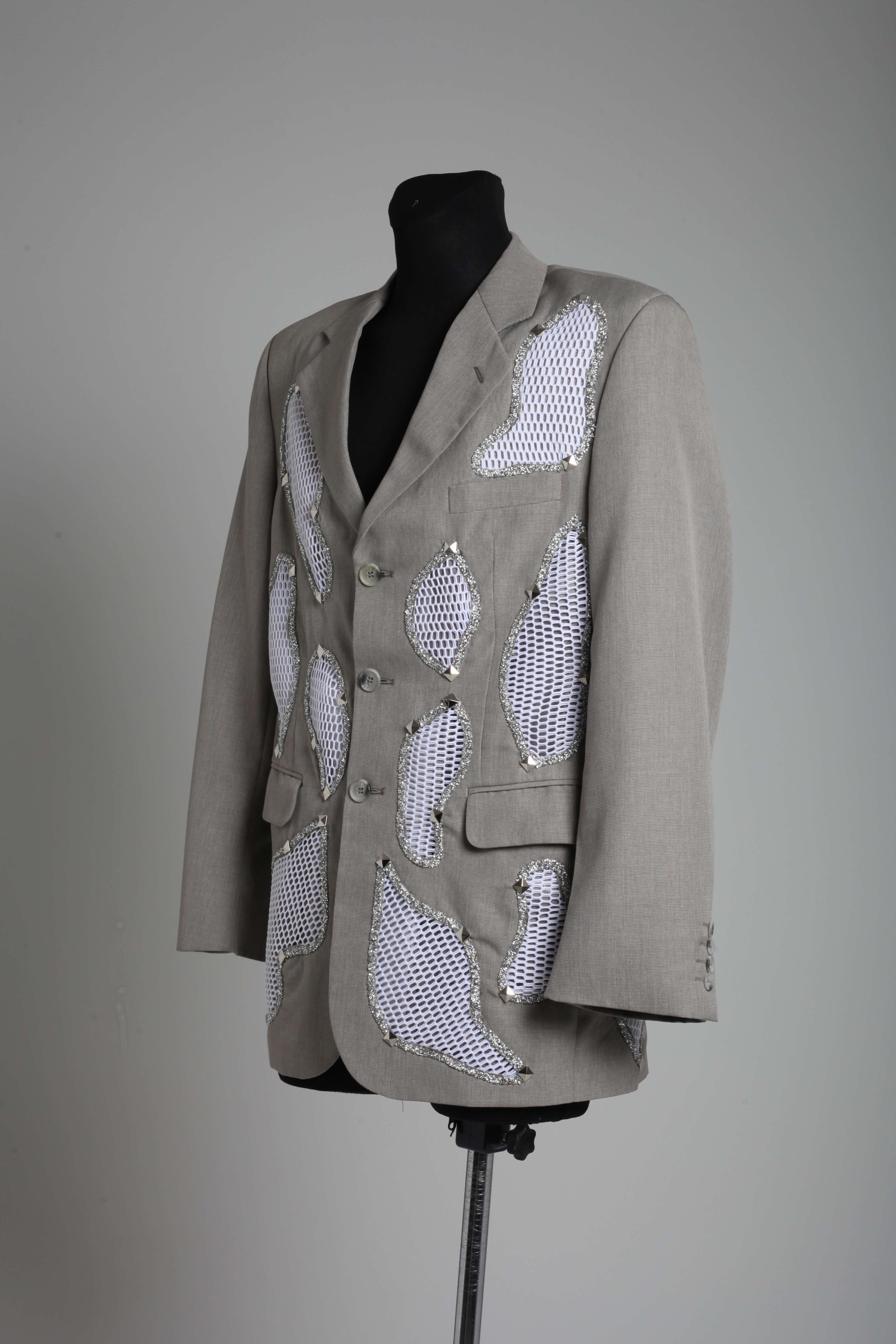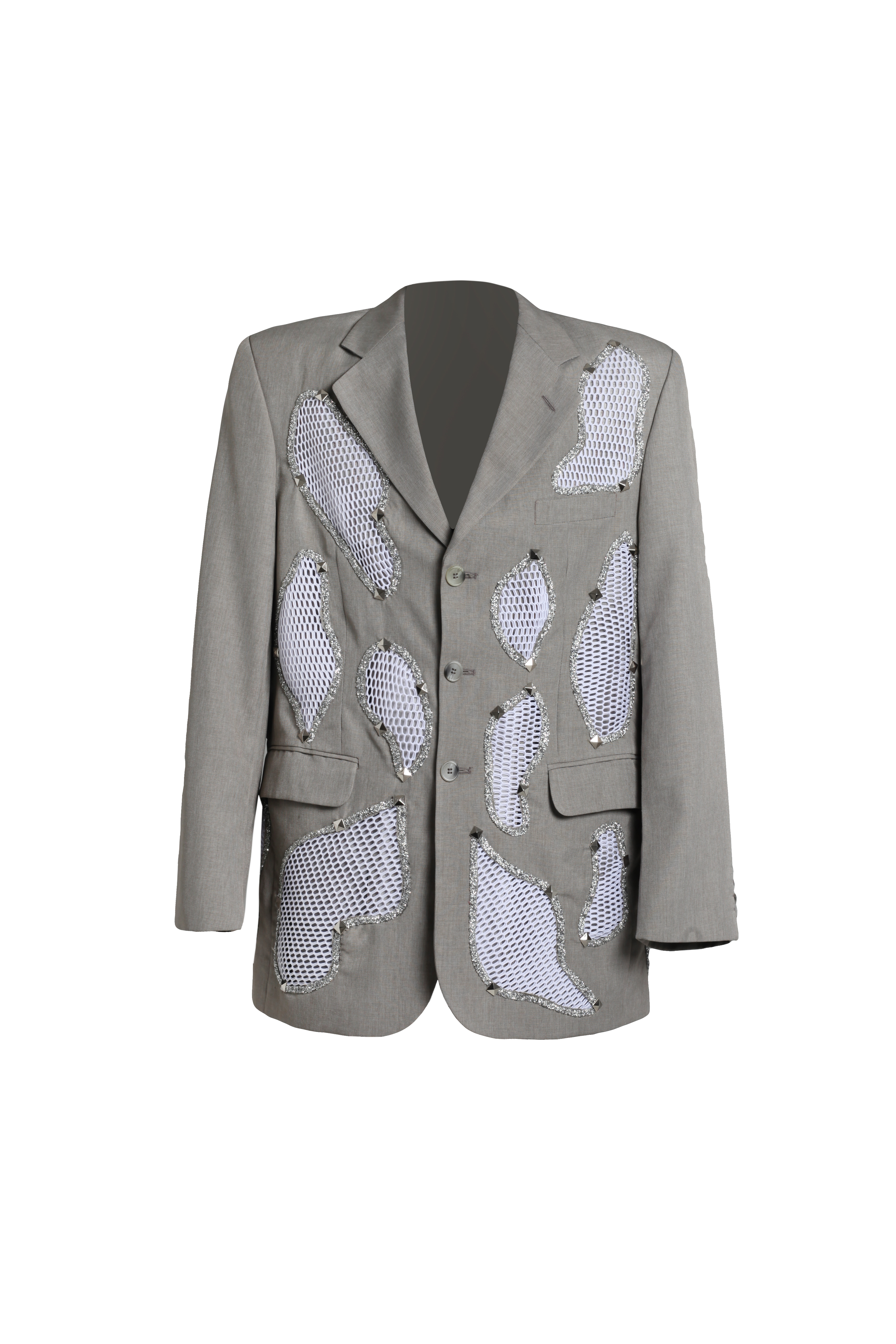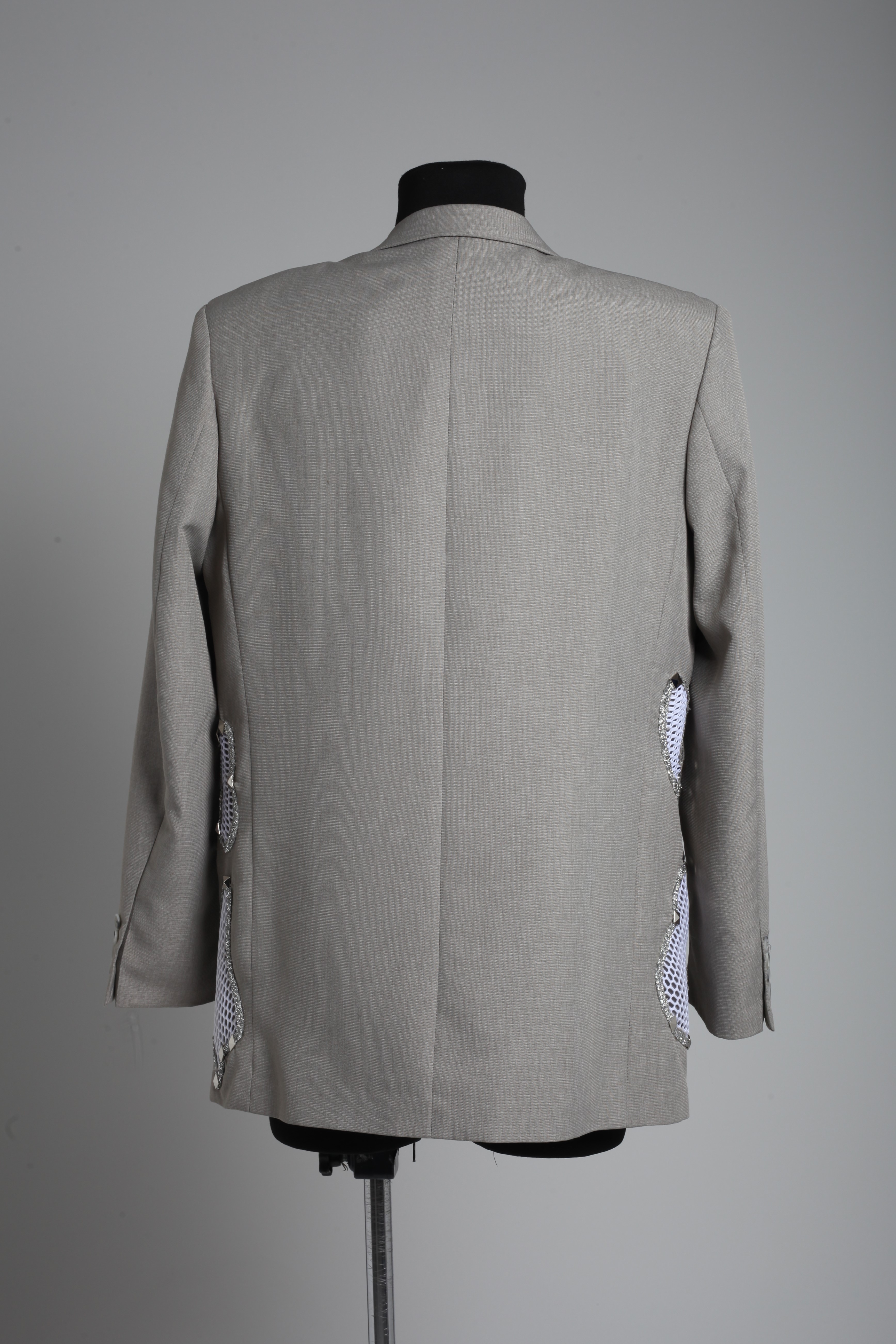 Пиджак бежево-серый из костюмной ткани со вставками из белой сетки
