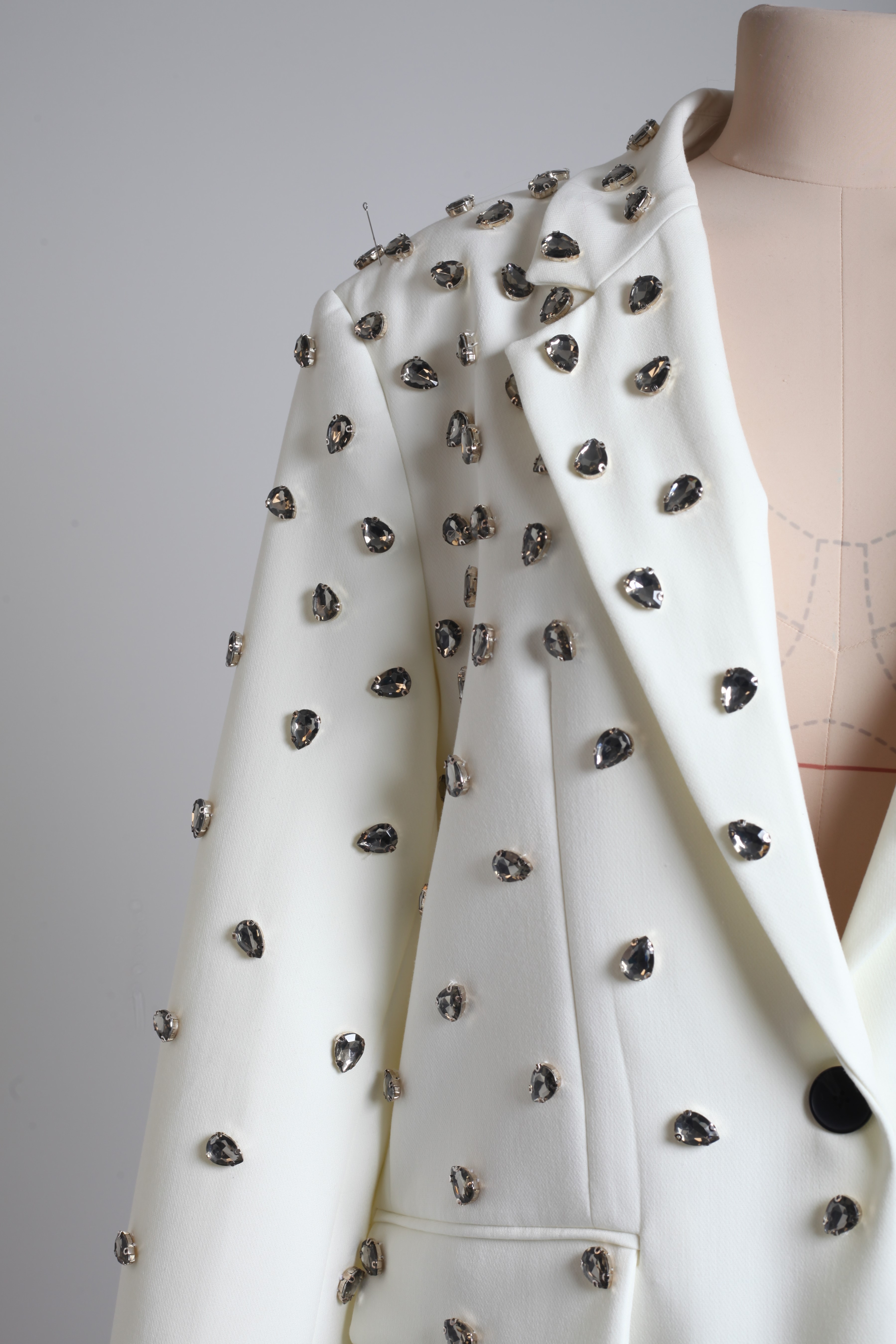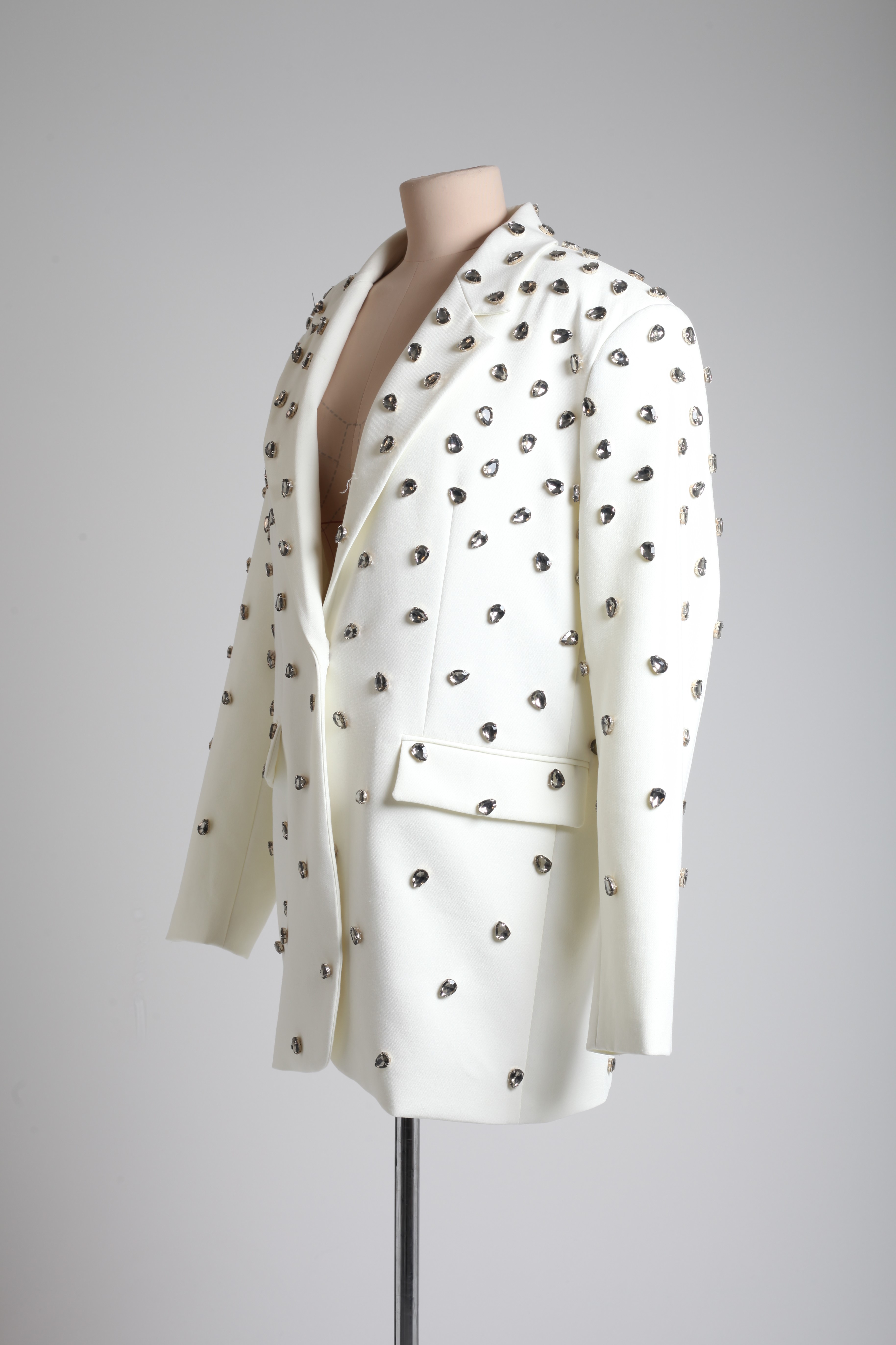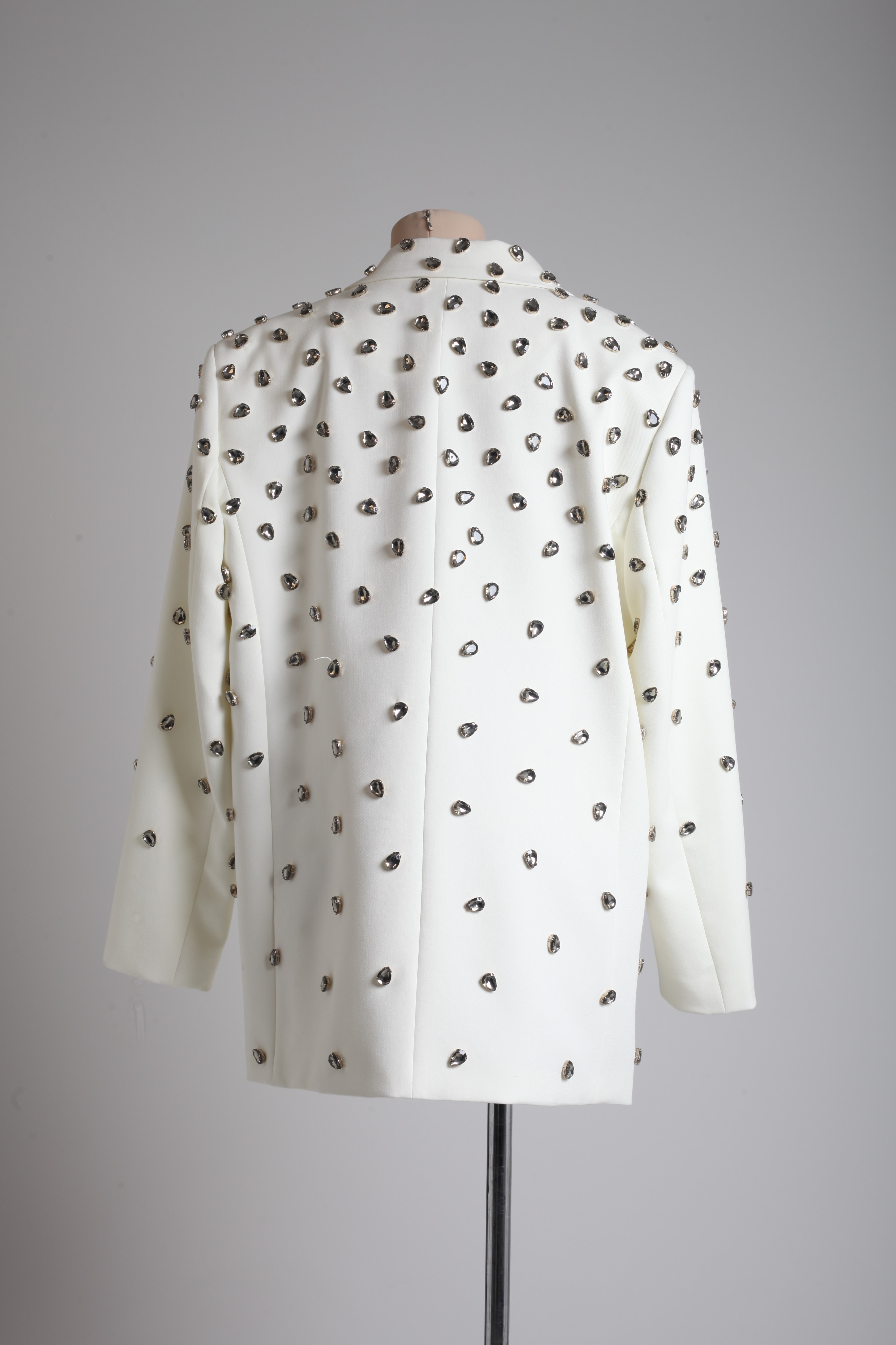 Пиджак молочный из костюмной ткани с декором из камней-страз